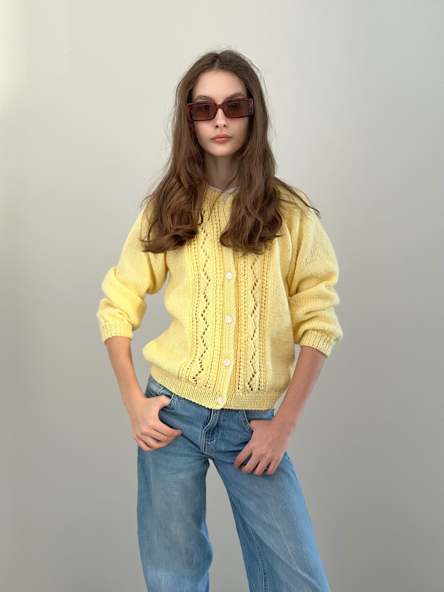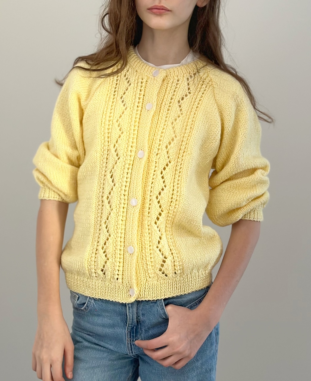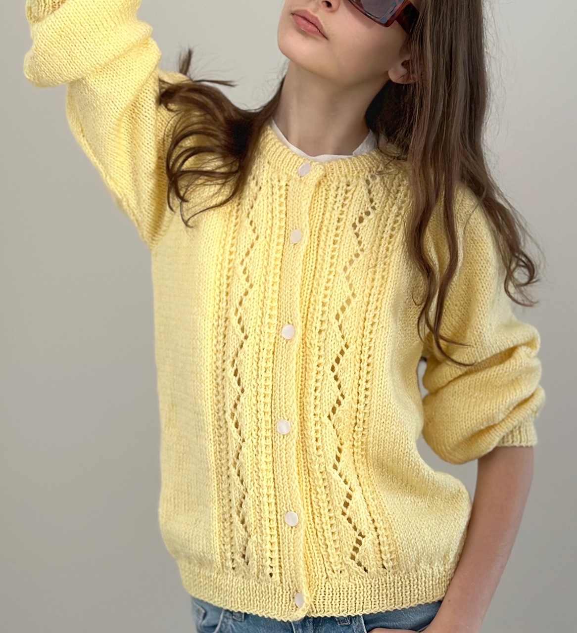 Cudowny kardigan Lilly w kolorze ciepłego odcienia żółtego koloru. Delikatny , kobiecy, z modnym ażurowym motywem z przodu. Zapinany na guziczki, ale nie musisz go zapinać. Kardigan ma rękawy , które z założenia maja być lekko ściągnięte i noszone jako 3/4 , ale w zależności od długości ręki mogą sięgać do nadgarstka. Włóczka z której powstał sweter to połączenie wełny z dodatkiem akrylu (70% pure lana wool) .To propozycja dla wszystkich, którzy cenią sobie zalety owczej wełny wzmocnionej syntetycznym włóknem akrylu, takiej która więcej wytrzyma i będzie można ją prać w pralce.