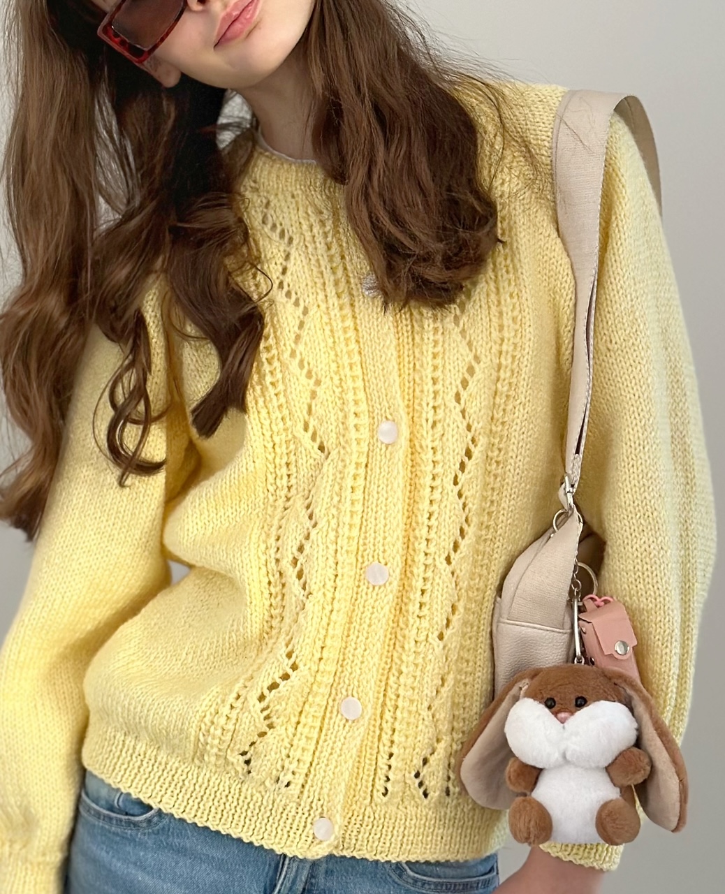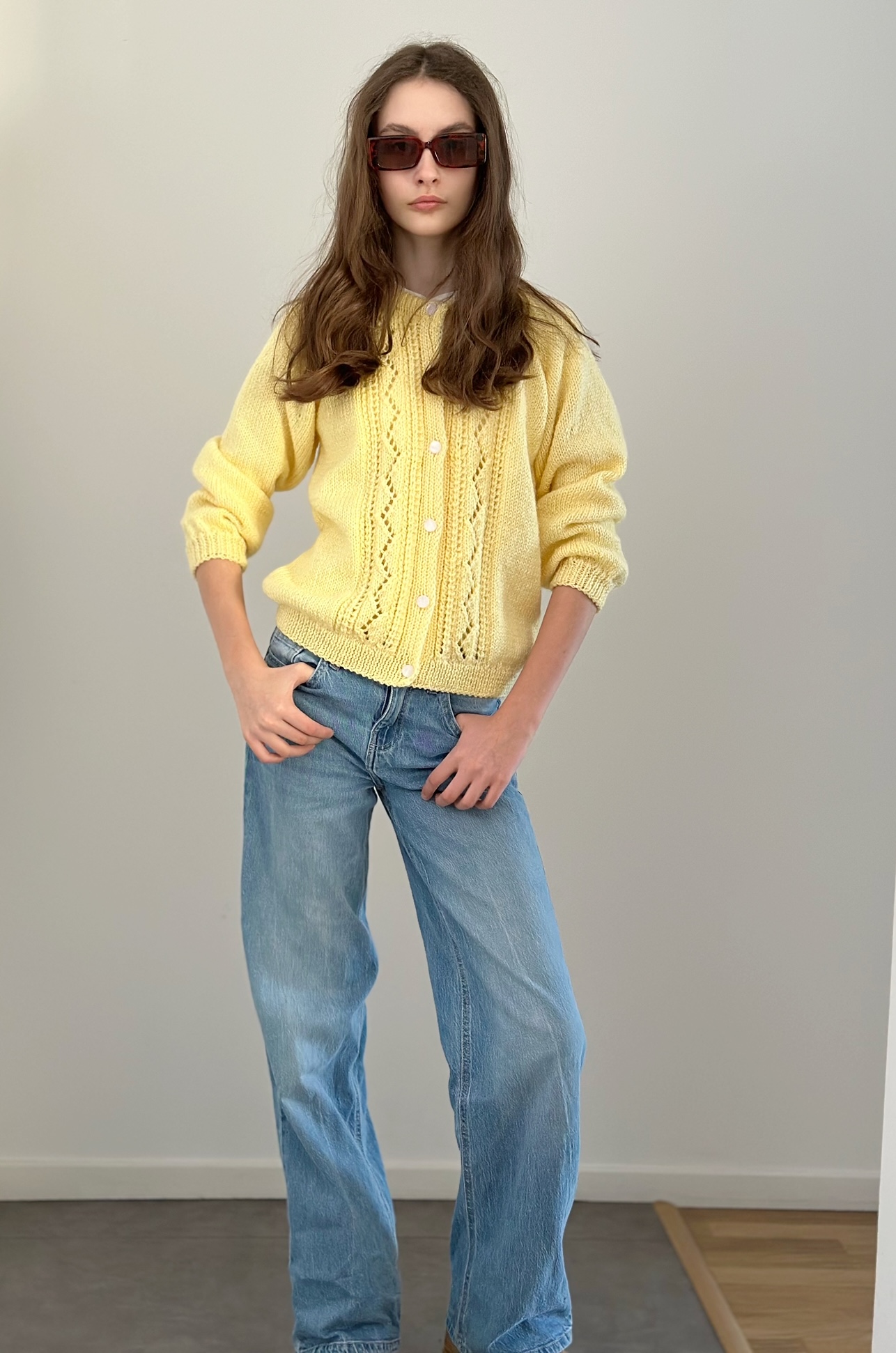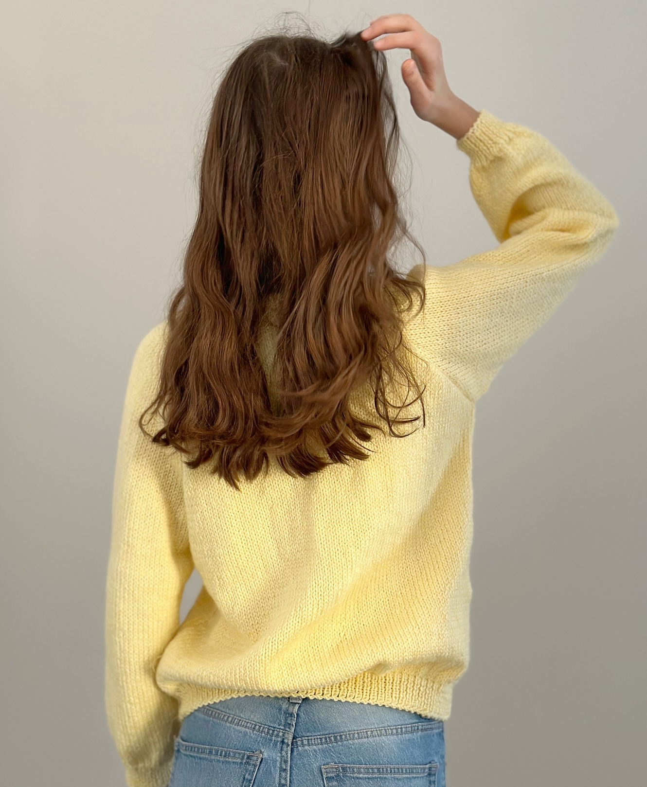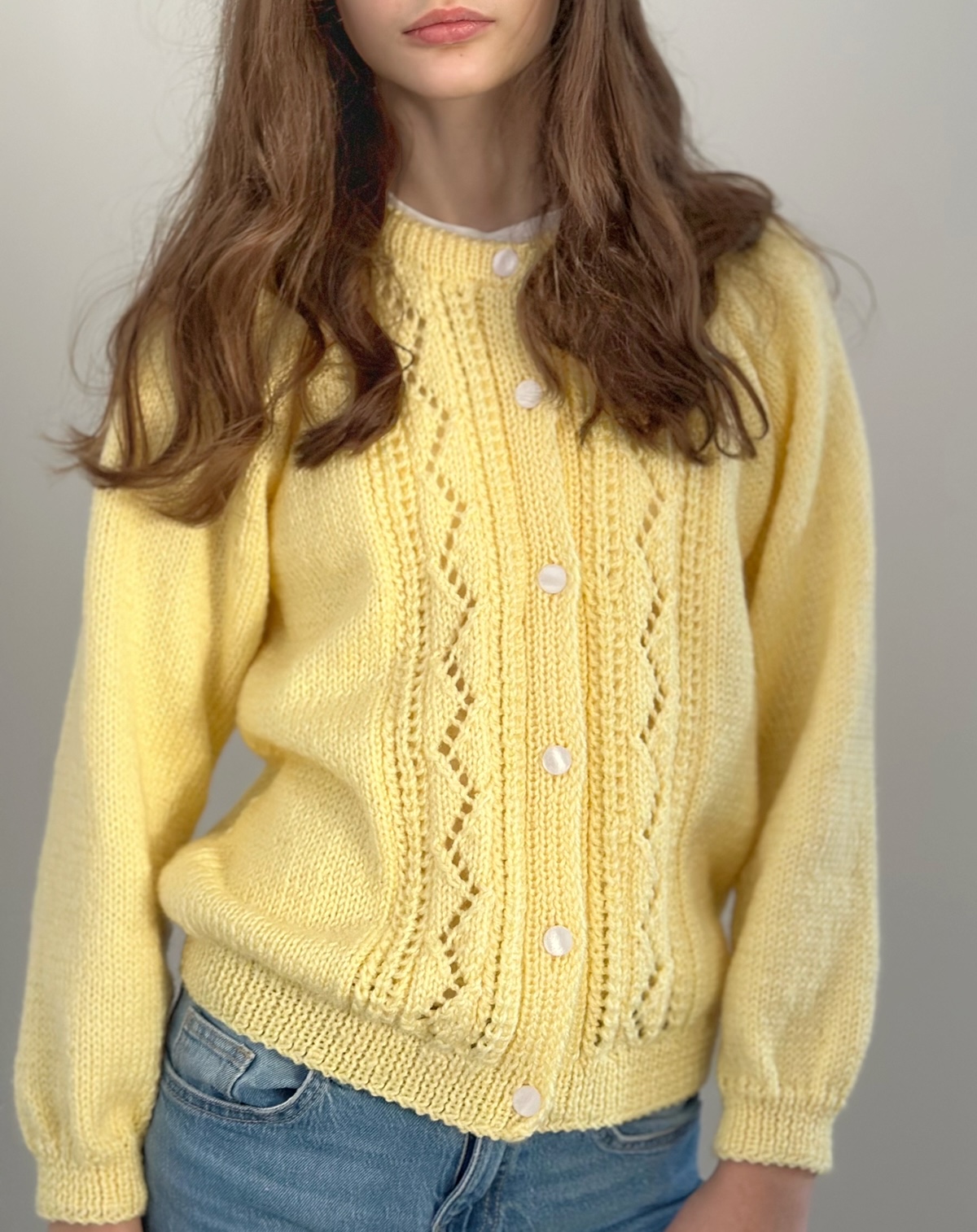 Cudowny kardigan Lilly w kolorze ciepłego odcienia żółtego koloru. Delikatny , kobiecy, z modnym ażurowym motywem z przodu. Zapinany na guziczki, ale nie musisz go zapinać. Kardigan ma rękawy , które z założenia maja być lekko ściągnięte i noszone jako 3/4 , ale w zależności od długości ręki mogą sięgać do nadgarstka. Włóczka z której powstał sweter to połączenie wełny z dodatkiem akrylu (70% pure lana wool) .To propozycja dla wszystkich, którzy cenią sobie zalety owczej wełny wzmocnionej syntetycznym włóknem akrylu, takiej która więcej wytrzyma i będzie można ją prać w pralce.