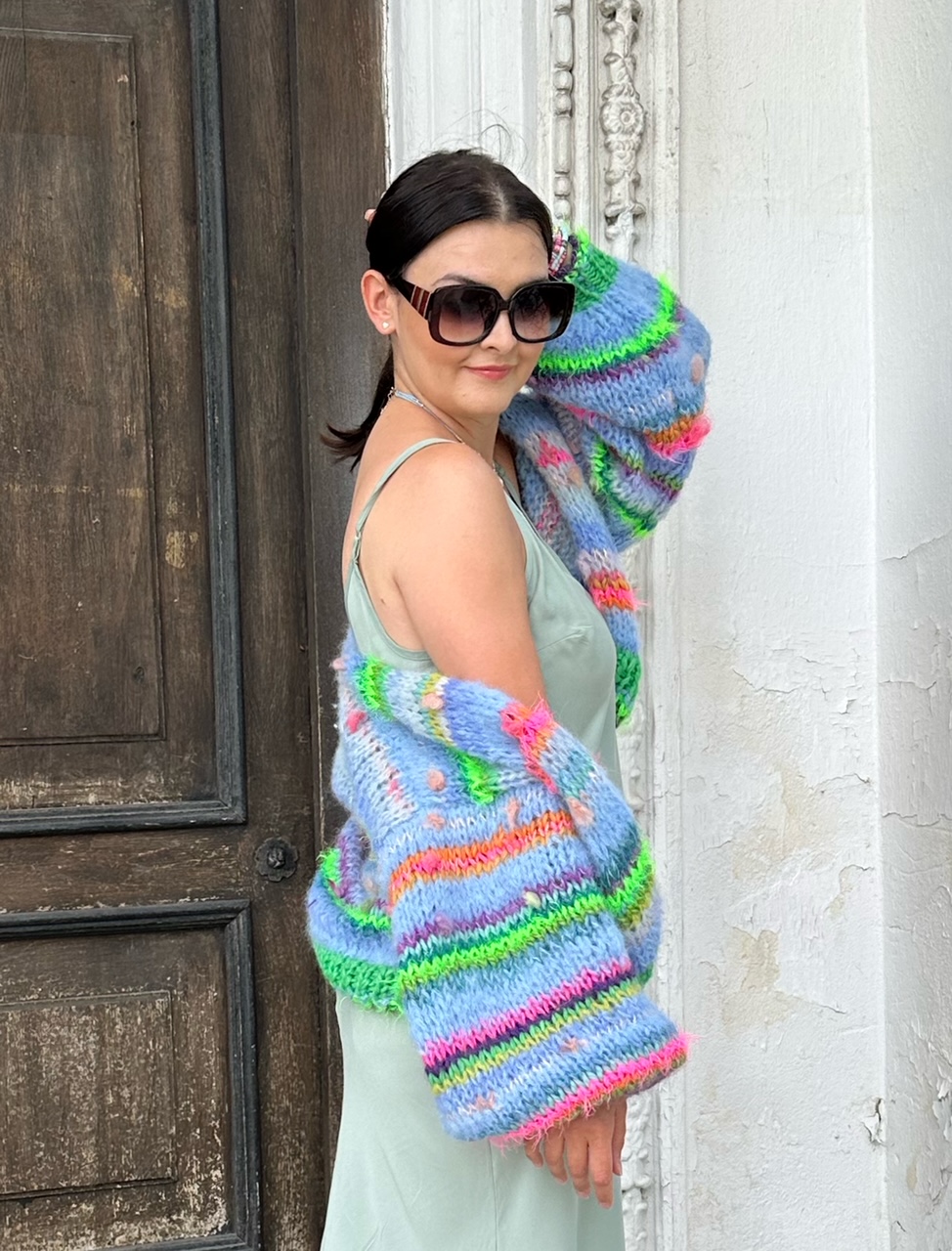 Kardigan Blue Butterfly to energetyczne połączenie włóczek: alpaki, merino, jedwabiu , moheru z minimalną domieszką akrylu. Fantazyjne włóczki z kolorowymi nopkami dodają mu charakteru i oryginalności.Kardigan jest niezwykle kolorowy (w przewagą odcieni niebieskiego), puszysty i cudownie  miękki. To całoroczny model , dla kobiet które lubią naturalne materiały, wygodę i uwielbiają być zauważone.