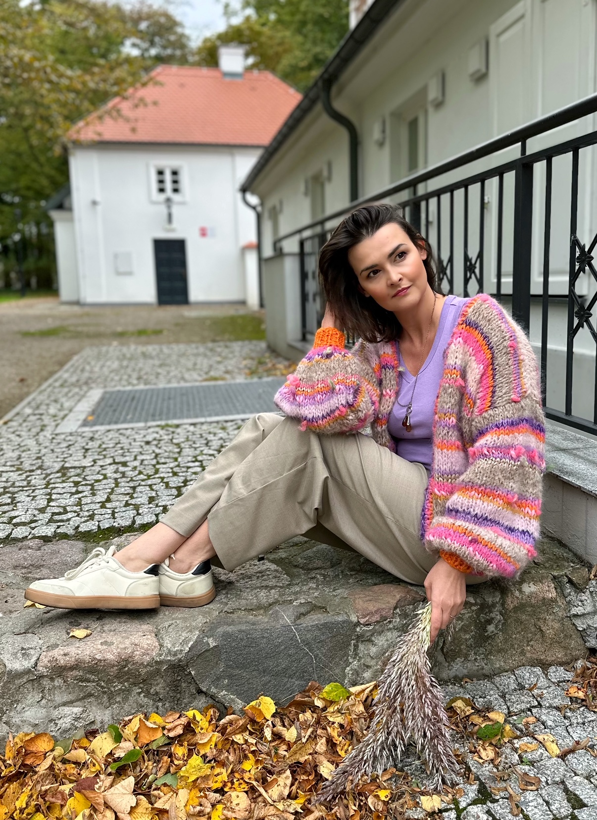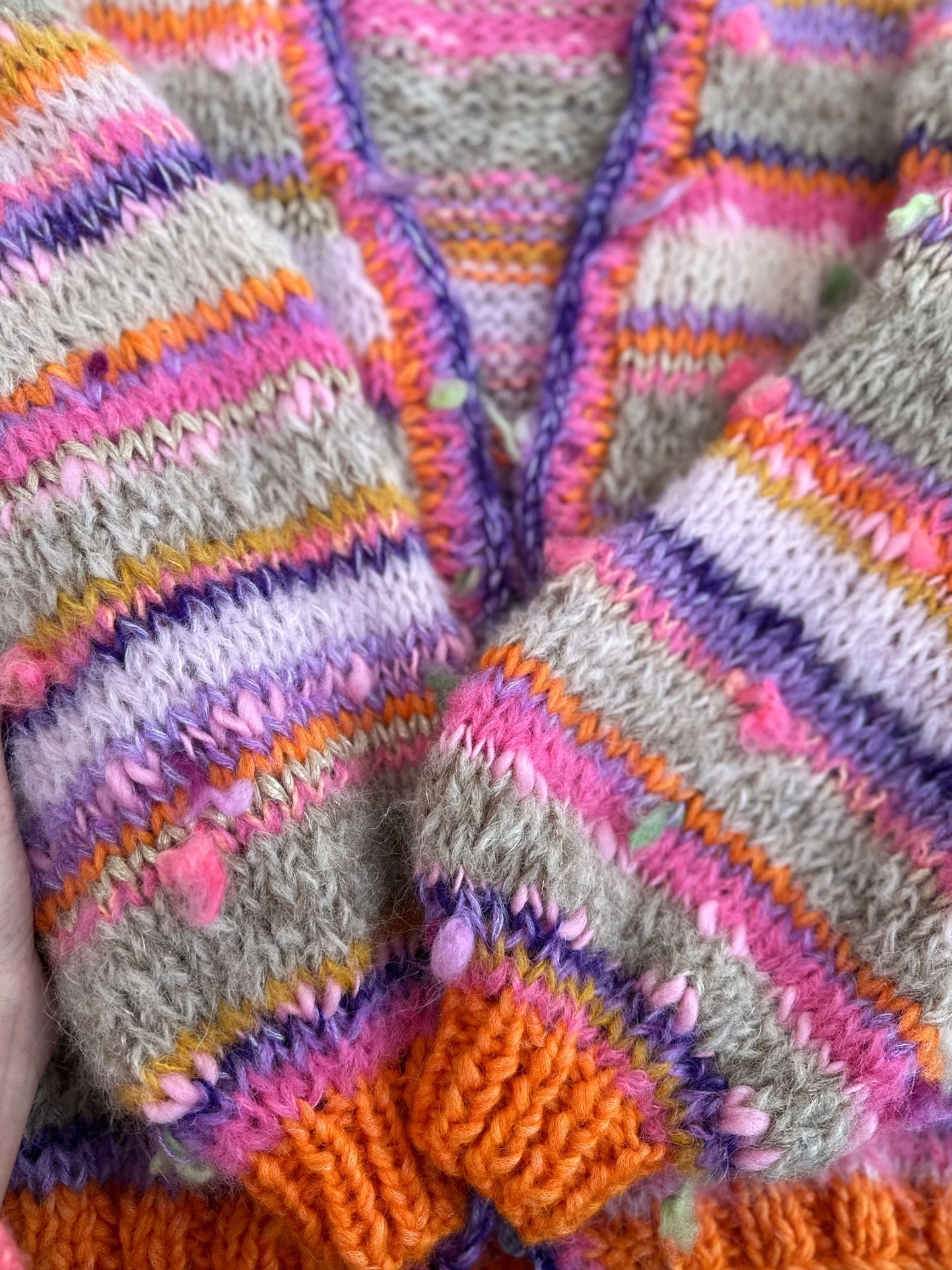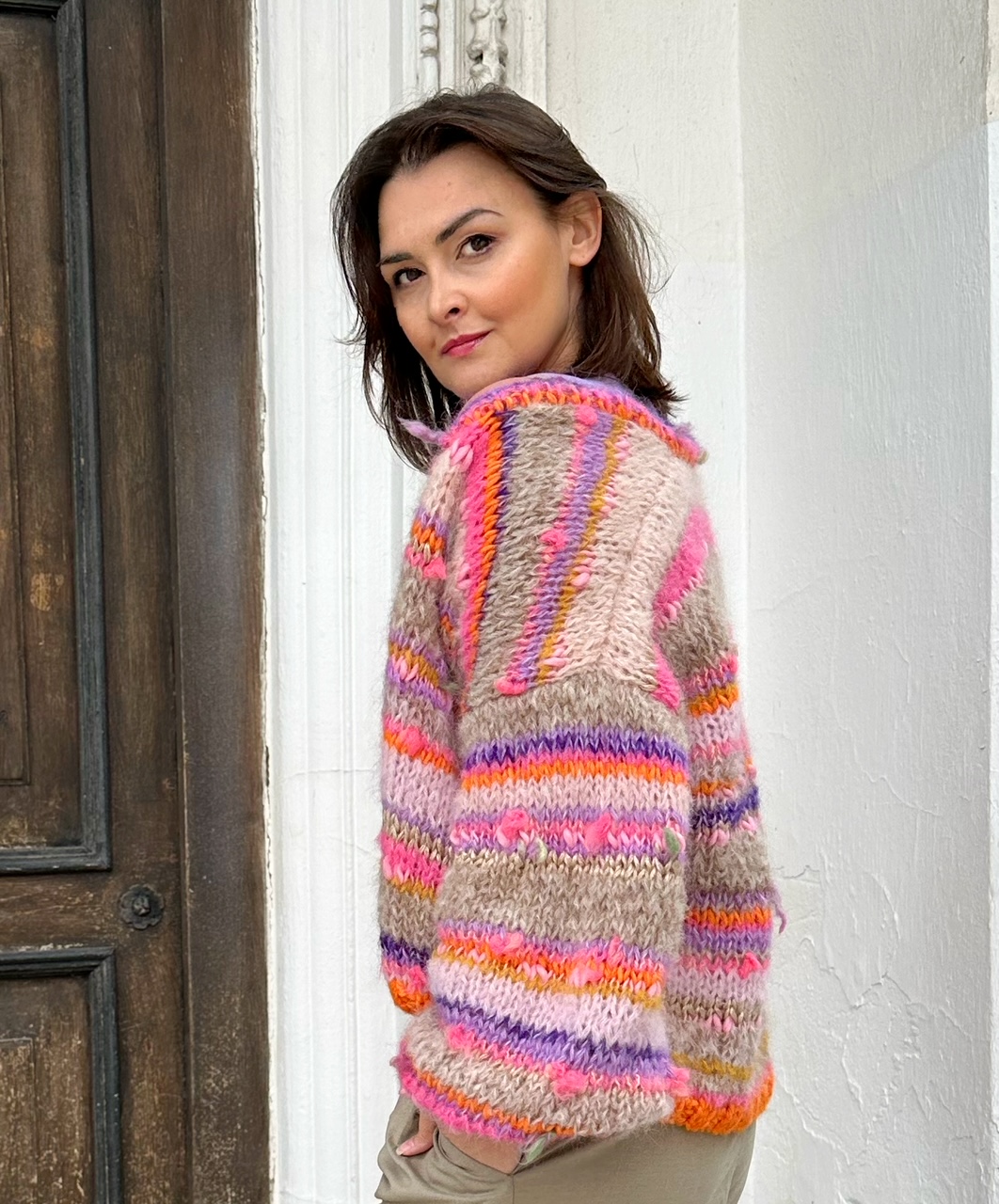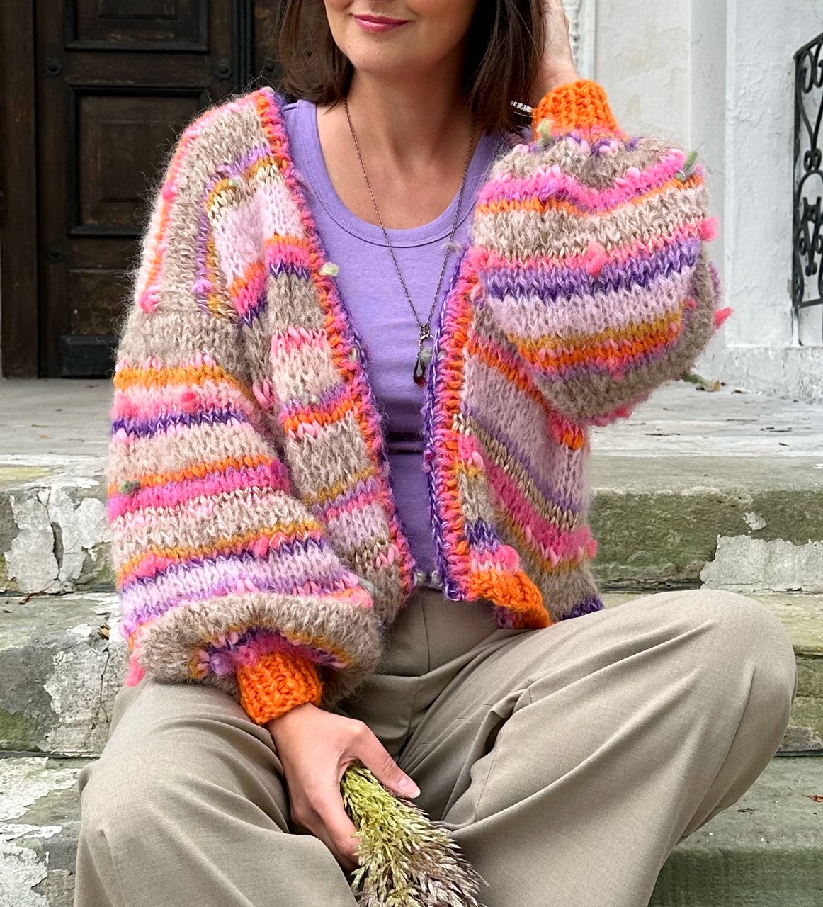 Kardigan Carola, całoroczny, niezwykle efektowny, kobiecy, delikatny i puszysty kardigan spleciony ręcznie w przeważającej większości z naturalnych przędz, ozdobiony efektownymi włóczkami fantazyjnymi, pełen koloru i fantazji.