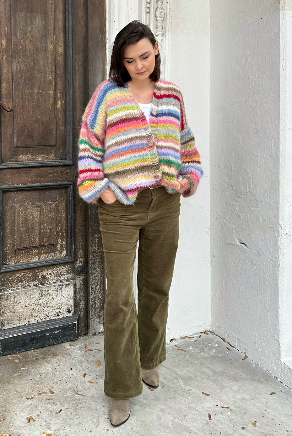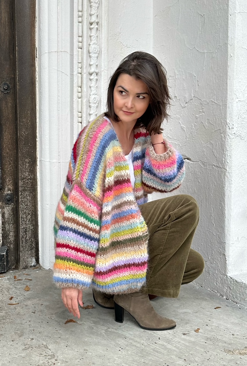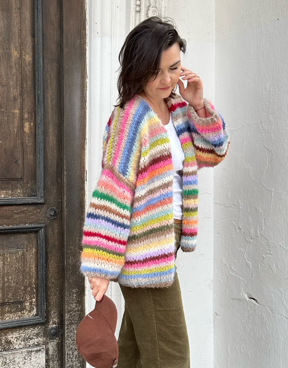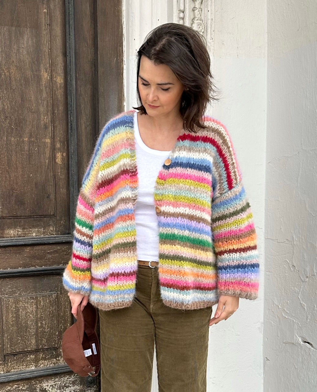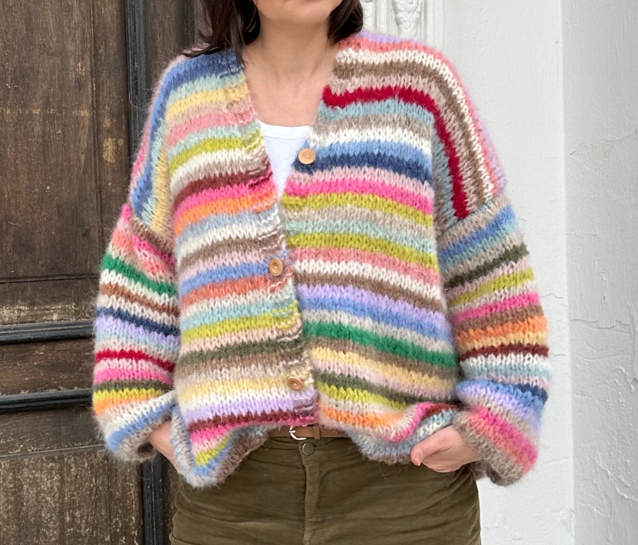 Kardigan Colorina zrobiony na drutach z alpaki , wełny merino, jedwabiu i moherku ze śladową ilością akrylu. lekki, kolorowy, wygodny. To całoroczna propozycja dla osób ceniących komfort i naturalne przędze. Krój lekko oversizowy. Na guziki w kolorze słomkowym.Jeśli wolisz wersję bez guzików , daj znać w uwagach do zamówienia. Układ pasków może róznić się od tych na zdjęciach.