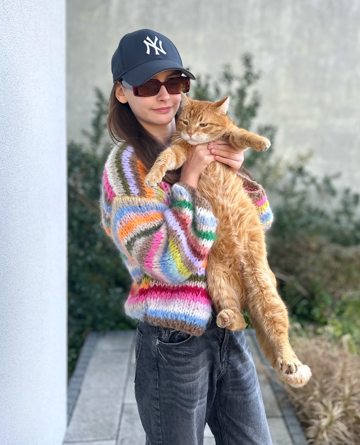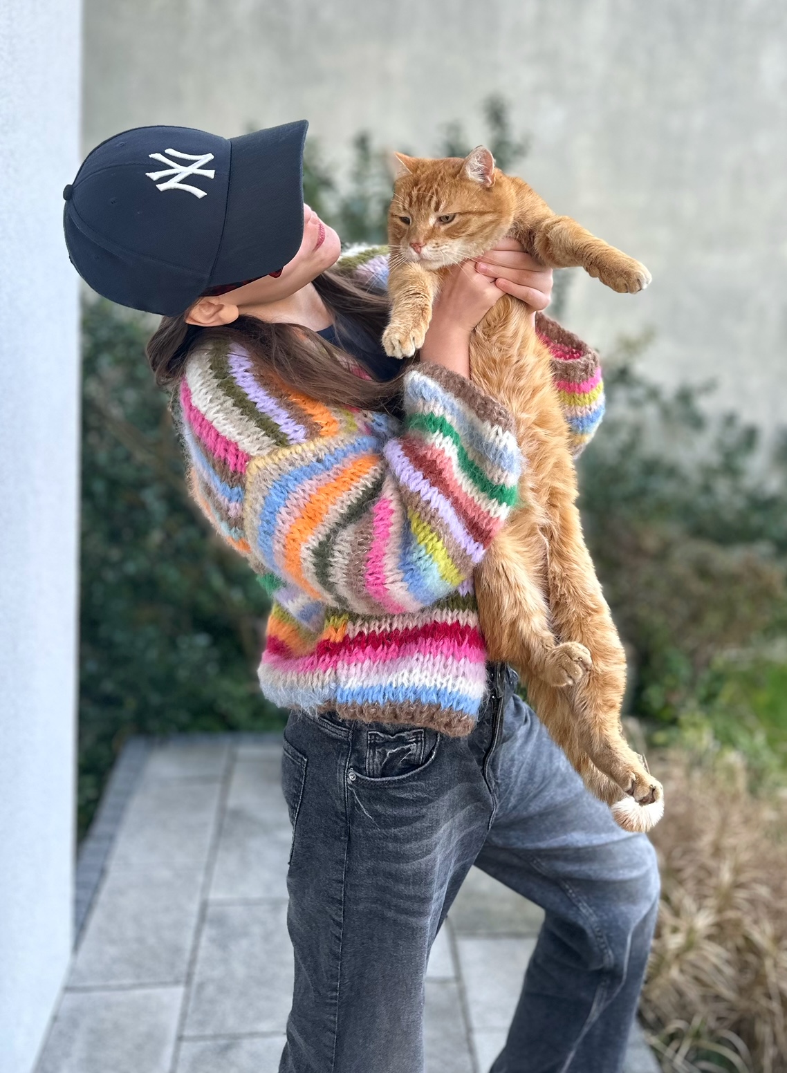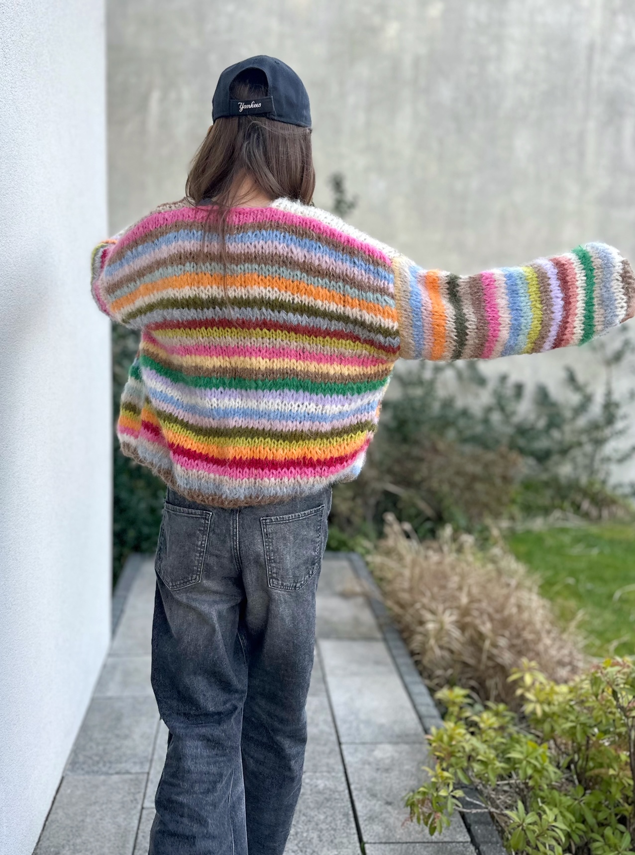 Kardigan Colorina zrobiony na drutach z alpaki , wełny merino, jedwabiu i moherku ze śladową ilością akrylu. lekki, kolorowy, wygodny. To całoroczna propozycja dla osób ceniących komfort i naturalne przędze. Układ pasków może róznić się od tych na zdjęciach.