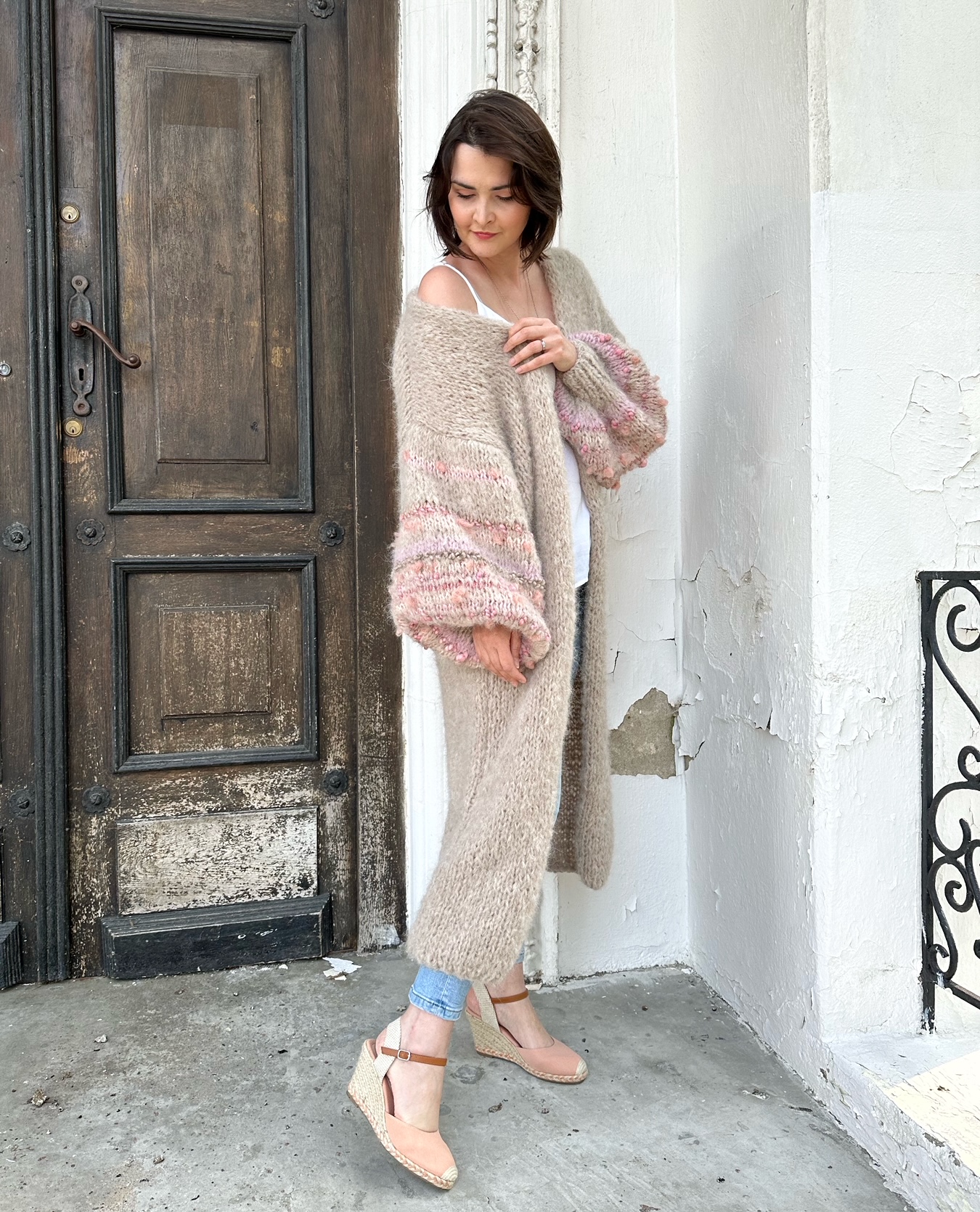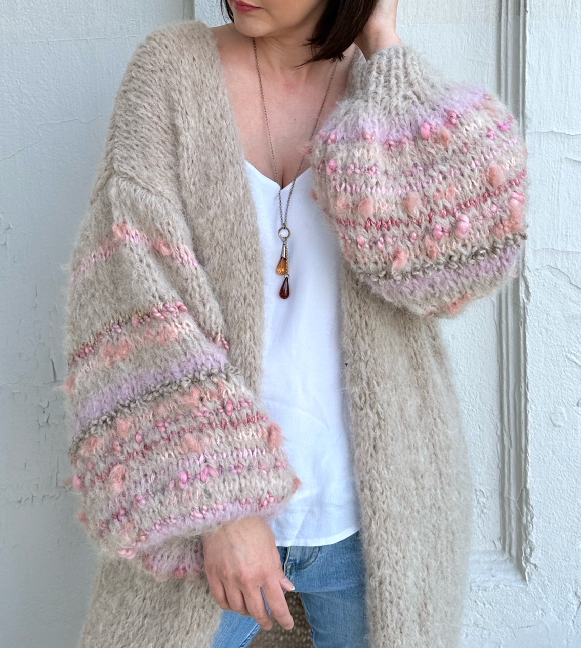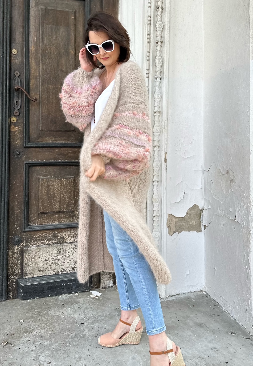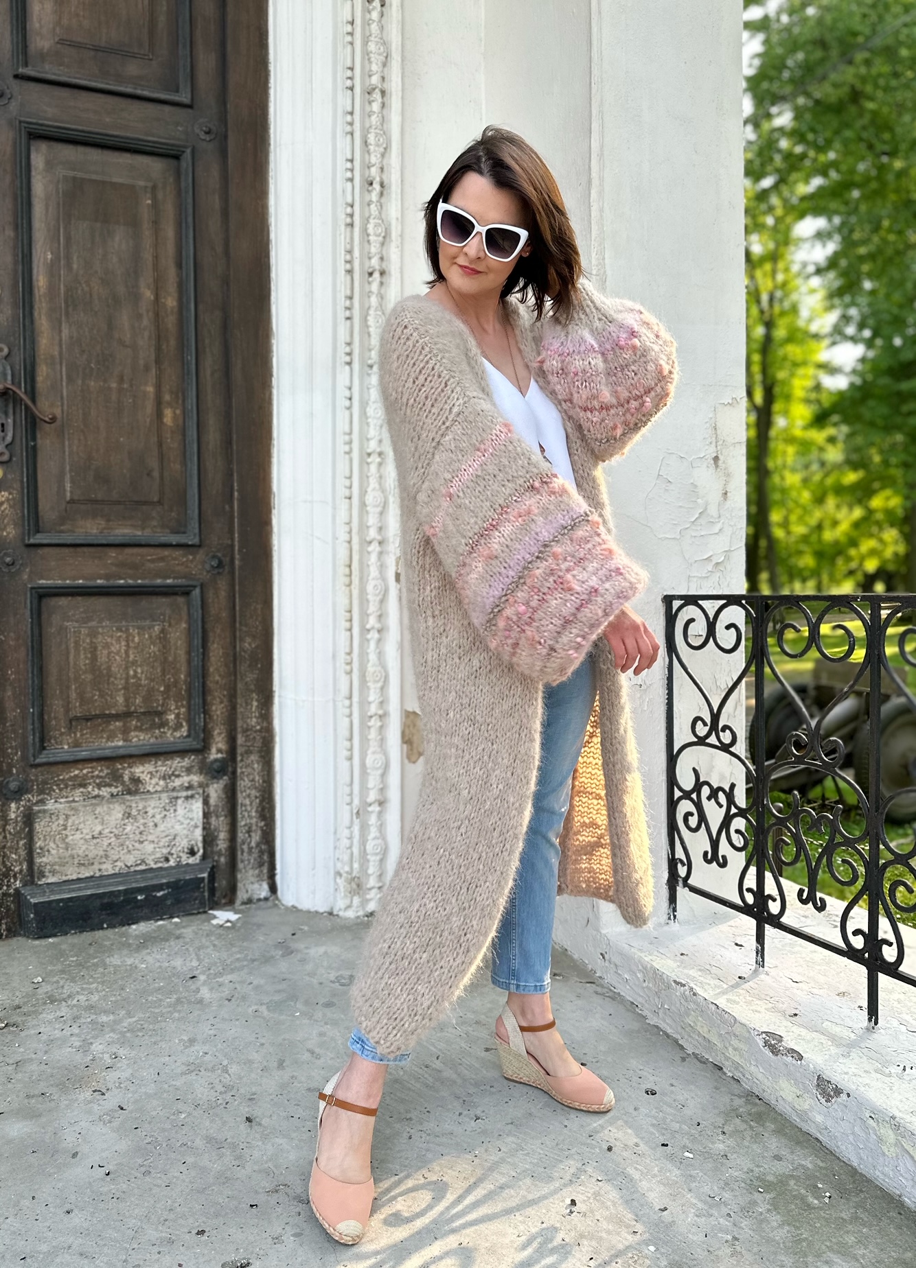 Jedyny, niepowtarzalny , całoroczny kardigan spleciony ręcznie na drutach z podwójnej nitki alpaki i wełny z dodatkiem fantazyjnej włóczki wplecionej w szerokie rękawy. Nie gryzie, jest bardzo miękki i puszysty. Idealny do jeansów, spódnic i letnich sukienek.