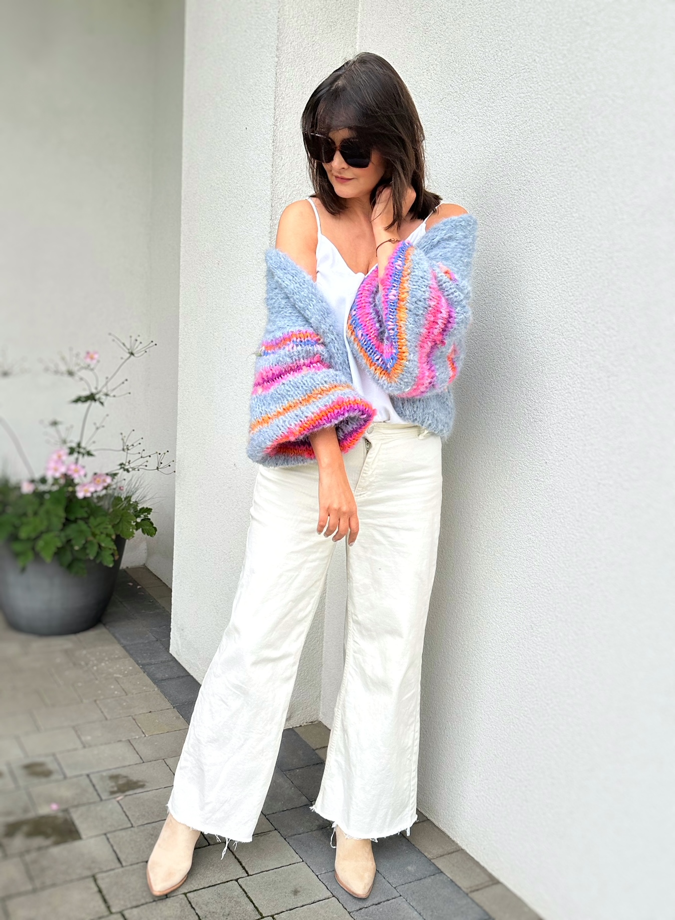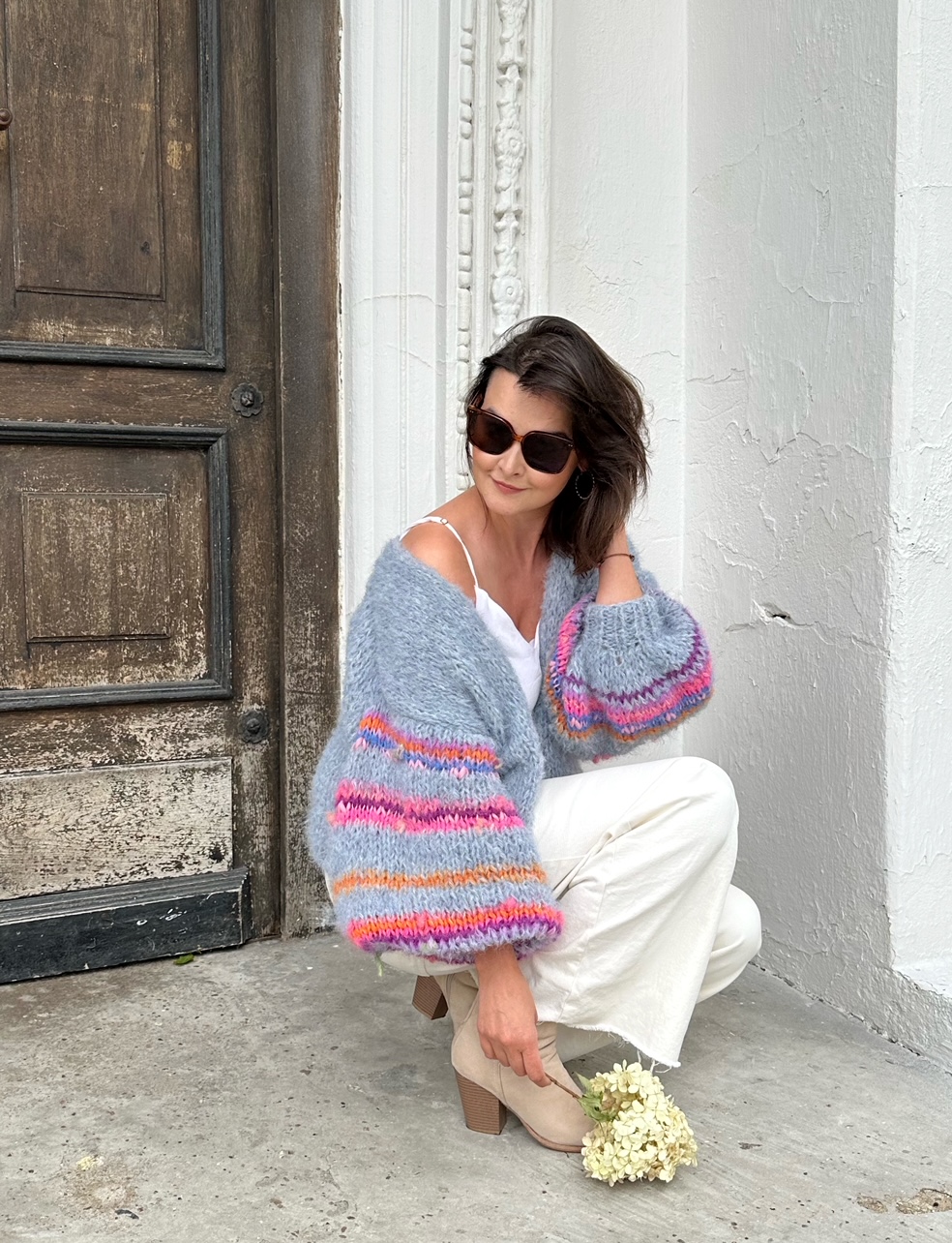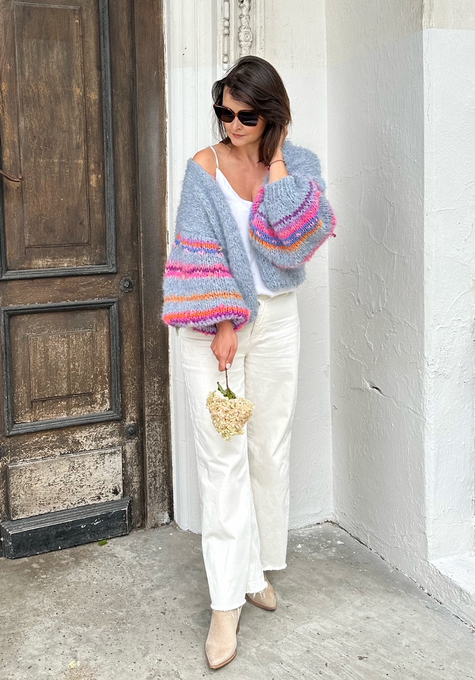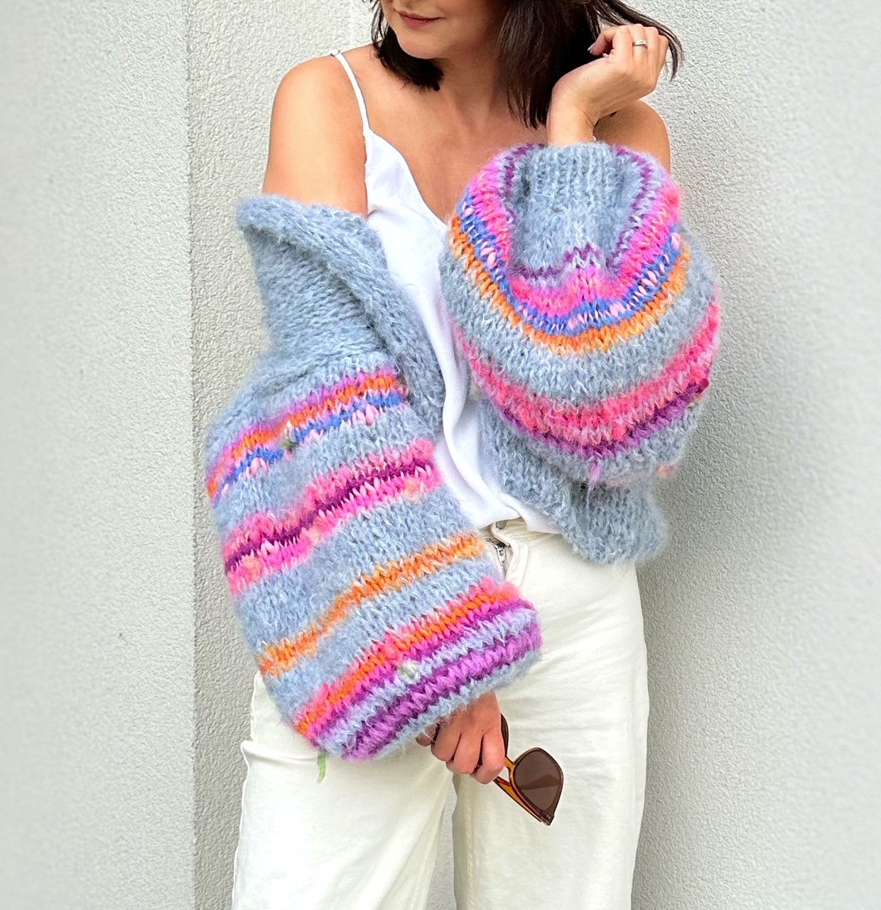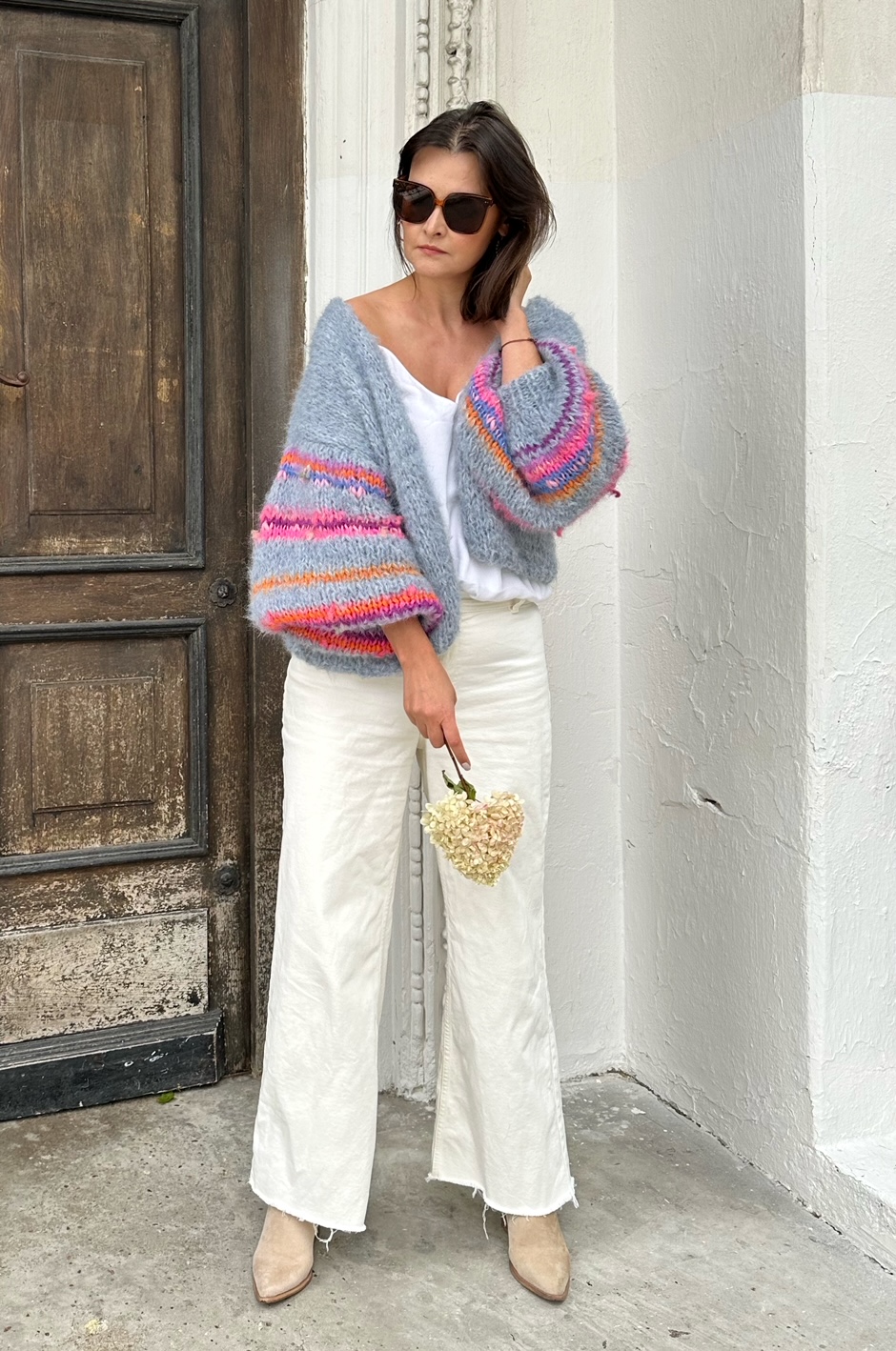 Kardigan Dovelicious w pięknym odcieniu spokojnego, gołębiego błękitu spleciony z podwójnej nitki alpaki 71%, wełny 25% i poliamidu 4% to propozycja dla osób lubiących klasykę, elegancję z odrobiną fantazji. Kardigan jest lekki, puszysty ,a szerokie lekko balonowe rękawy dodają mu uroku i charakteru. W rękawy wpleciona została fantazyjna włóczka o różnej strukturze i kolorach.