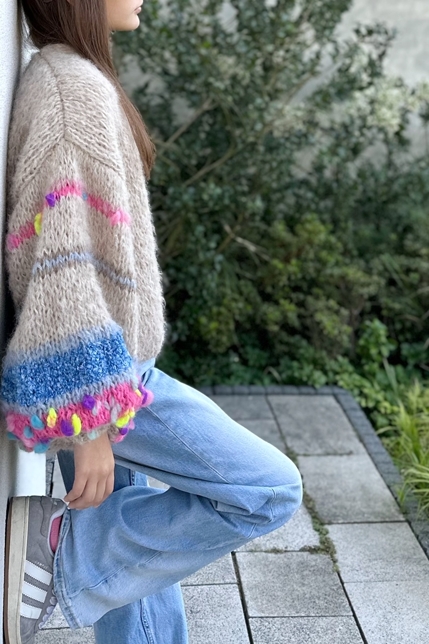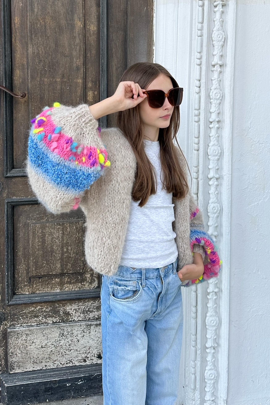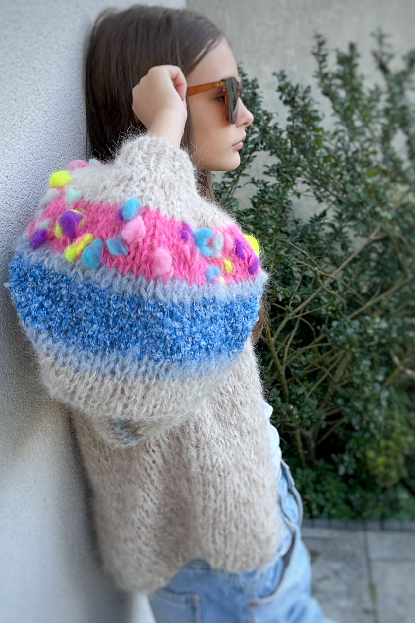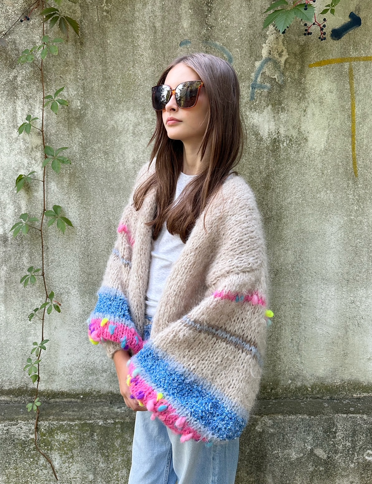 Efektowny , całoroczny kardigan Dream, spleciony ręcznie na drutach w przeważającej większości z alpaki, merino i jedwabiu z dodatkiem ciekawych włóczek fantazyjnych. Kardigan ma szerokie, modne rękawy , jest miękki, puszysty, pasuje do wielu stylizacji, zarówno jeansów , jak i sukienek czy szortów. Baza to beż , a na rękawach pojawiają się odcienie różu i niebieskości (włóczki fantazyjne). Kardigan na zdjęciu to rozmiar s , jednak tu według rozmiaru to taki s/ m (sprawdź wymiary :)) Oczywiście możesz zamówić w innym rozmiarze. Napisz do mnie , wszystko ustalimy.