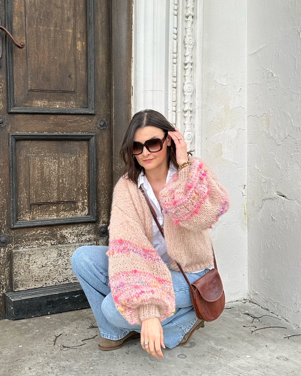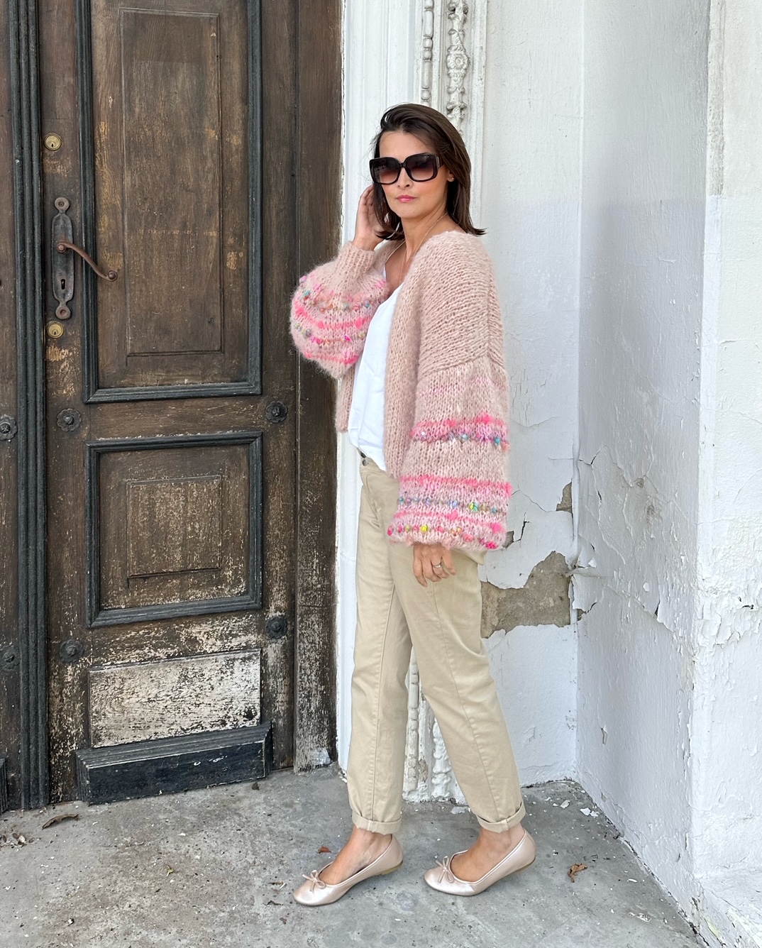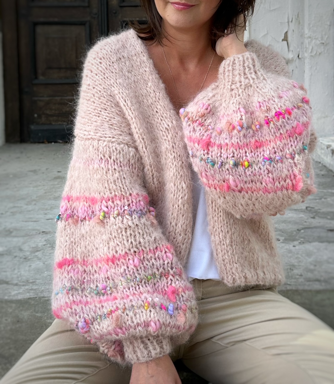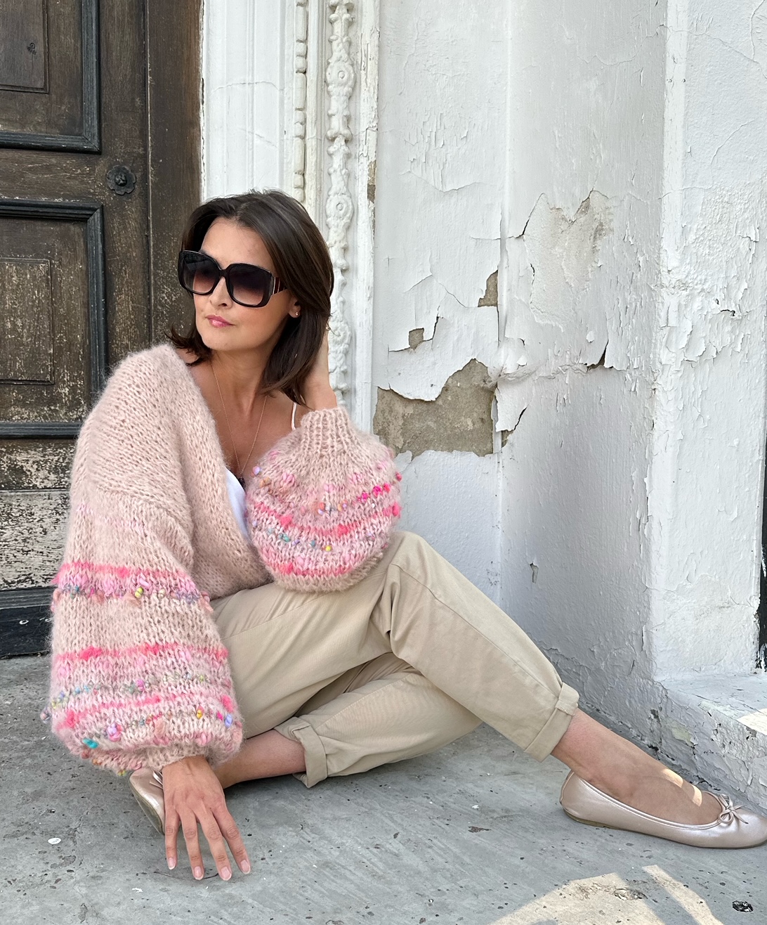 Kardigan Ena  z szerokimi rękawami, spleciony na drutach z dwóch niteczek: alpaki, merino i jedwabiu , z dodatkiem fantazyjnej włóczki na rękawach oraz włoczki z delikatnymi cekinami, które mienią się w słońcu. Modny, efektowny, naturalny. Kolorem bazowym jest pudrowy róż wpadający w beż. Idealny do wielu stylizacji i do wielu kolorów bazowych Twojej stylizacji. Jest miękkie, lekki , przewiewny. Nie jest gruby, idealny na chłodne letnie wieczory, rześkie poranki, wietrzne plaże, spotkania i eleganckie przyjęcia.