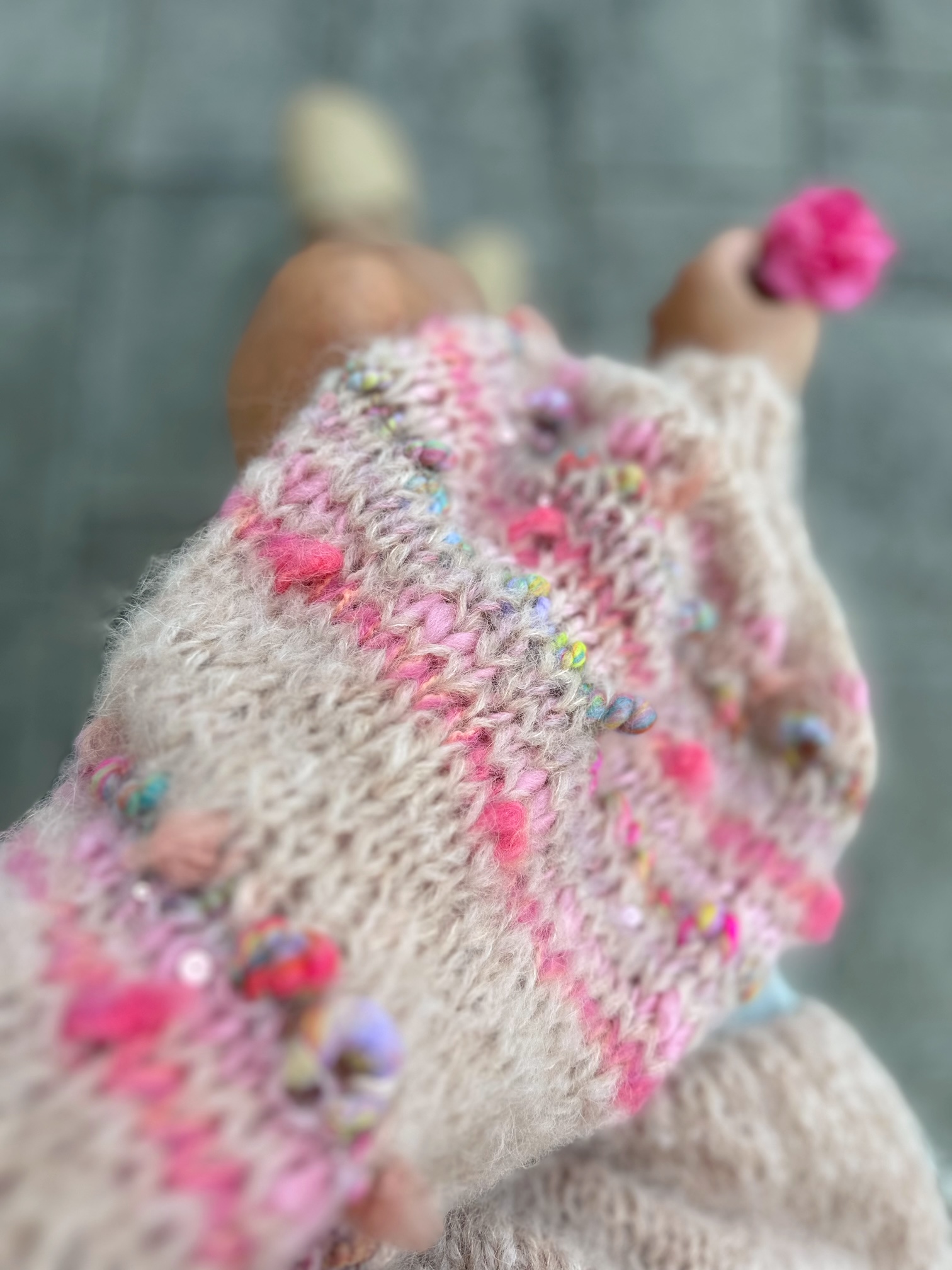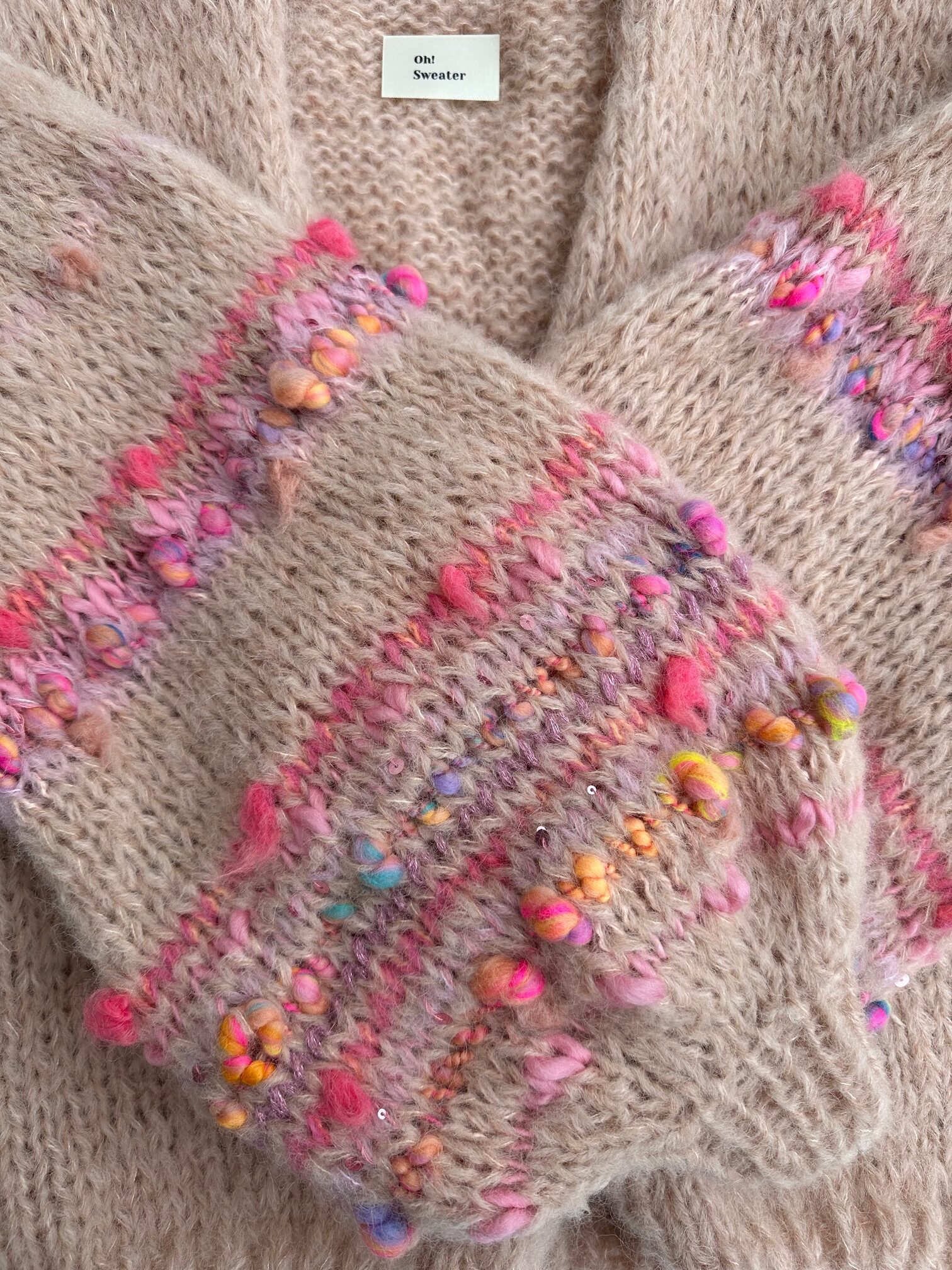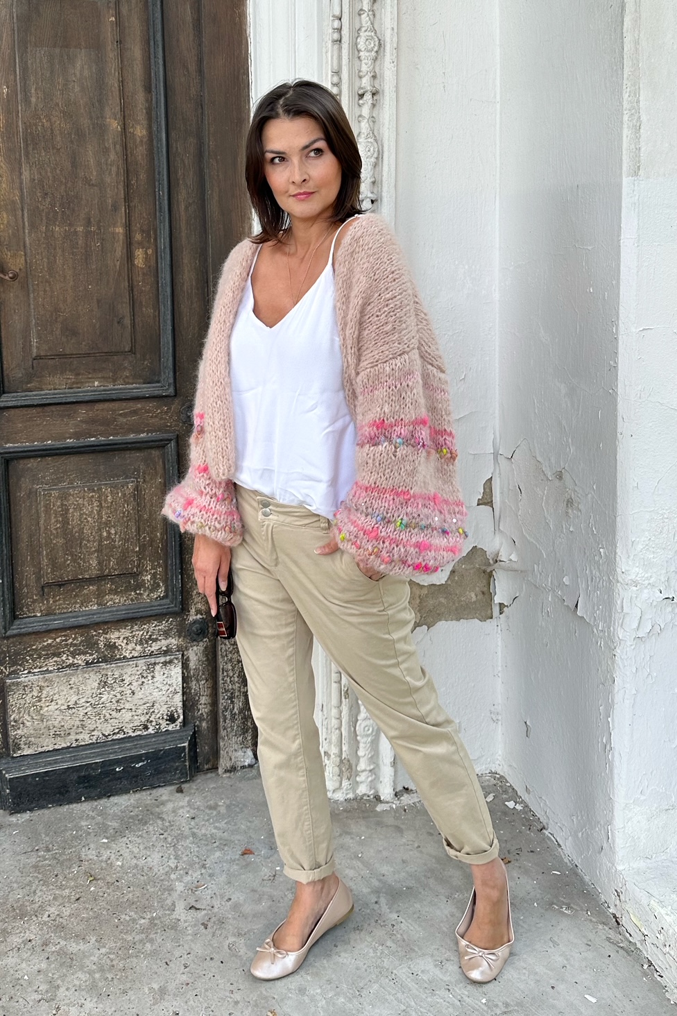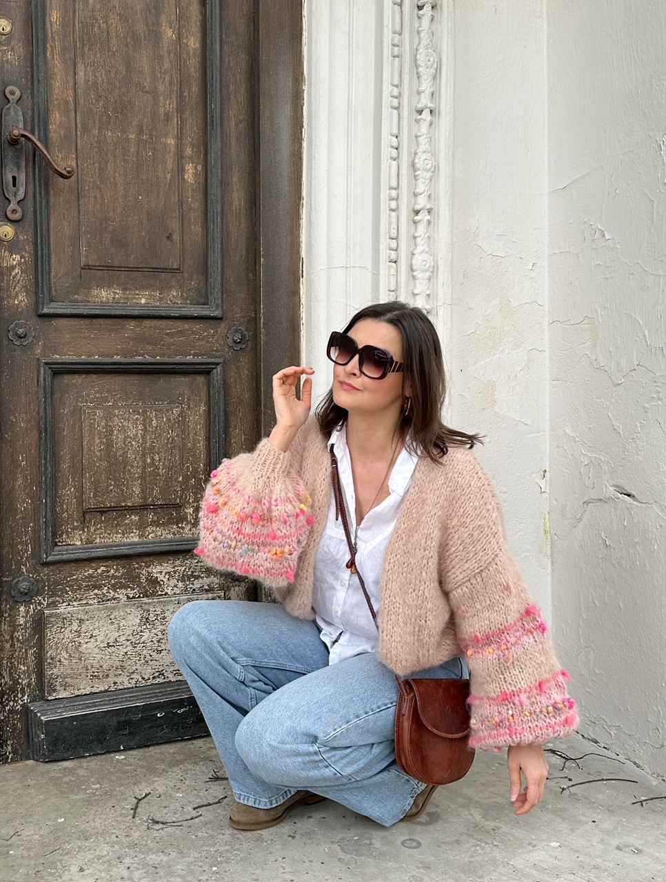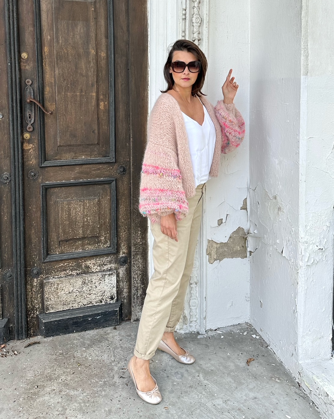 Kardigan Ena  z szerokimi rękawami, spleciony na drutach z dwóch niteczek: alpaki, merino i jedwabiu , z dodatkiem fantazyjnej włóczki na rękawach oraz włoczki z delikatnymi cekinami, które mienią się w słońcu. Modny, efektowny, naturalny. Kolorem bazowym jest pudrowy róż wpadający w beż. Idealny do wielu stylizacji i do wielu kolorów bazowych Twojej stylizacji. Jest miękkie, lekki , przewiewny. Nie jest gruby, idealny na chłodne letnie wieczory, rześkie poranki, wietrzne plaże, spotkania i eleganckie przyjęcia.