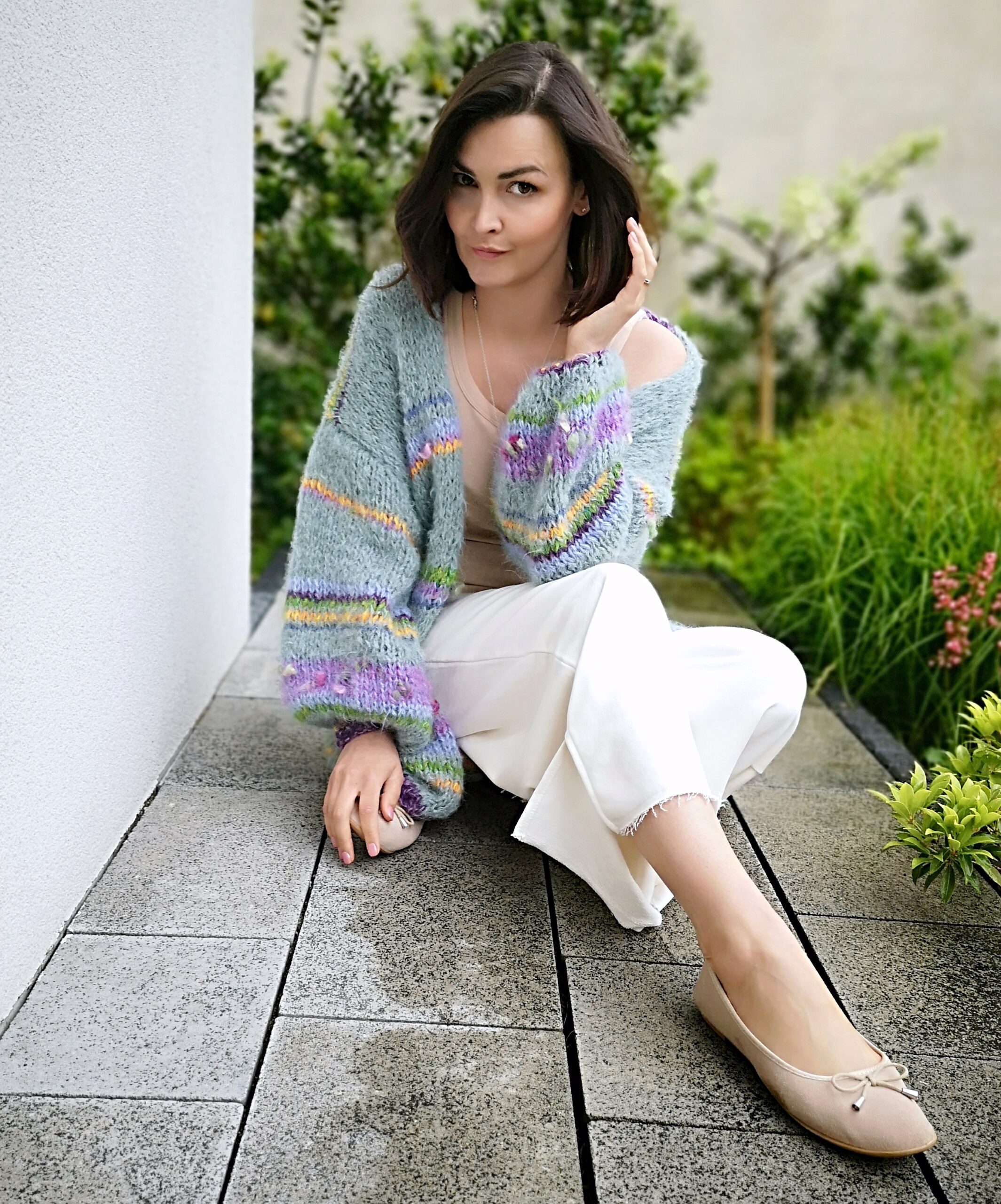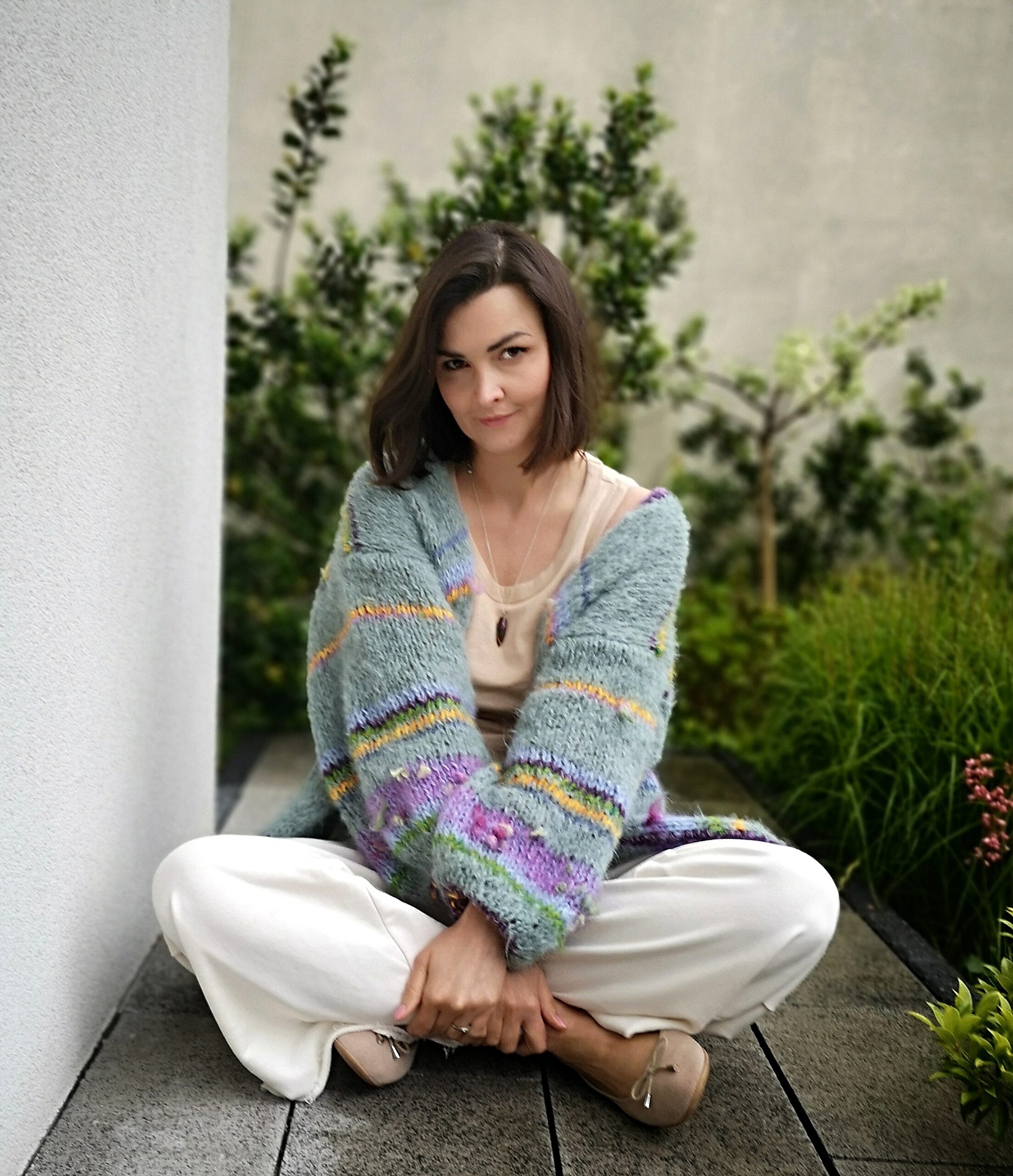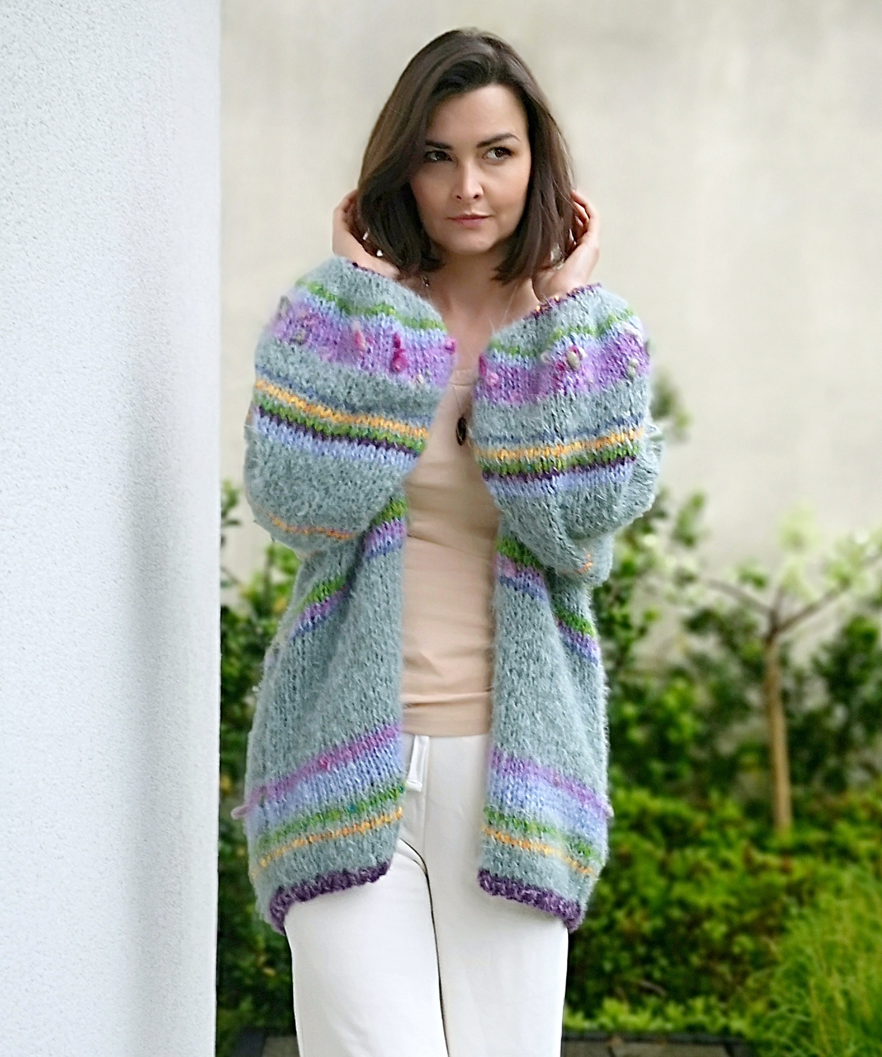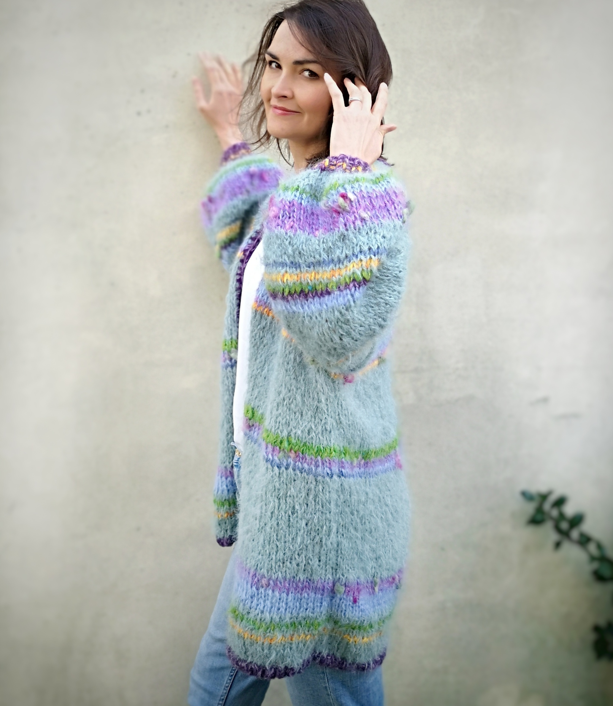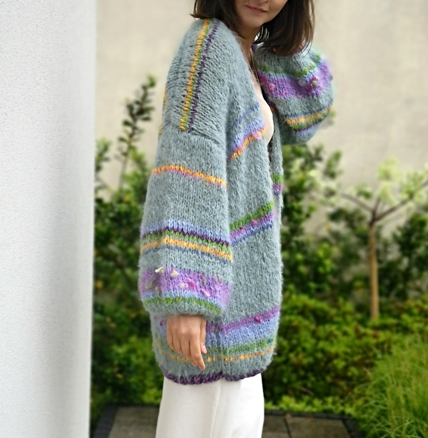 Kardigan Green Joy spleciony ręcznie na drutach z alpaki , merino i jedwabiu oraz pasków kolorowych, fantazyjnych włóczek. Szerokie rękawy nadają mu charakteru i oryginalności.