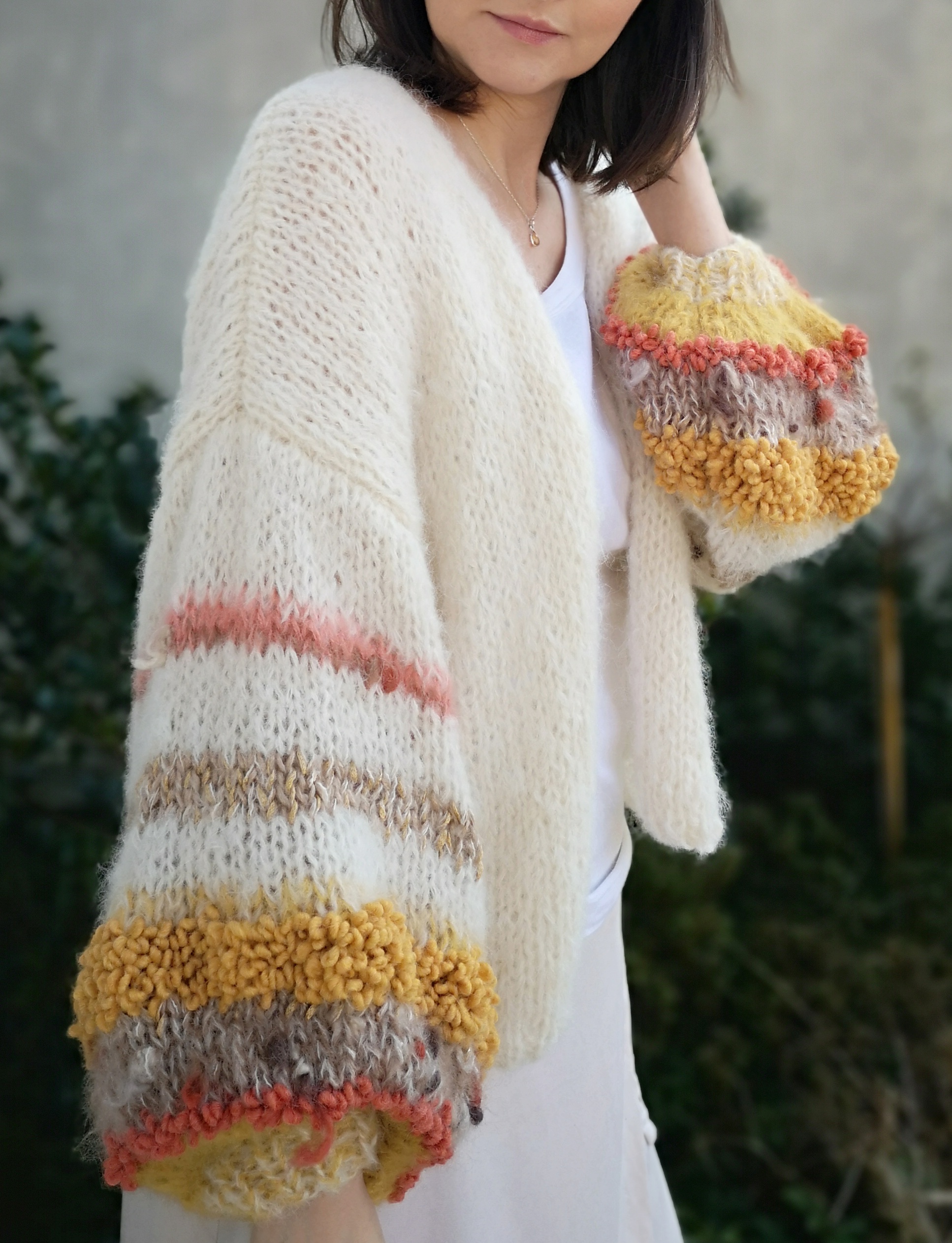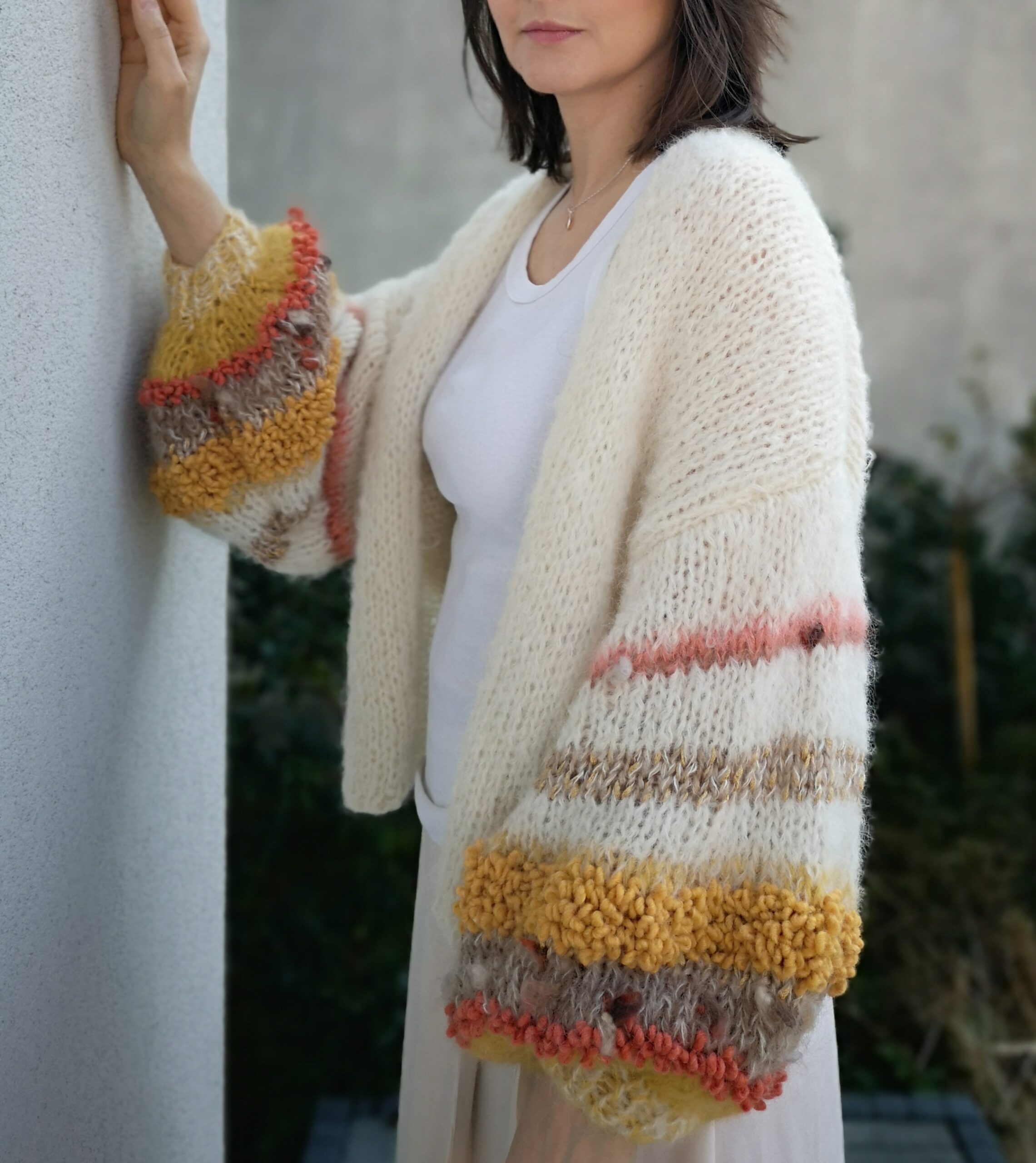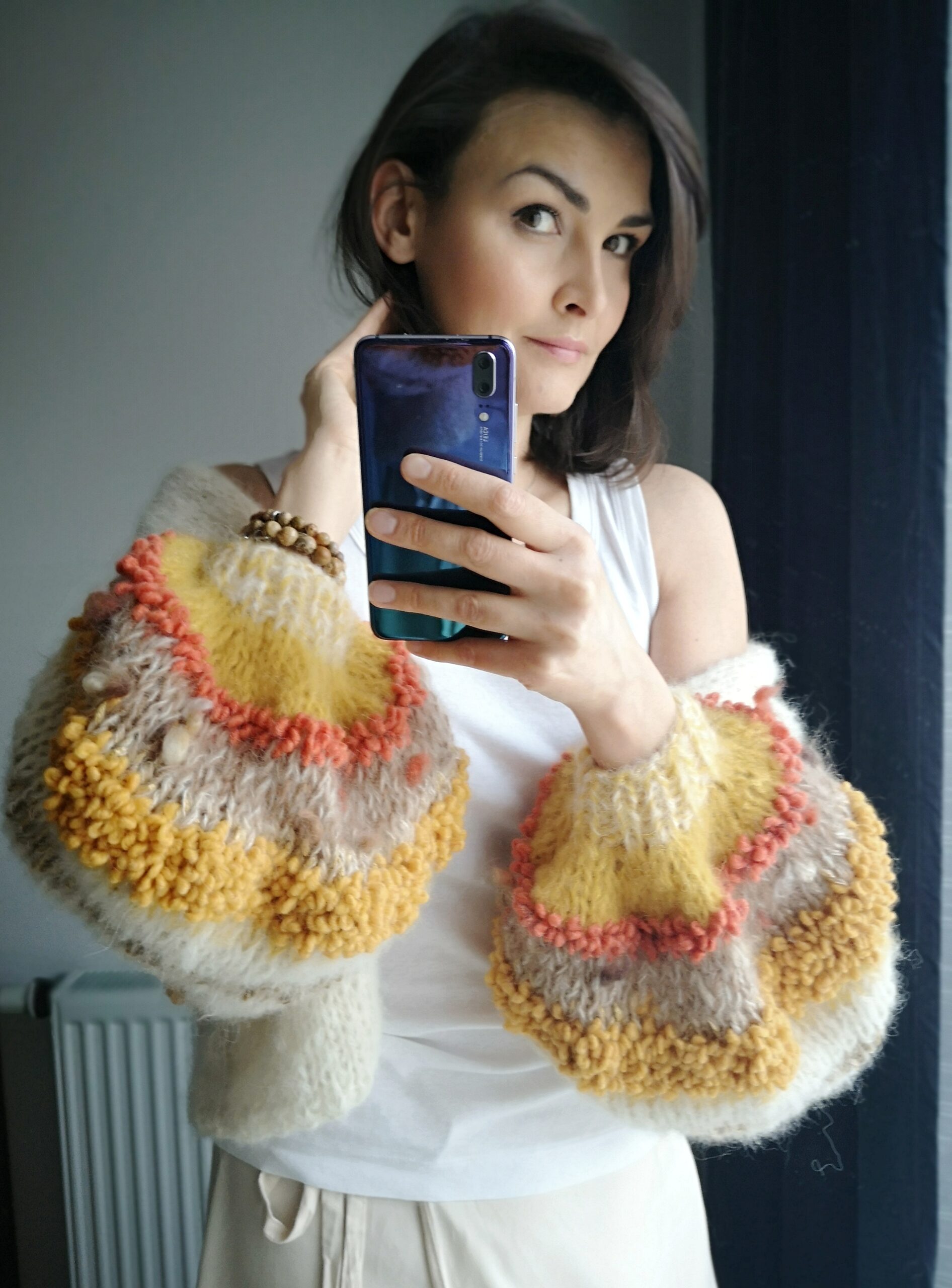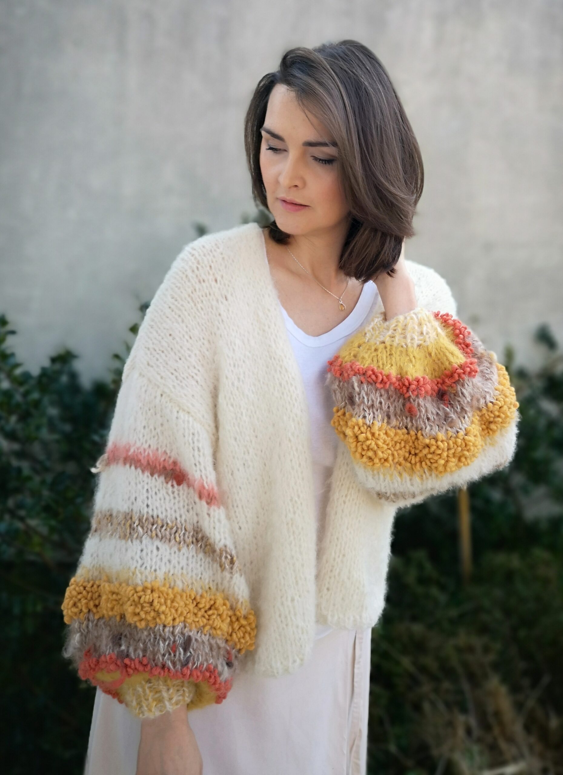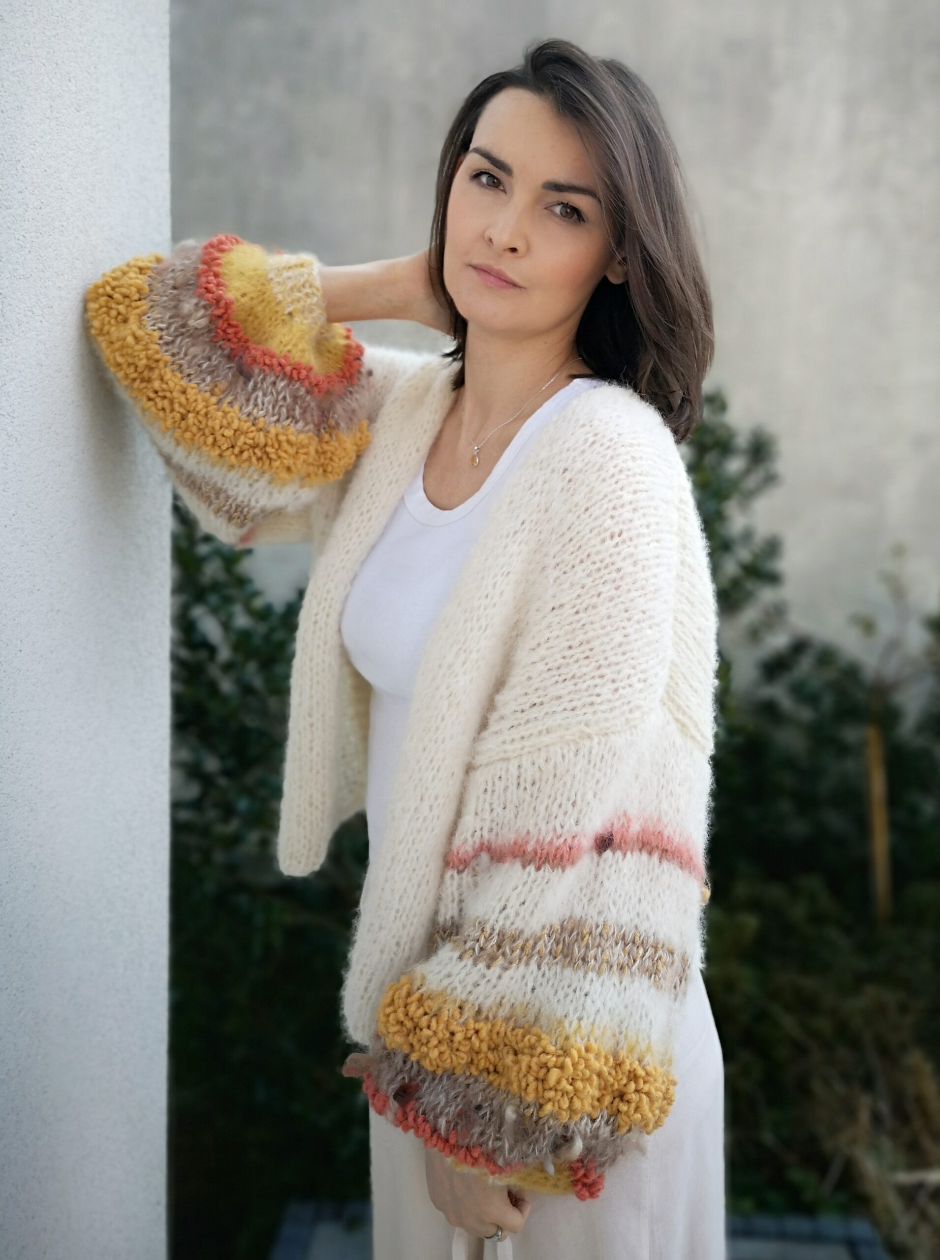 Kardigan Nature spleciony ręcznie na drutach z dwóch nitek alpaki, merino i jedwaniu w pięknym kolorze złamanej bieli. Kardigan na szerokie , balonowe rękawy, w które wplecione jest dużo fantazyjnej włóczki. Jedyny i niepowtarzalny, bardzo oryginalny. Całoroczny. Świetnie sprawdzi się jeansów , sukienek czy szortów.Polecam.