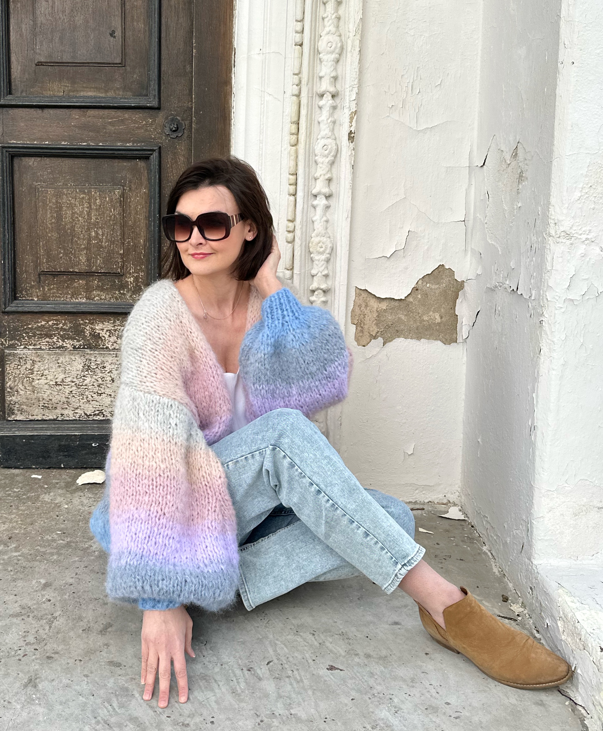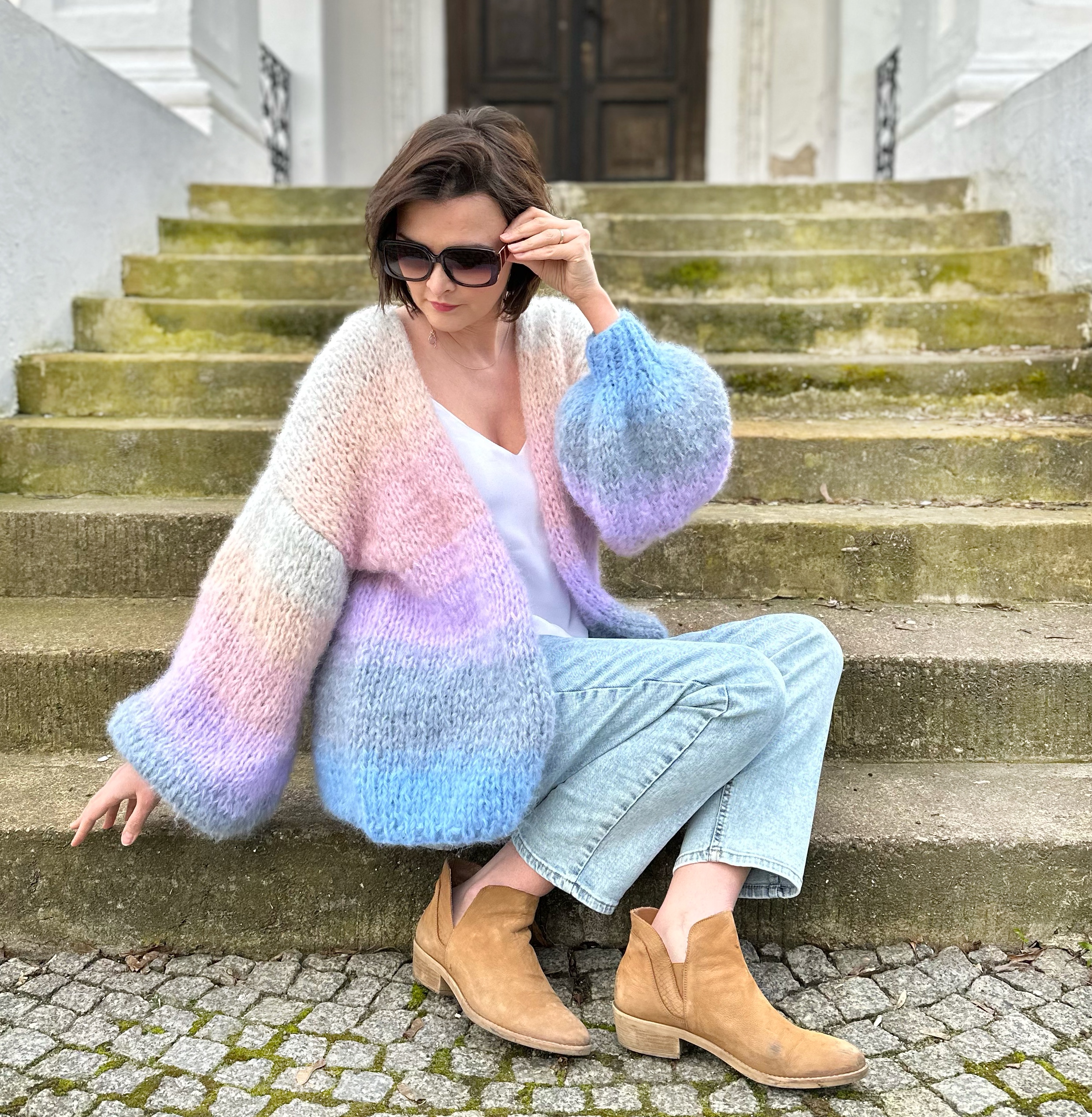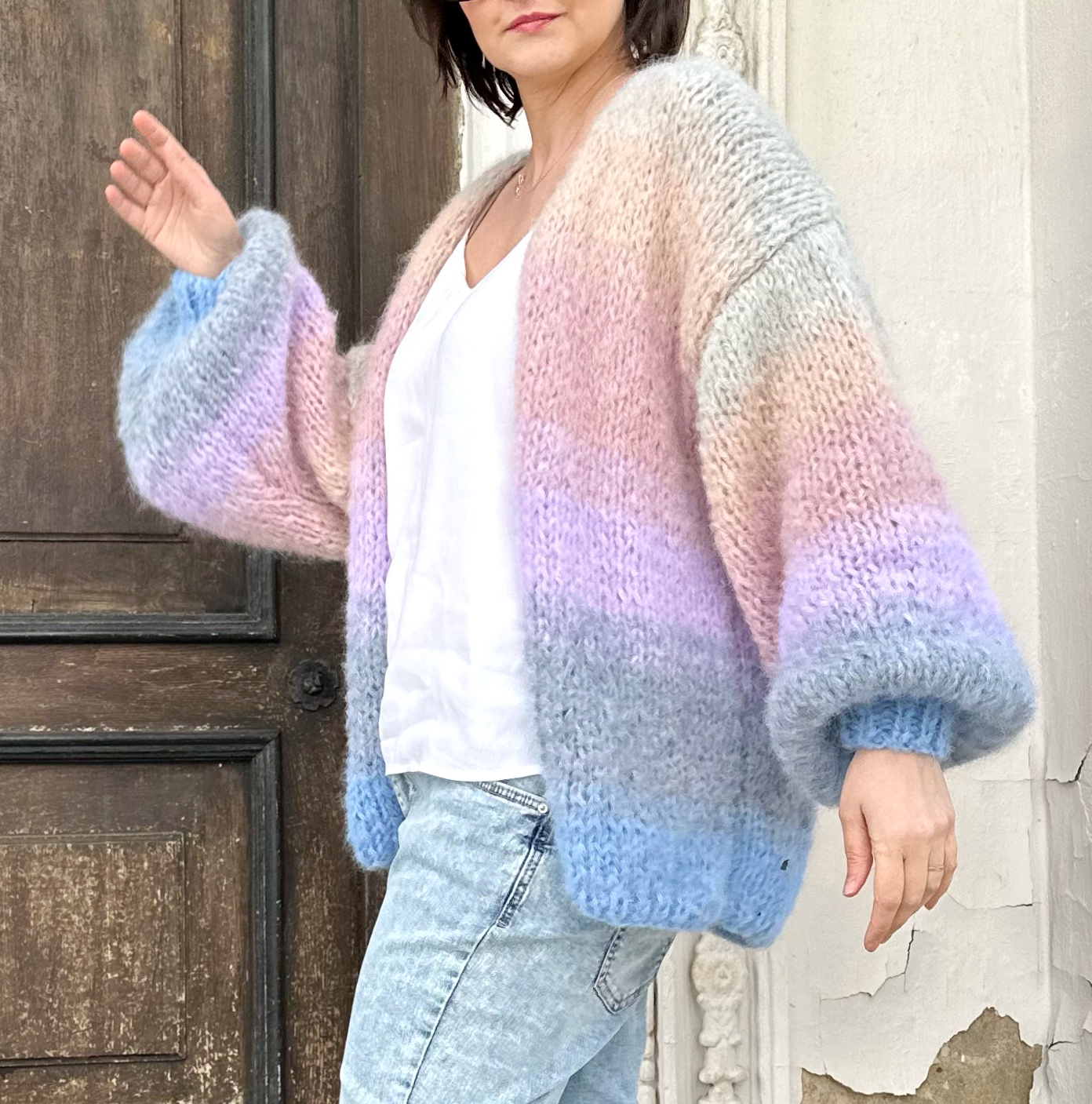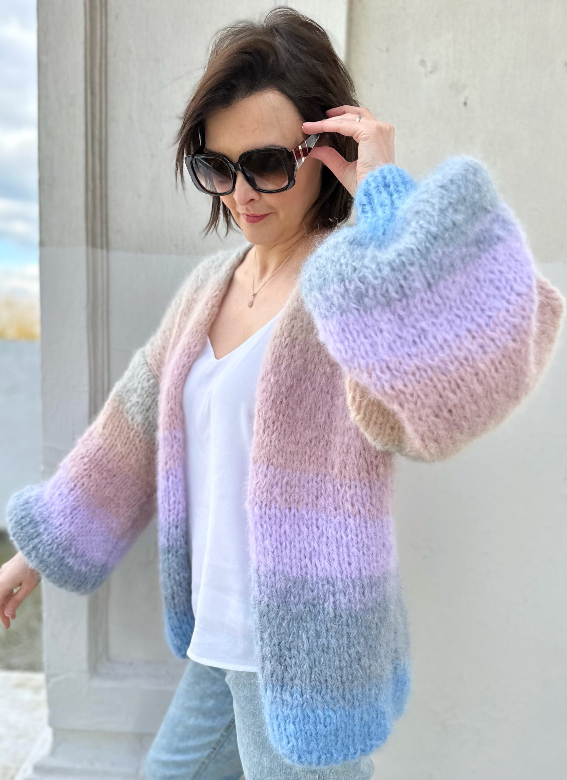 Kardigan PasteLOVE spleciony na drutach z podwójnej nitki Alpaki 71%,wełny 25% poliamidu 4% , w pięknych, pastelowych odcieniach, niebieskości różu i szarości.