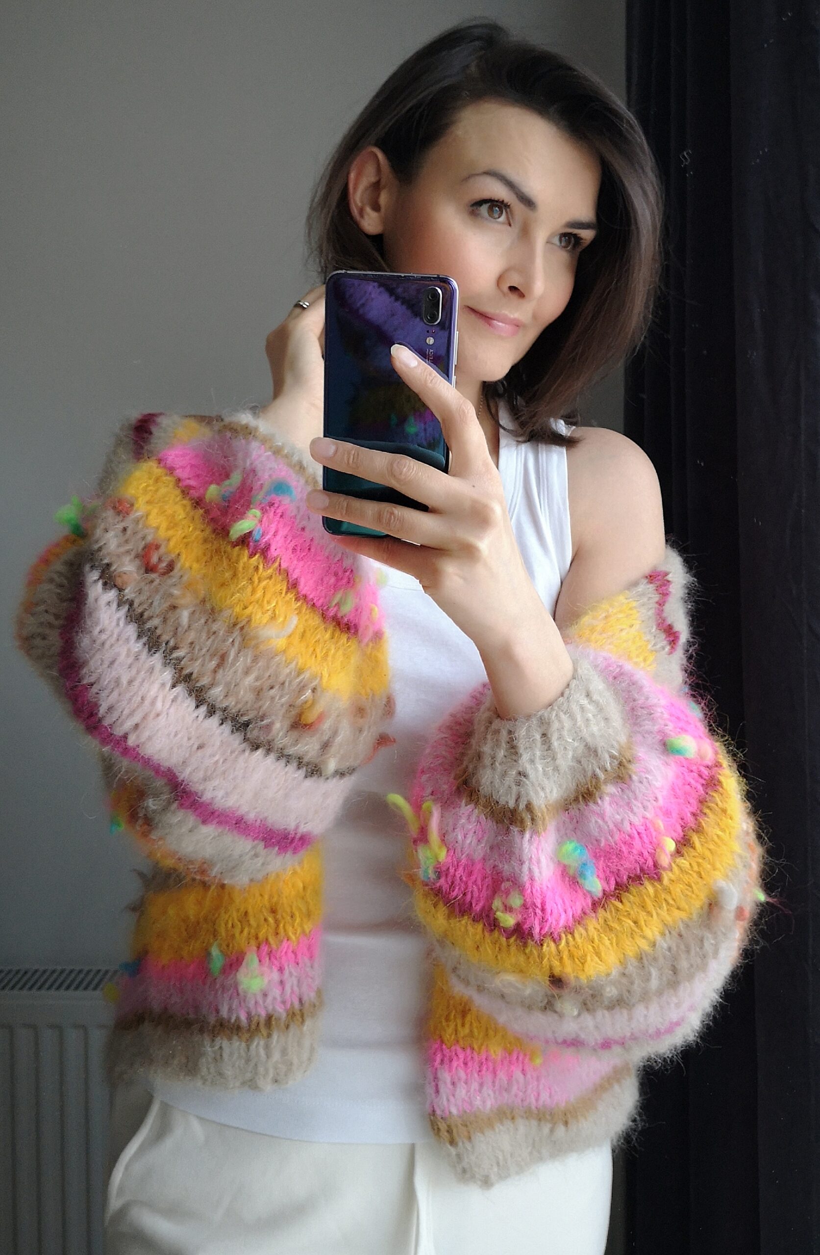 Wielobarwny, energetyczny, kobiecy. Spleciony ręcznie na drutach z włóczkek :alpaki, merino, jedwabiu, moheru i wlóczek fantazyjnych.