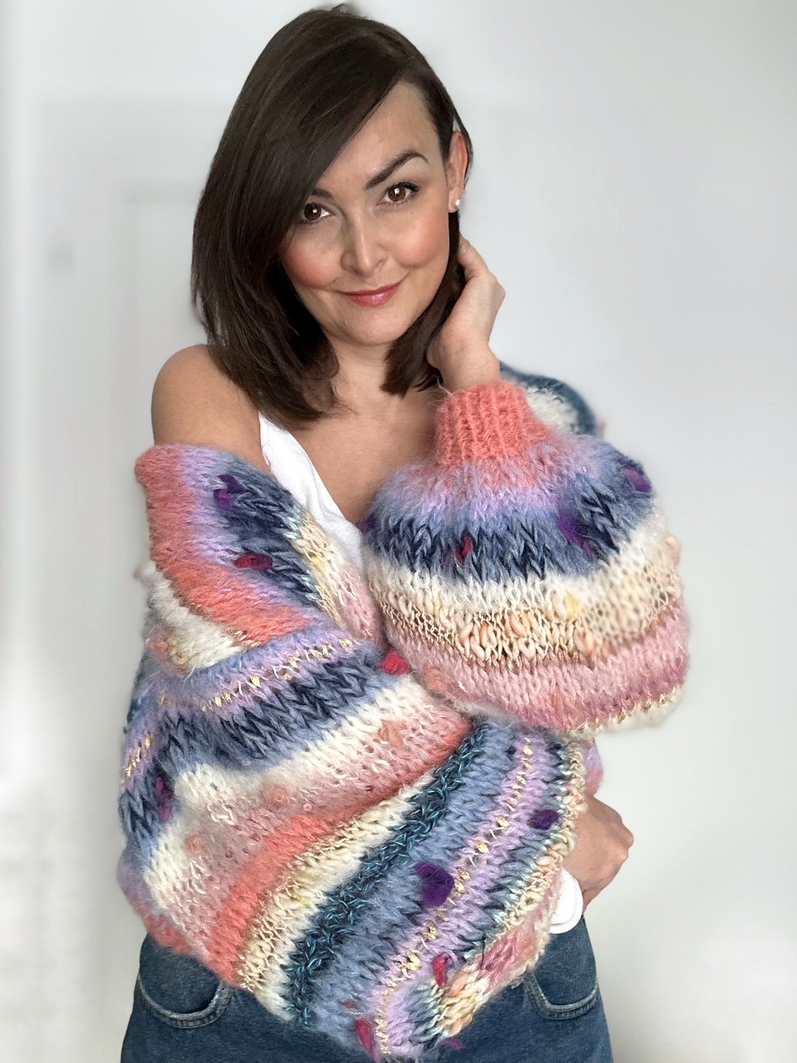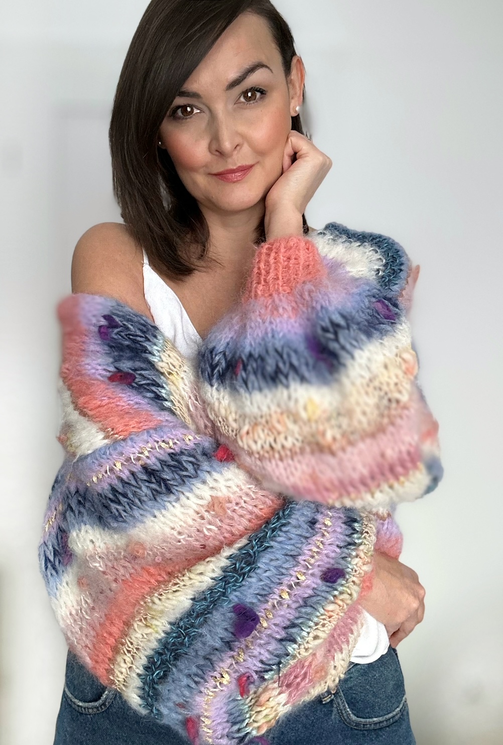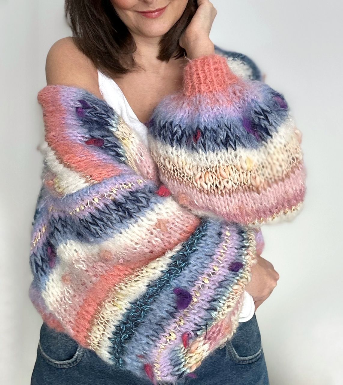 Kardigan Perla spleciony ręcznie na drutach z mieszanki włóczek alpaki, merino, jedwabiu oraz moheru urozmaicony przepiękną włóczką fantazyjną.