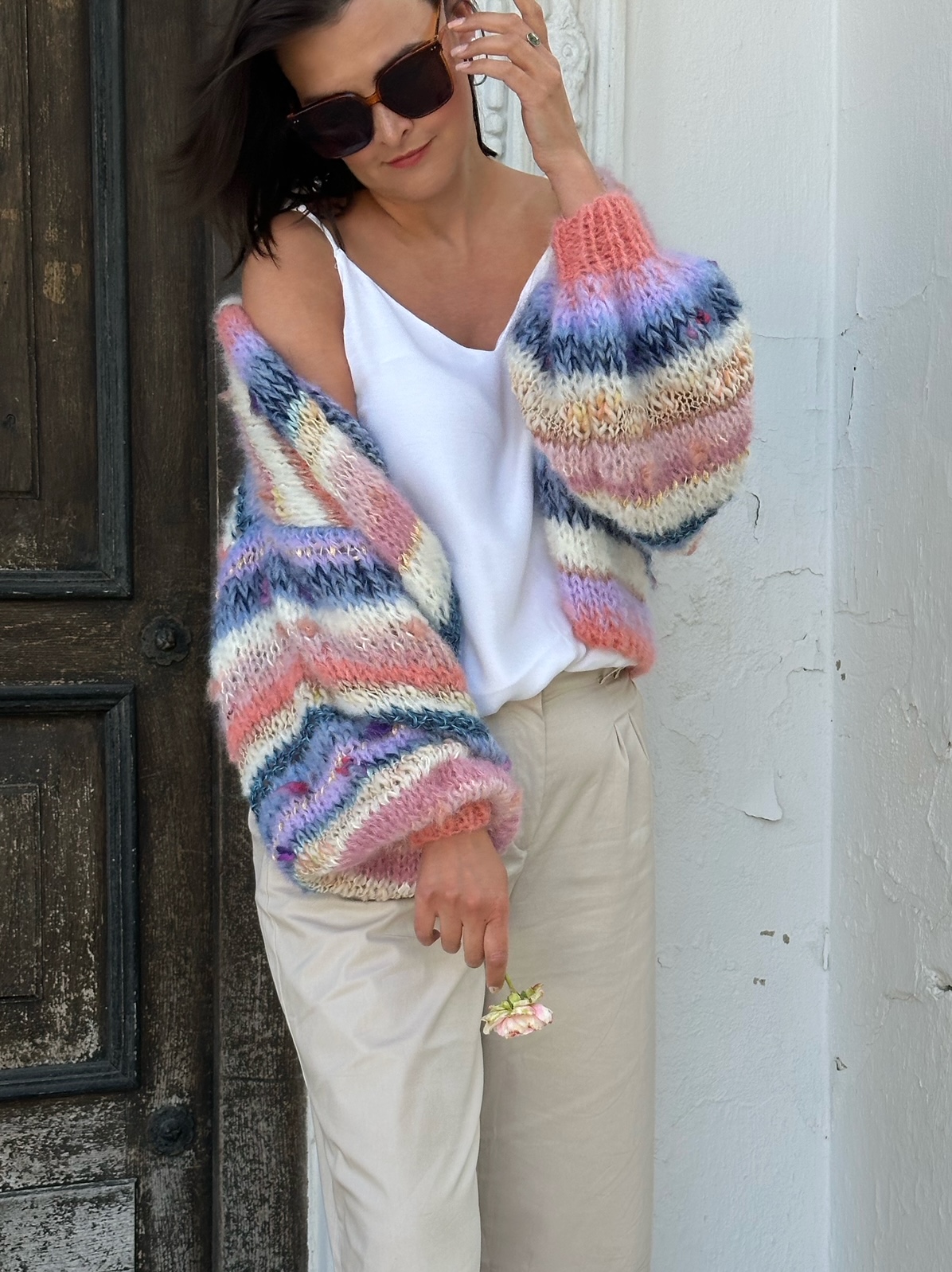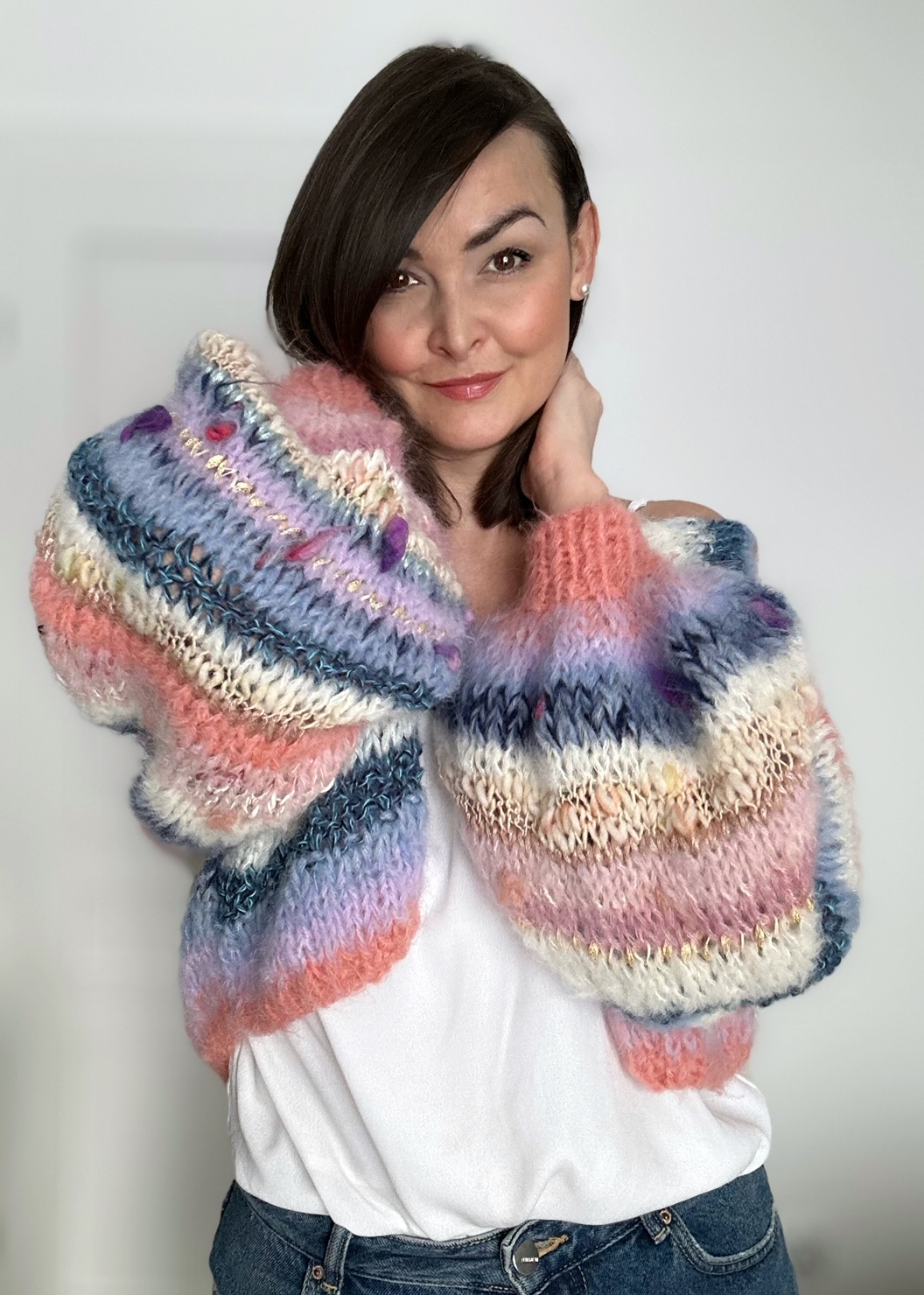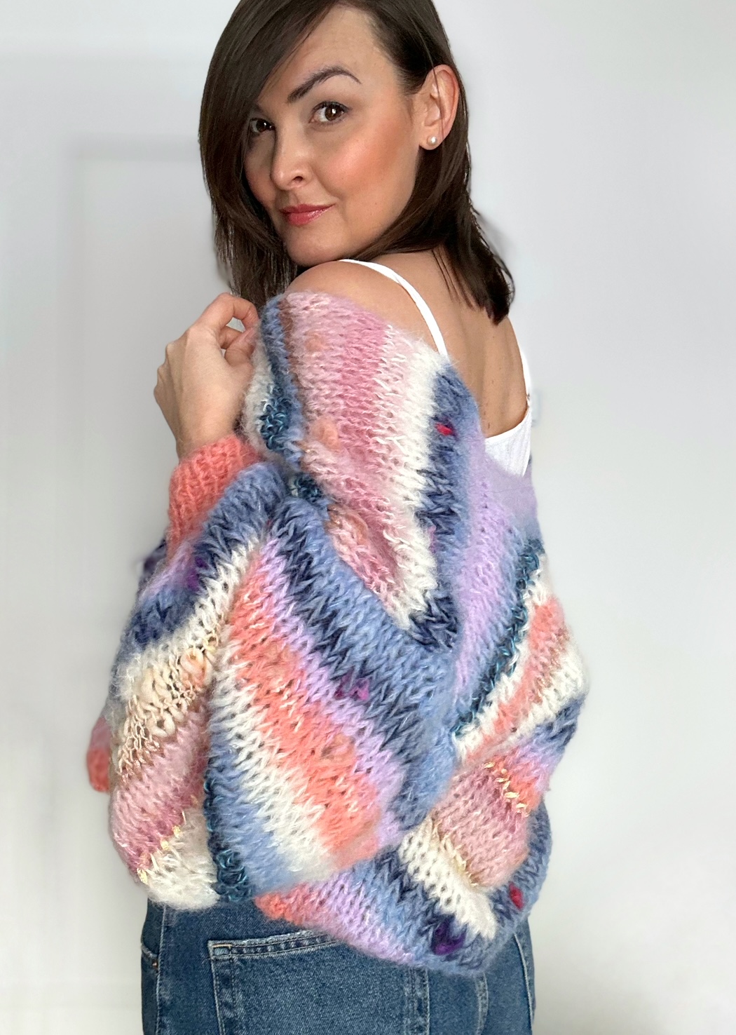 Kardigan Perla spleciony ręcznie na drutach z mieszanki włóczek alpaki, merino, jedwabiu oraz moheru urozmaicony przepiękną włóczką fantazyjną.