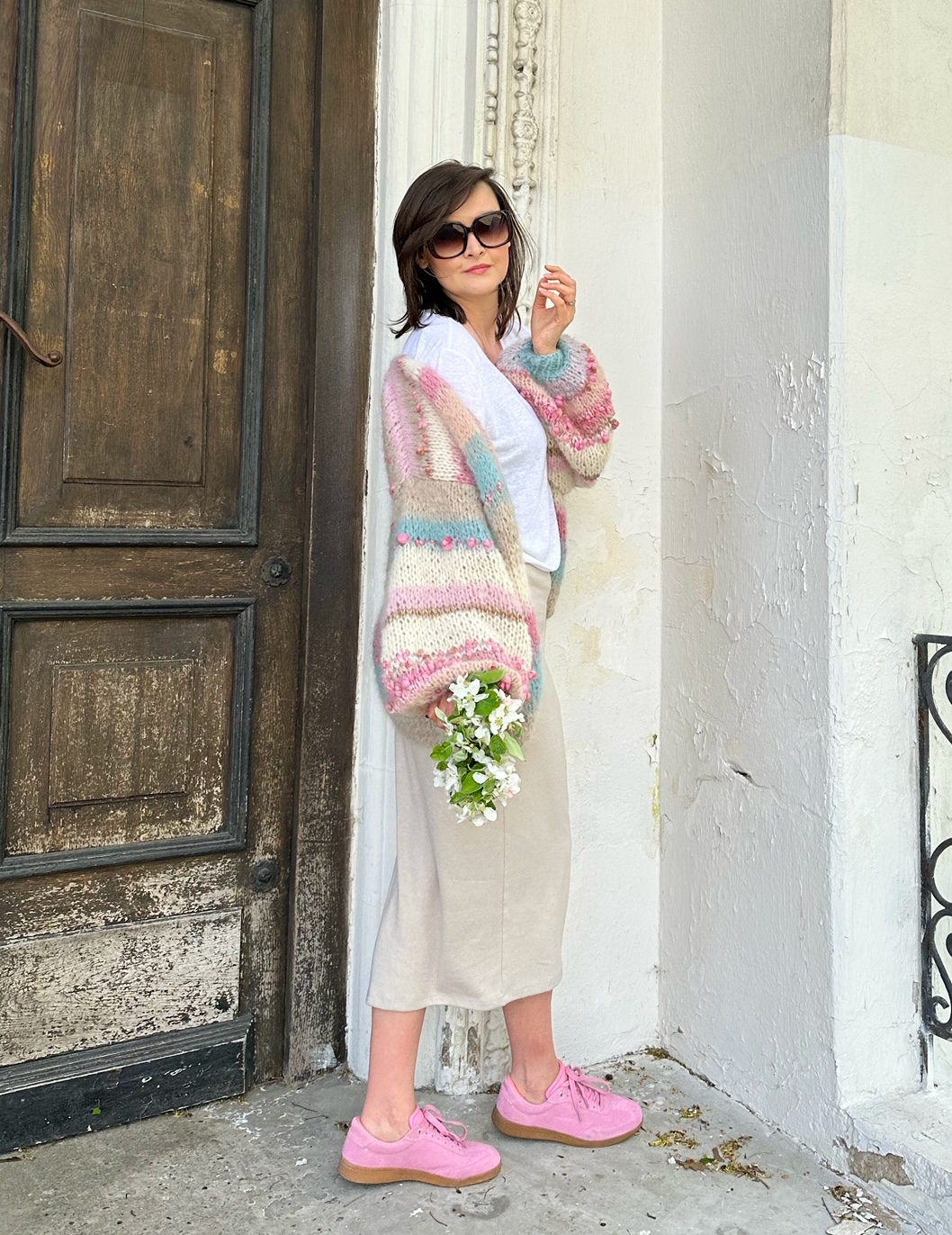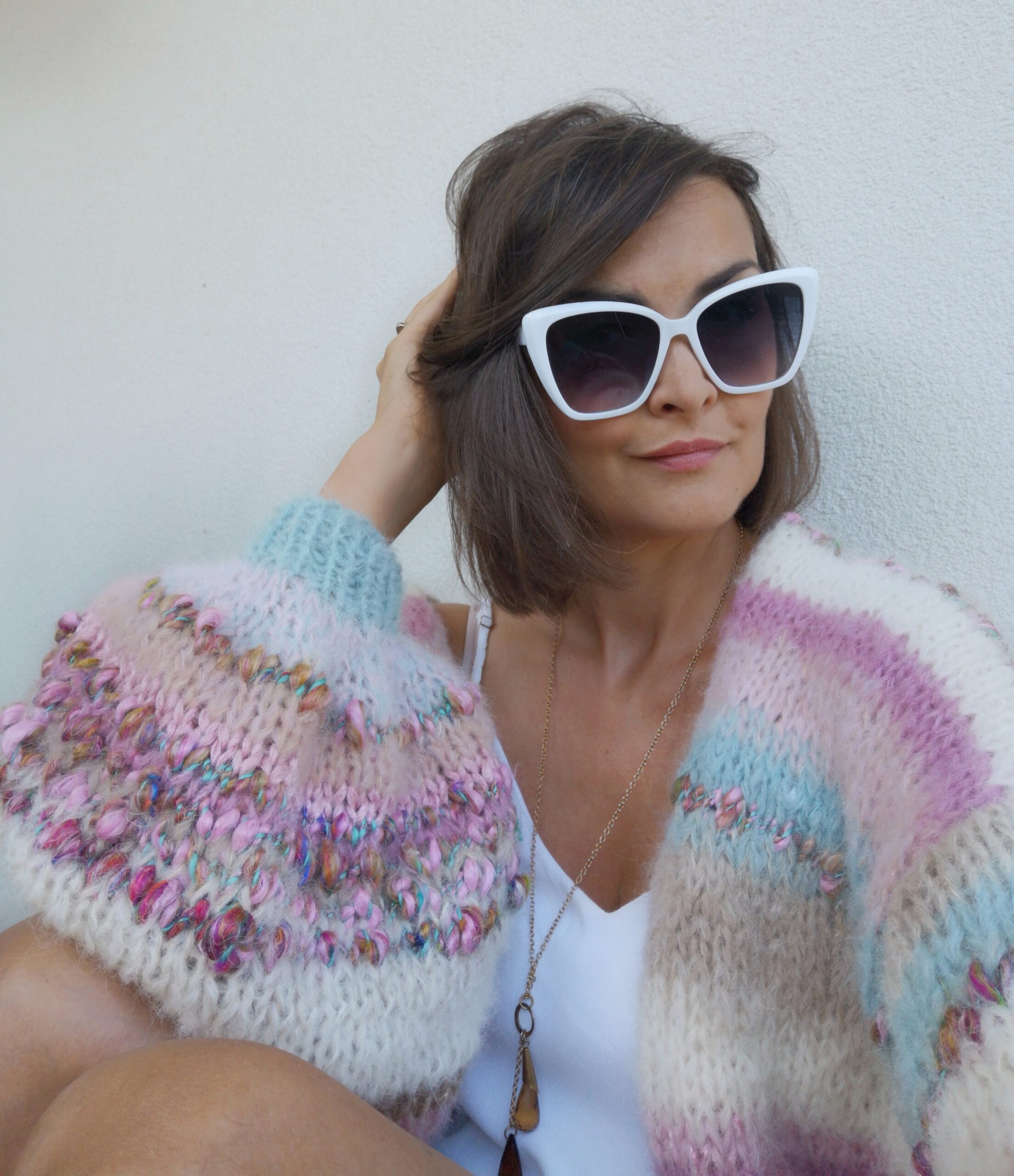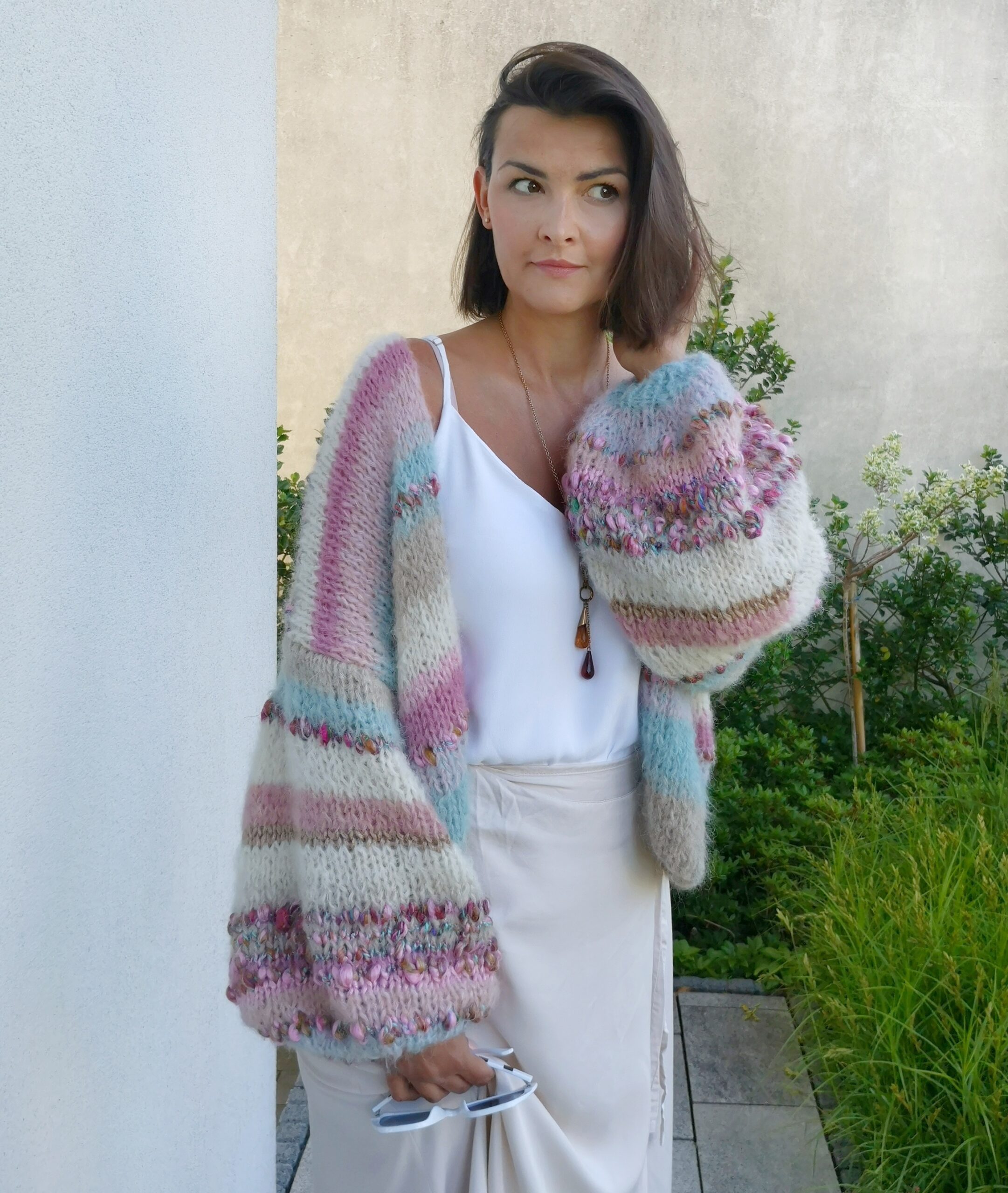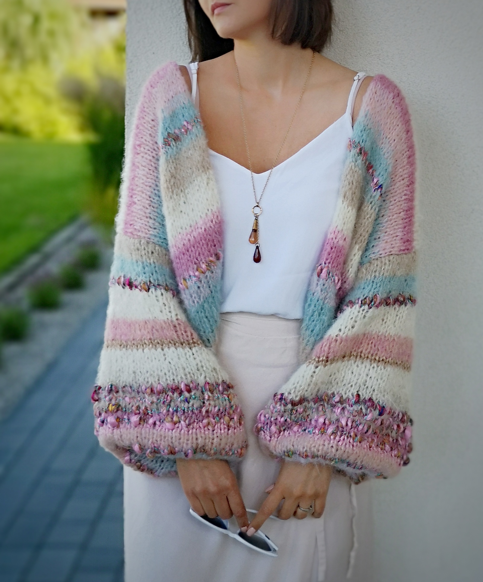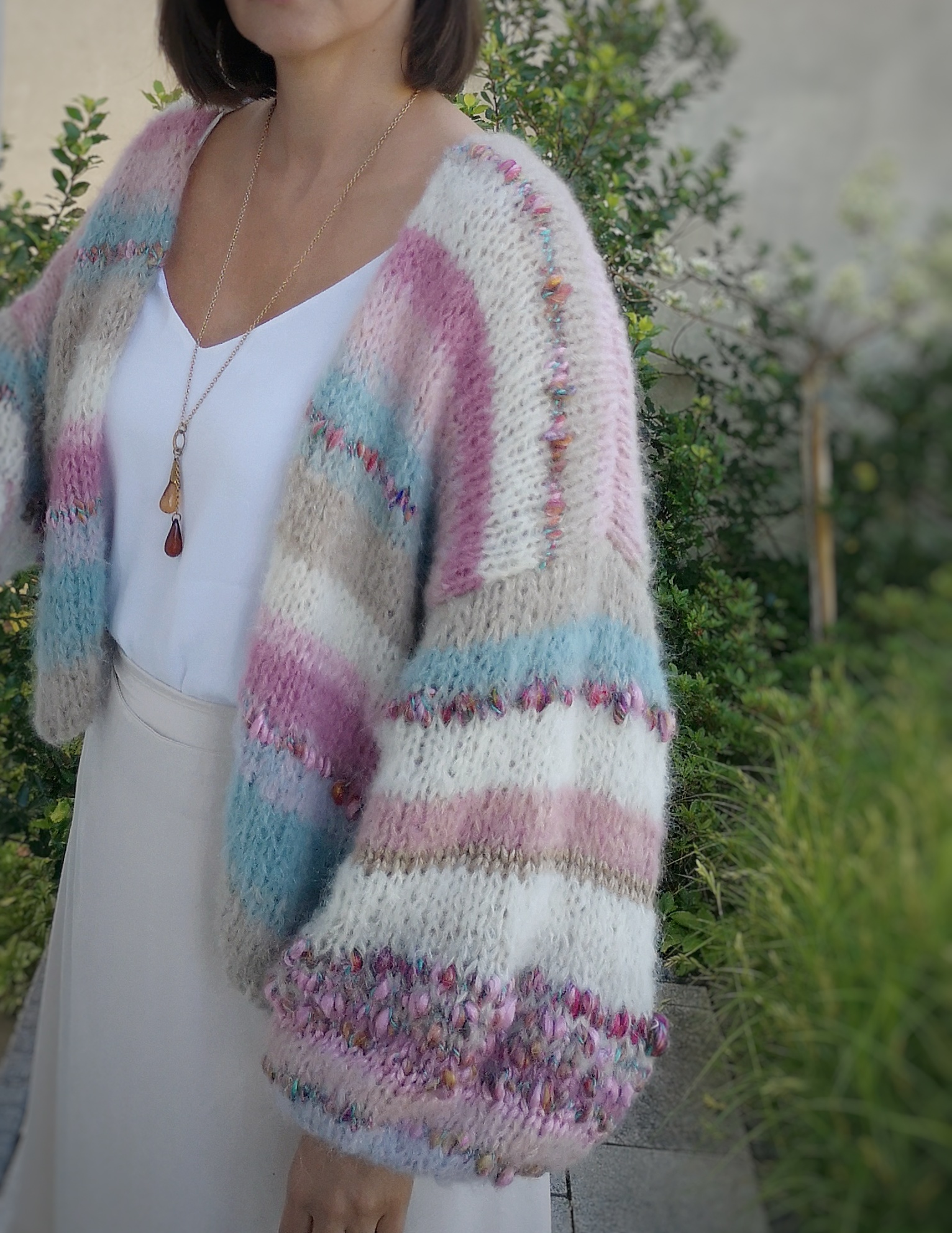 To niezwykłe połączenie delikatnych kolorów w pasach, przechodzących jeden w drugi , urozmaiconych piękną , fantazyjna włóczką. Szerokie rękawy dodają mu uroku, pazurka i oryginalności.