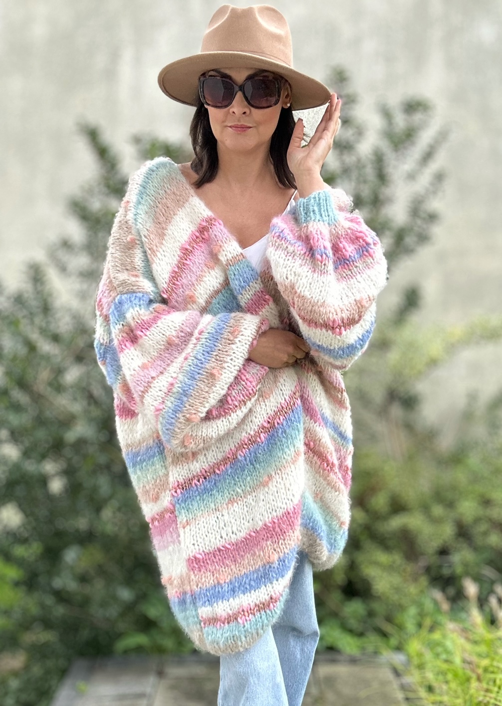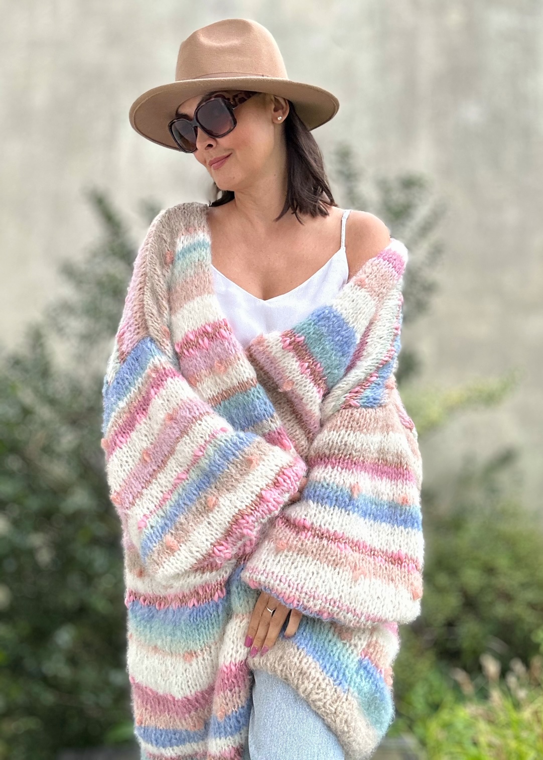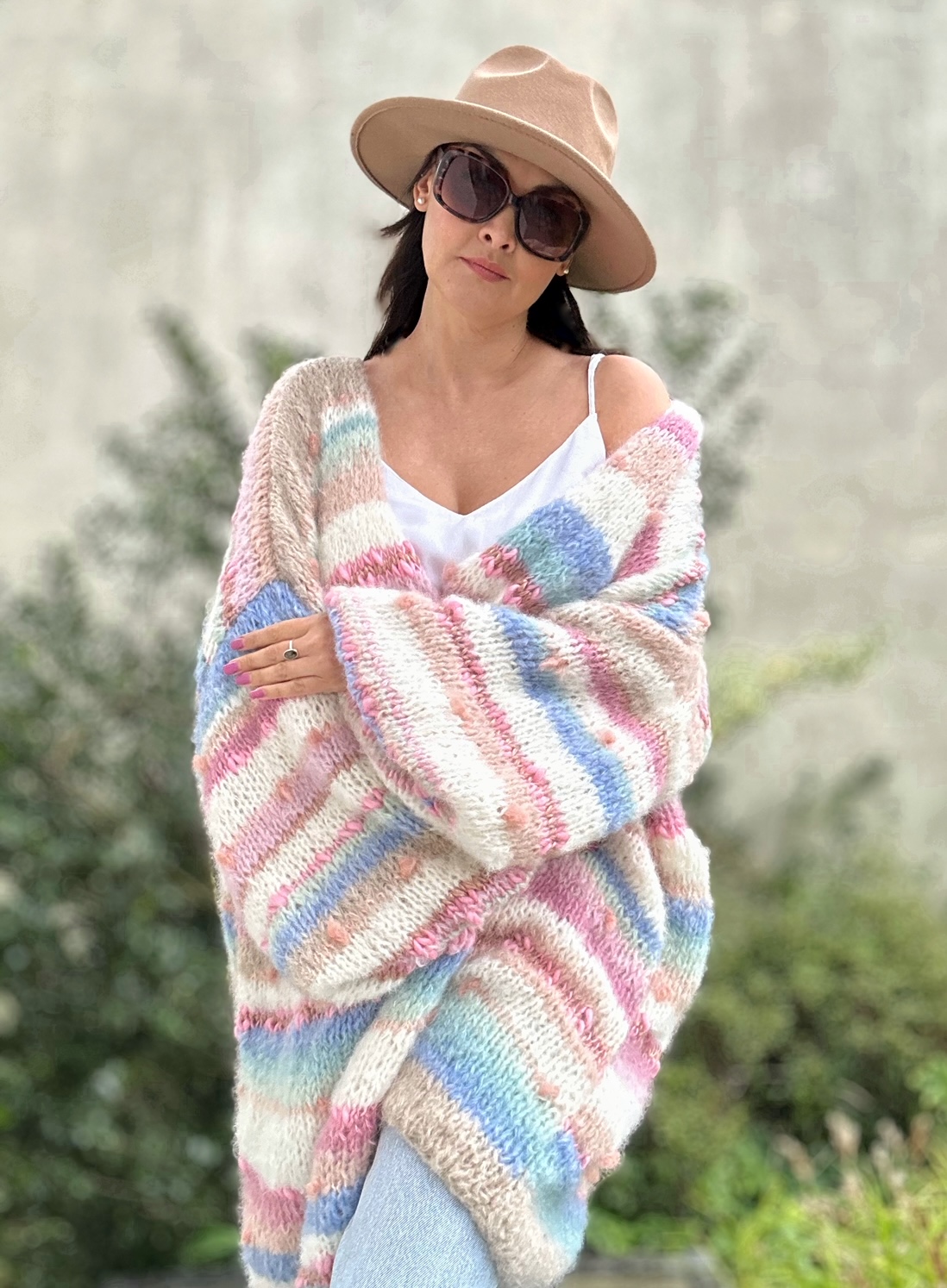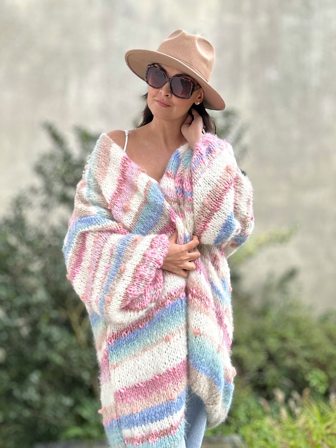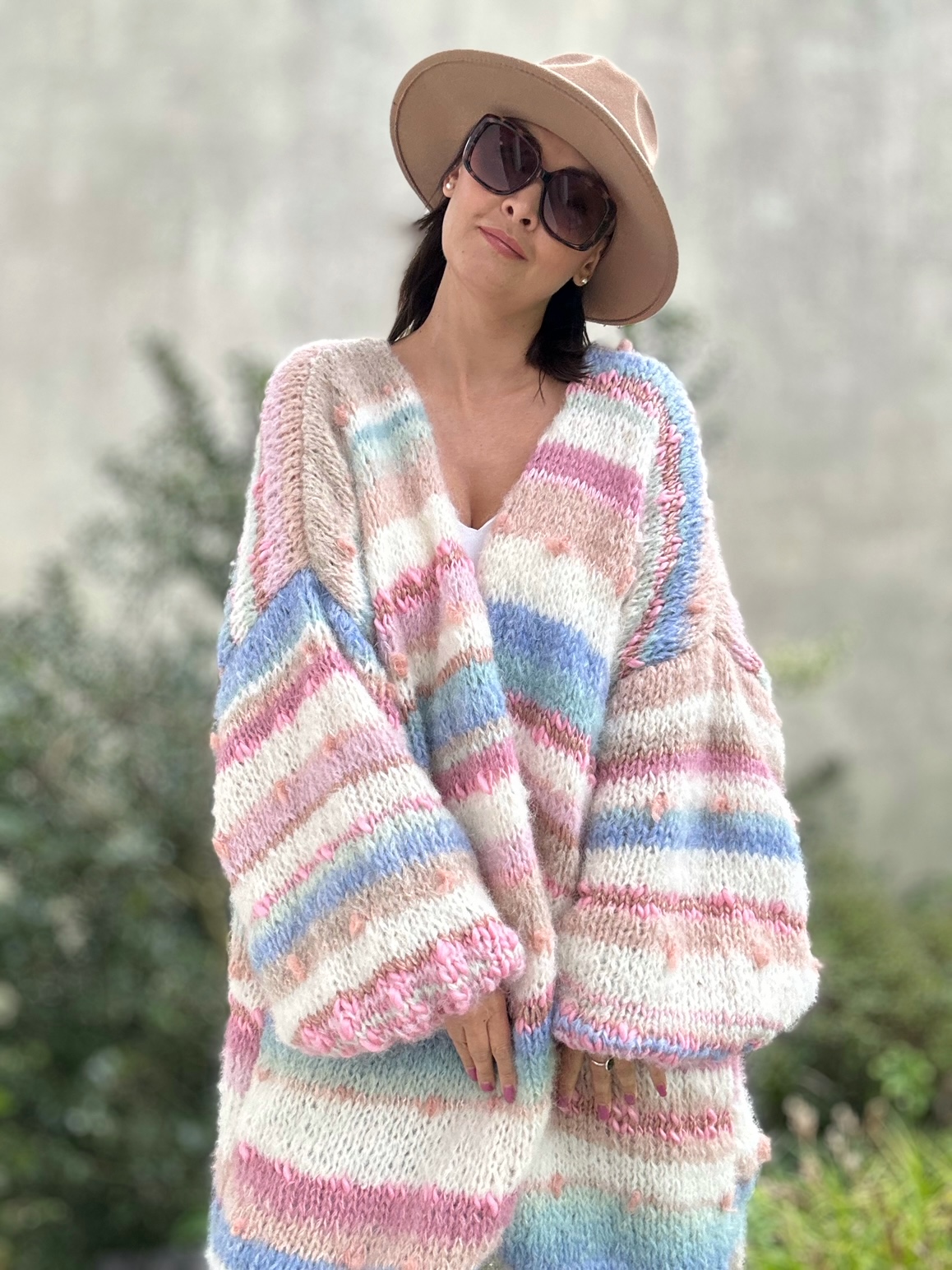 To niezwykłe połączenie delikatnych kolorów w pasach, przechodzących jeden w drugi , urozmaiconych piękną , fantazyjna włóczką. Szerokie rękawy dodają mu uroku, pazurka i oryginalności.
