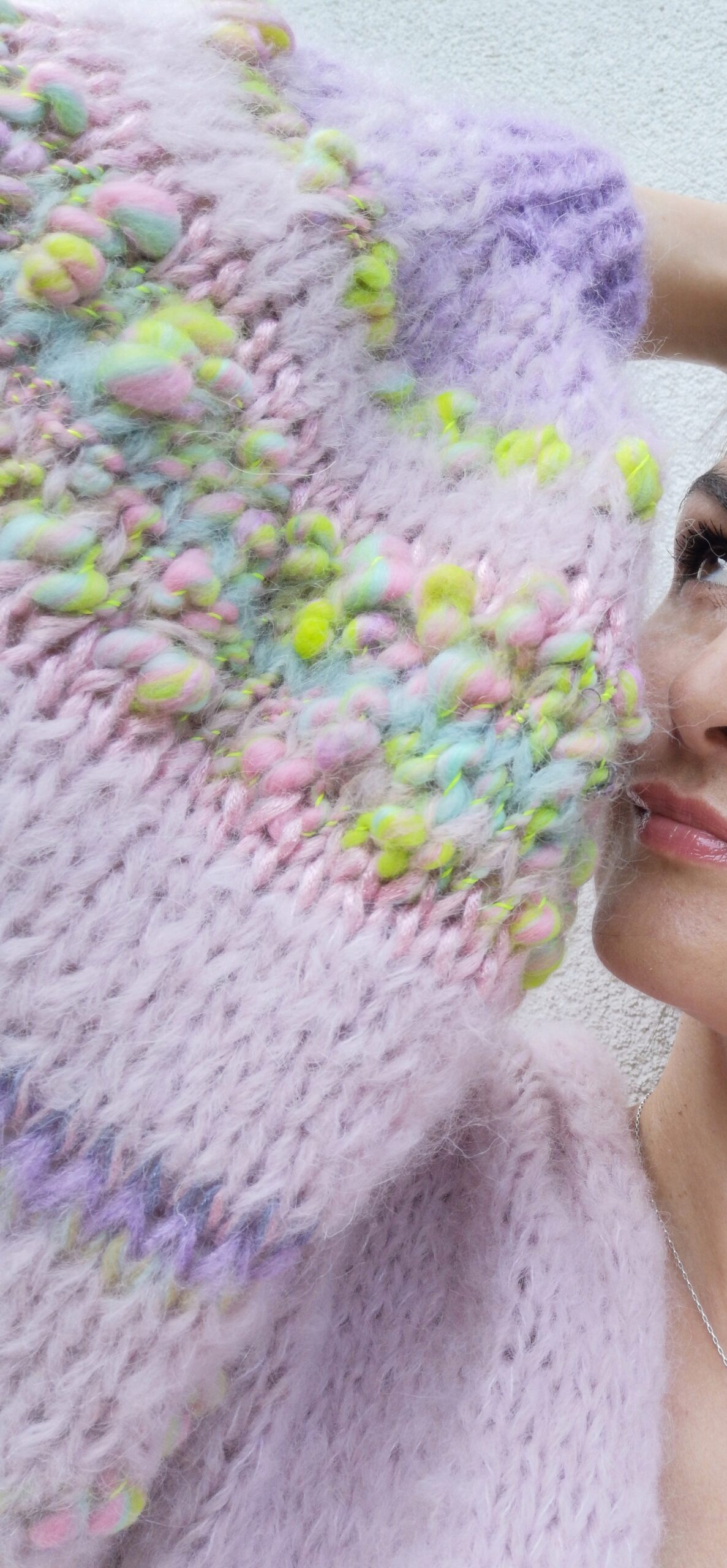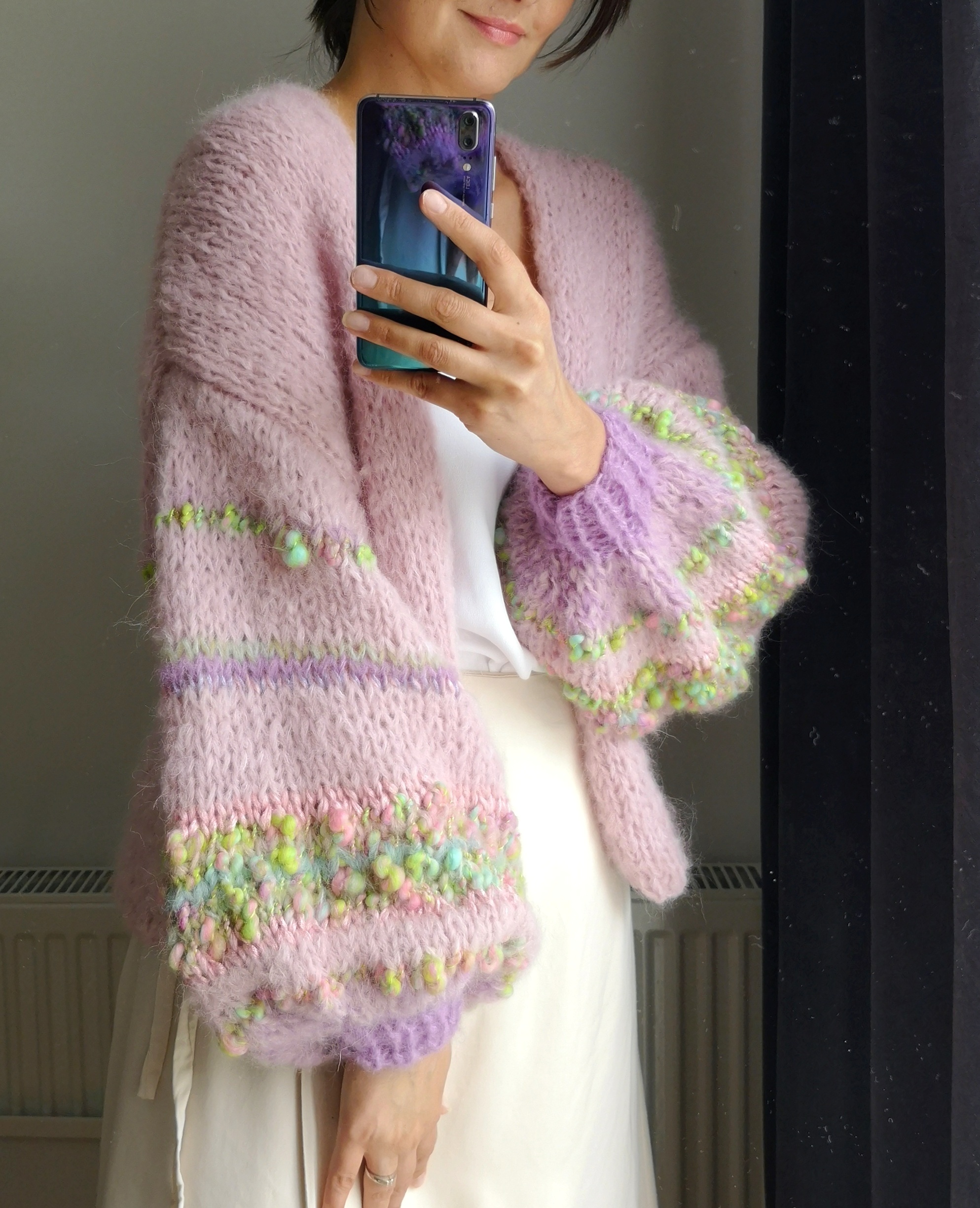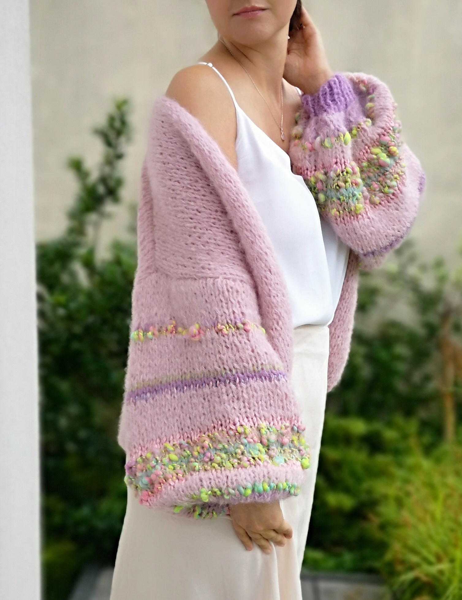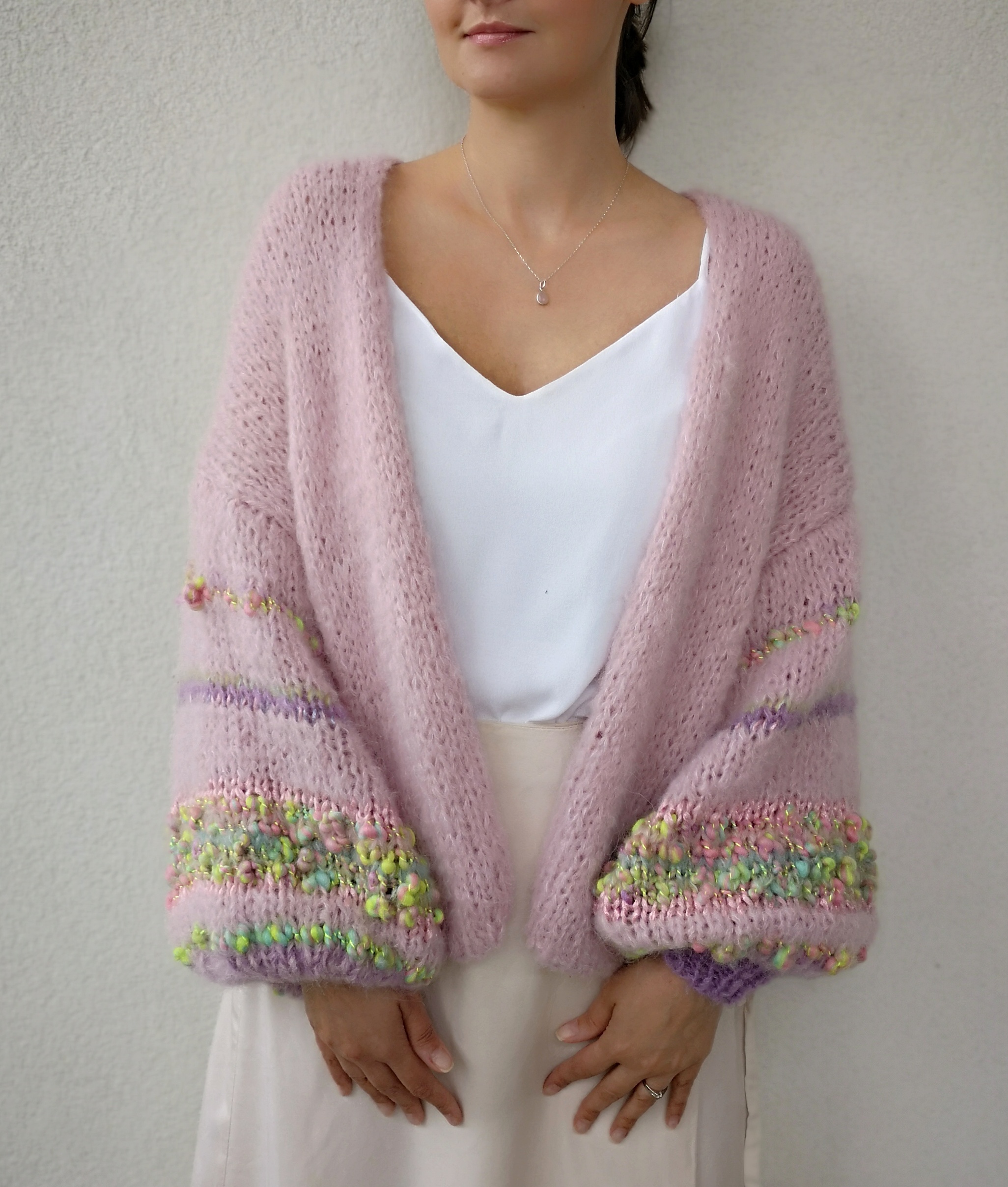 Kardigan Rosa spleciony ręcznie na drutach z alpaki, merino i jedwabiu oraz dodatku przepięknej naturalnej włóczki fantazyjnej. Szerokie rękawy dodają mu uroku i charakteru. Lekki, przewiewny, naturalny, kobiecy w pięknym kolorze zgaszonego różu. Idealny do każdej stylizacji, z pewnością wyróżni Cię z tłumu.