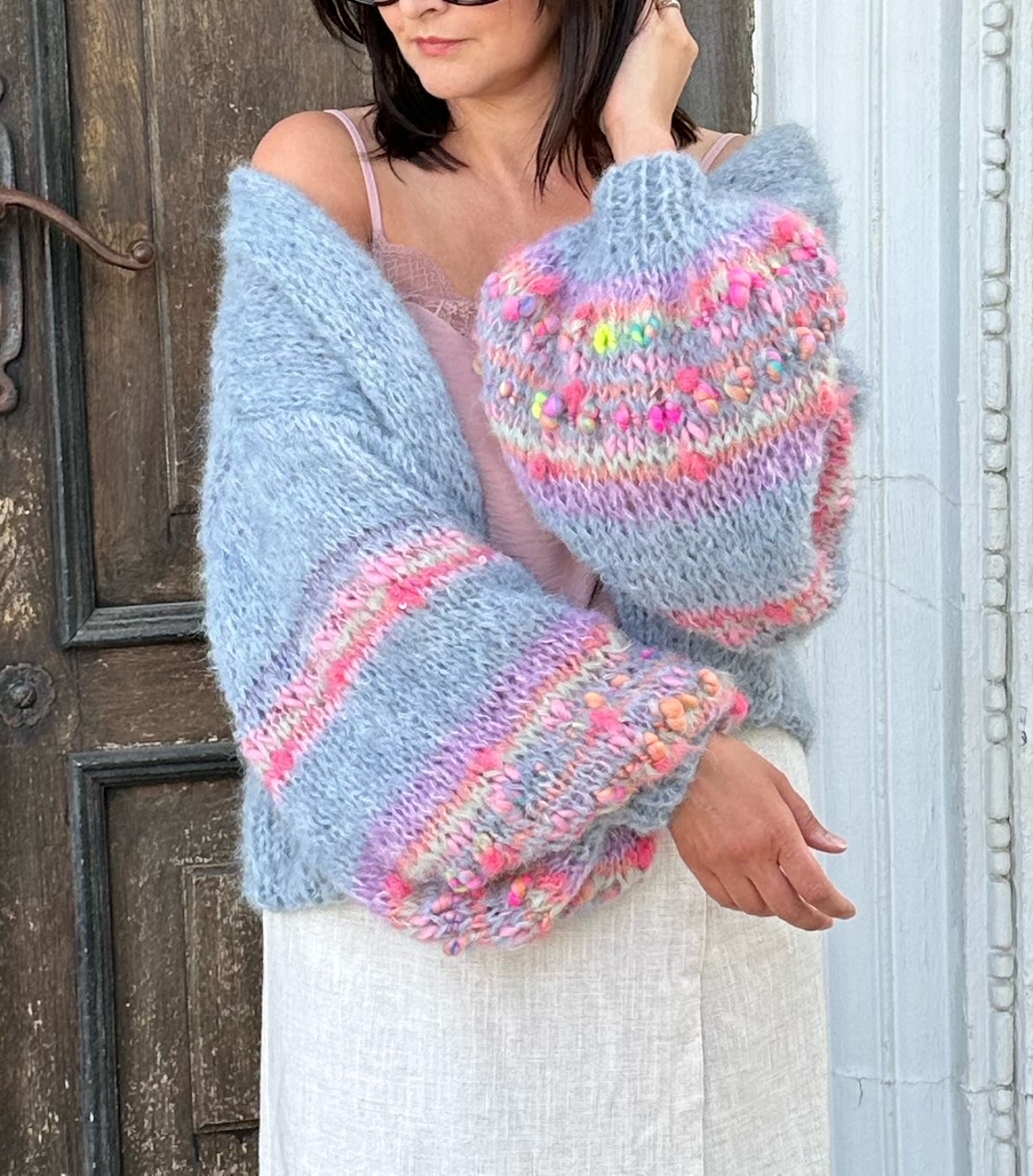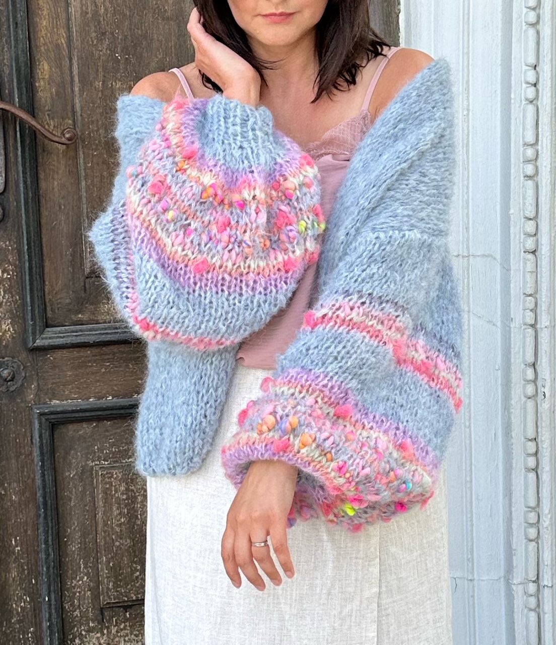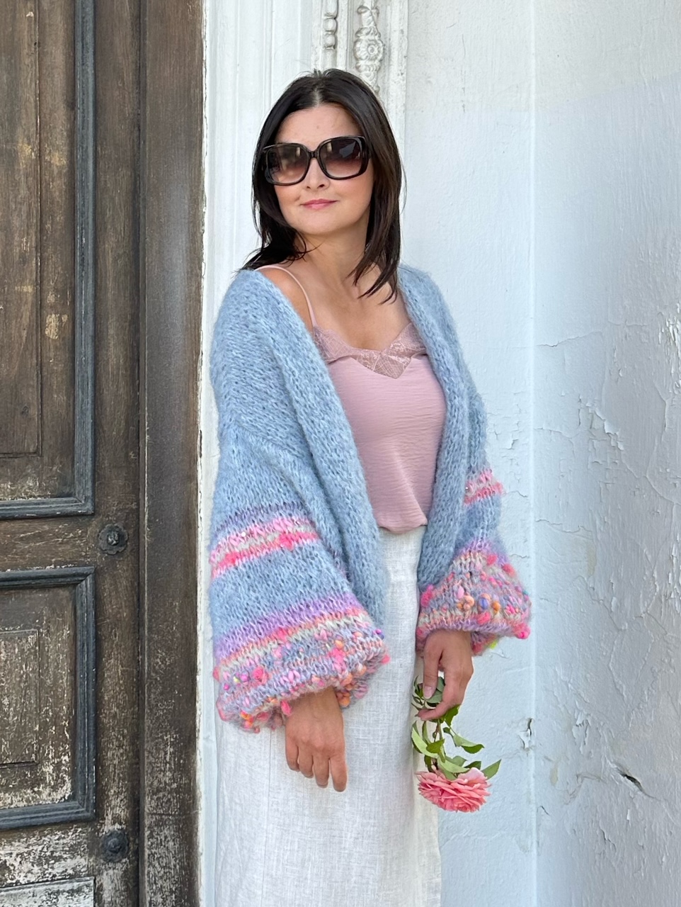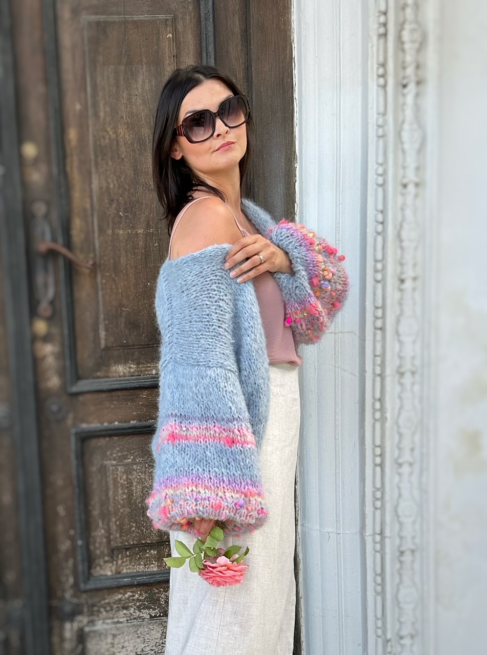 Lekki , przewiewny i efektowny kardigan Selena to przepiękna propozycja na wiosenno letni czas. Kardigan ma szerokie rękawy, z dodatkiem efektownych i fantazyjnych włóczek. Kardigan jest w pięknym , odcieniu spokojnego, zgaszonego błękitu Kobiecy i oryginalny. Spleciony jest z naturalnych włóczek (podwójna nitka).