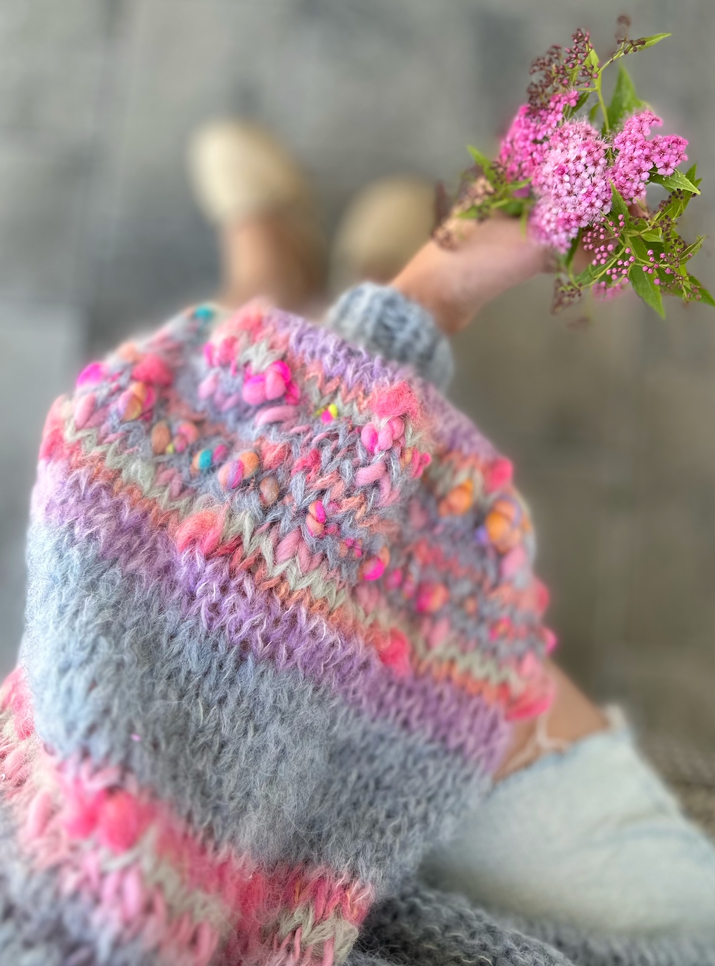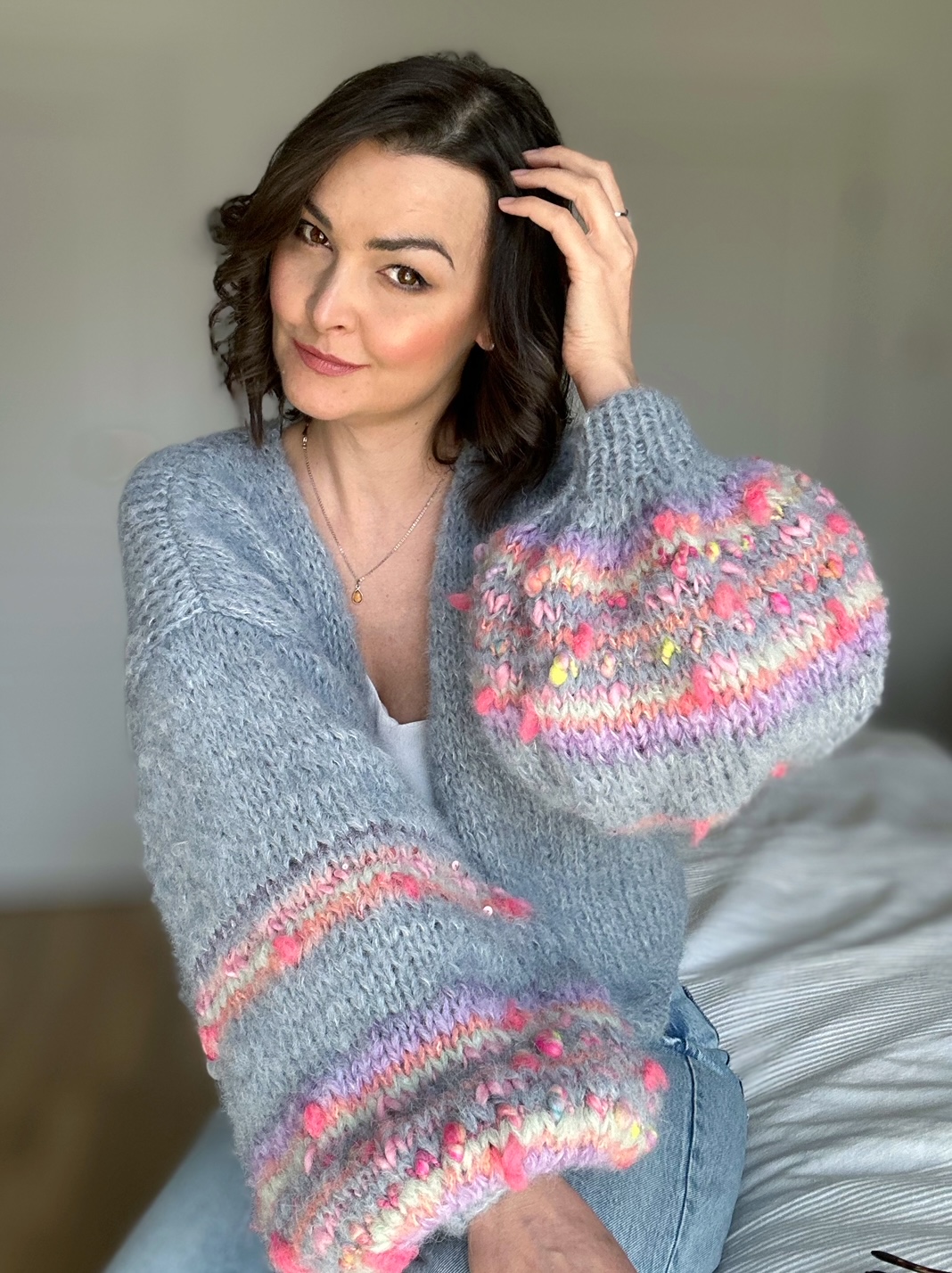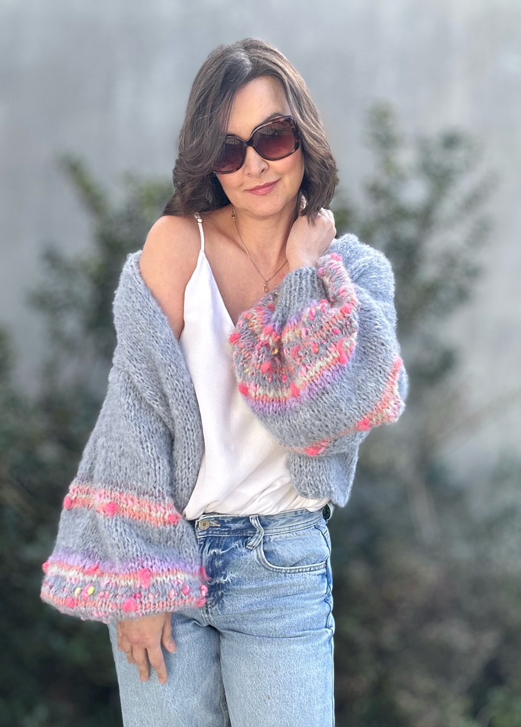 Lekki , przewiewny i efektowny kardigan Selena to przepiękna propozycja na wiosenno letni czas. Kardigan ma szerokie rękawy, z dodatkiem efektownych i fantazyjnych włóczek. Kardigan jest w pięknym , odcieniu spokojnego, zgaszonego błękitu Kobiecy i oryginalny. Spleciony jest z naturalnych włóczek (podwójna nitka).