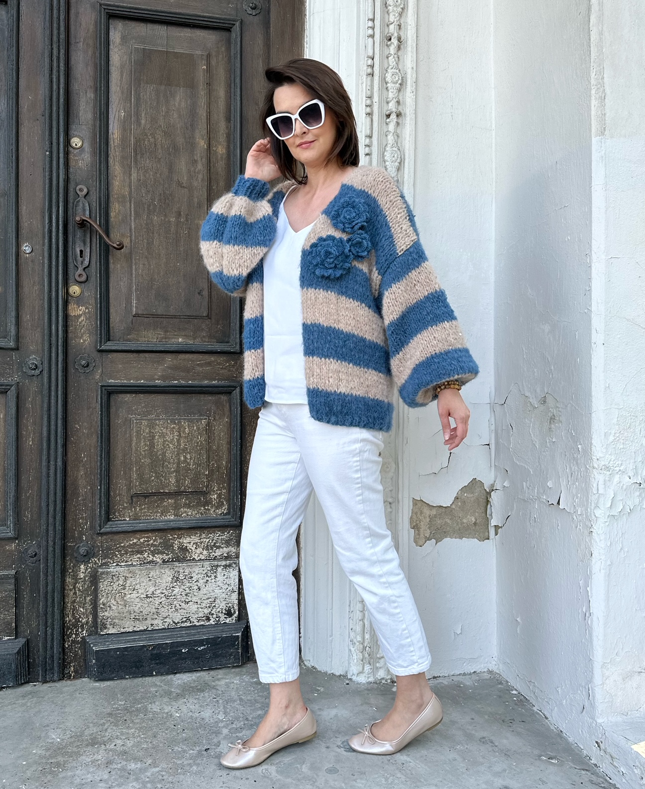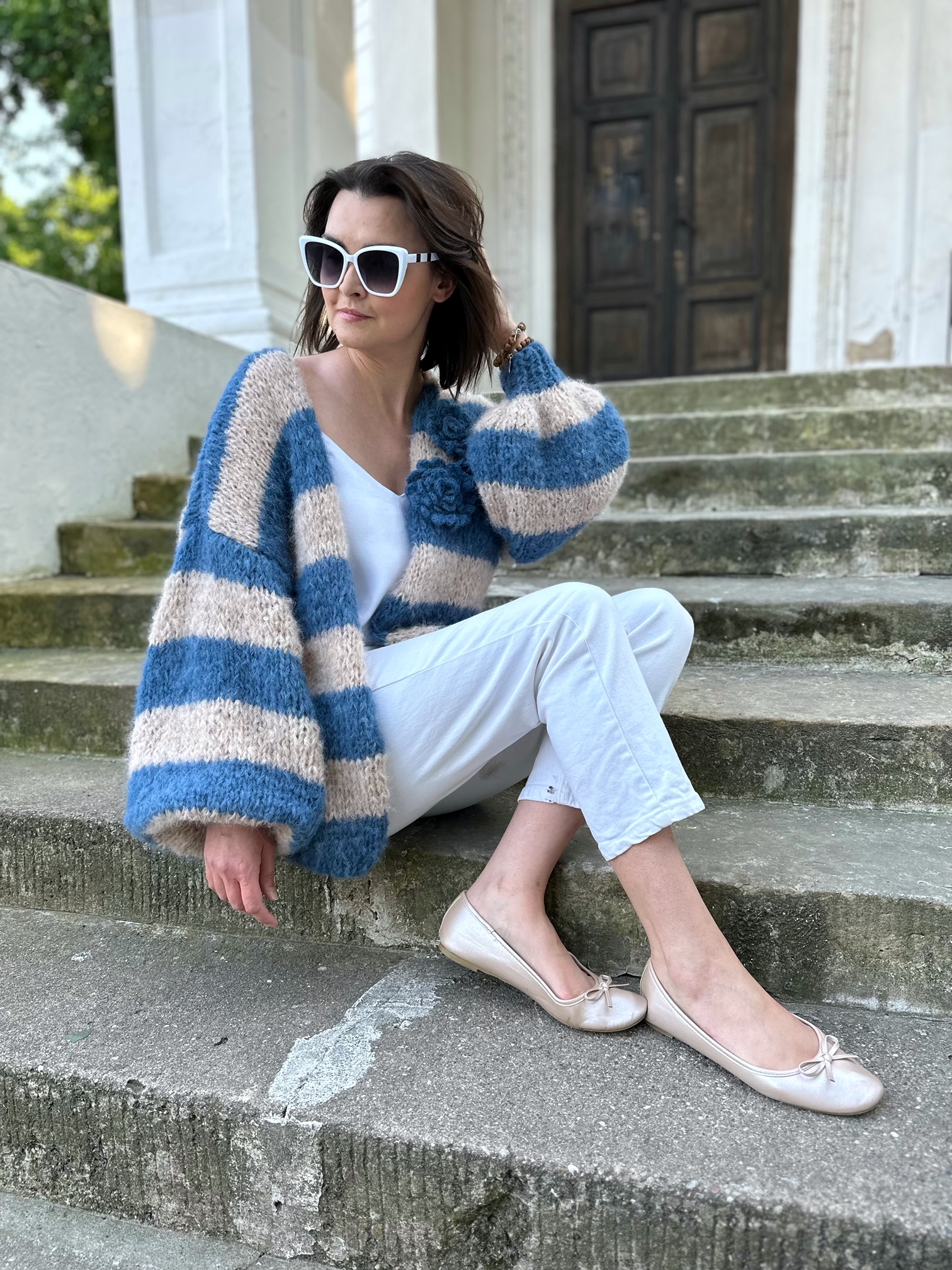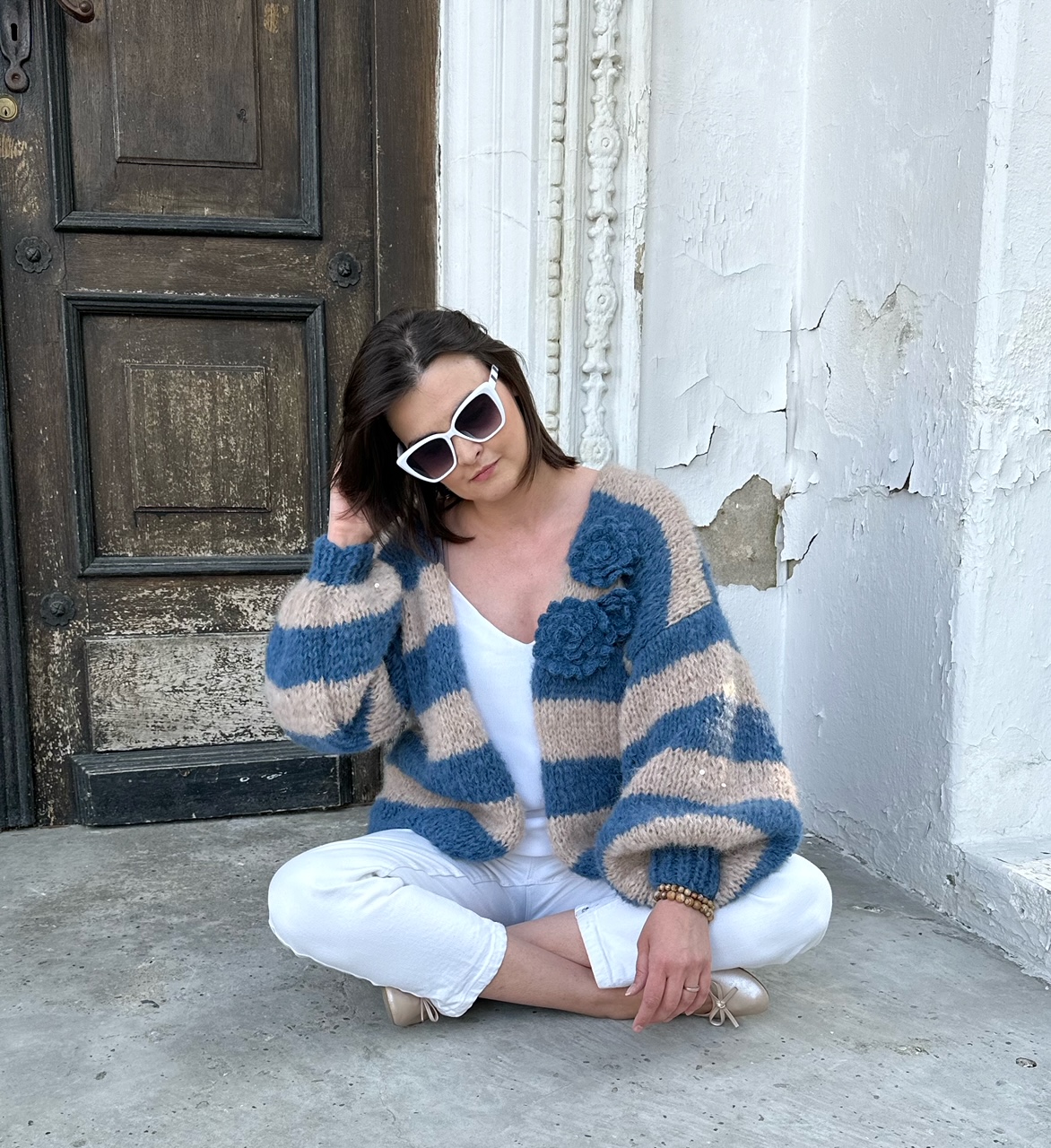 Kardigan Sisi z szerokimi rękawami, spleciony na drutach z dwóch niteczek: alpaki, merino i jedwabiu , z dodatkiem włoczki z delikatnymi cekinami, które mienią się w słońcu. Dodatkowym elementem, który dodaje mu uroku i oryginalności są kwiaty zrobione na szydełku. Modny, efektowny, naturalny. Kolory to beż oraz zgaszony ciemniejszy niebieski, Idealny do wielu stylizacji i do wielu kolorów bazowych Twojej stylizacji. Jest miękki, lekki , przewiewny. Nie jest gruby, idealny na chłodne letnie wieczory, rześkie poranki, wietrzne plaże, spotkania i eleganckie przyjęcia.