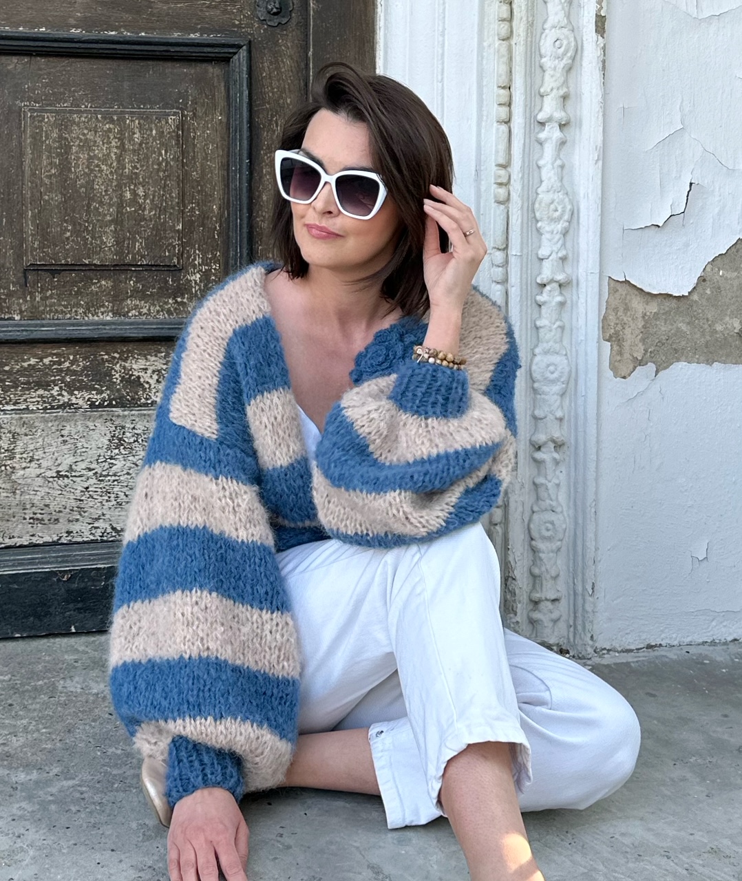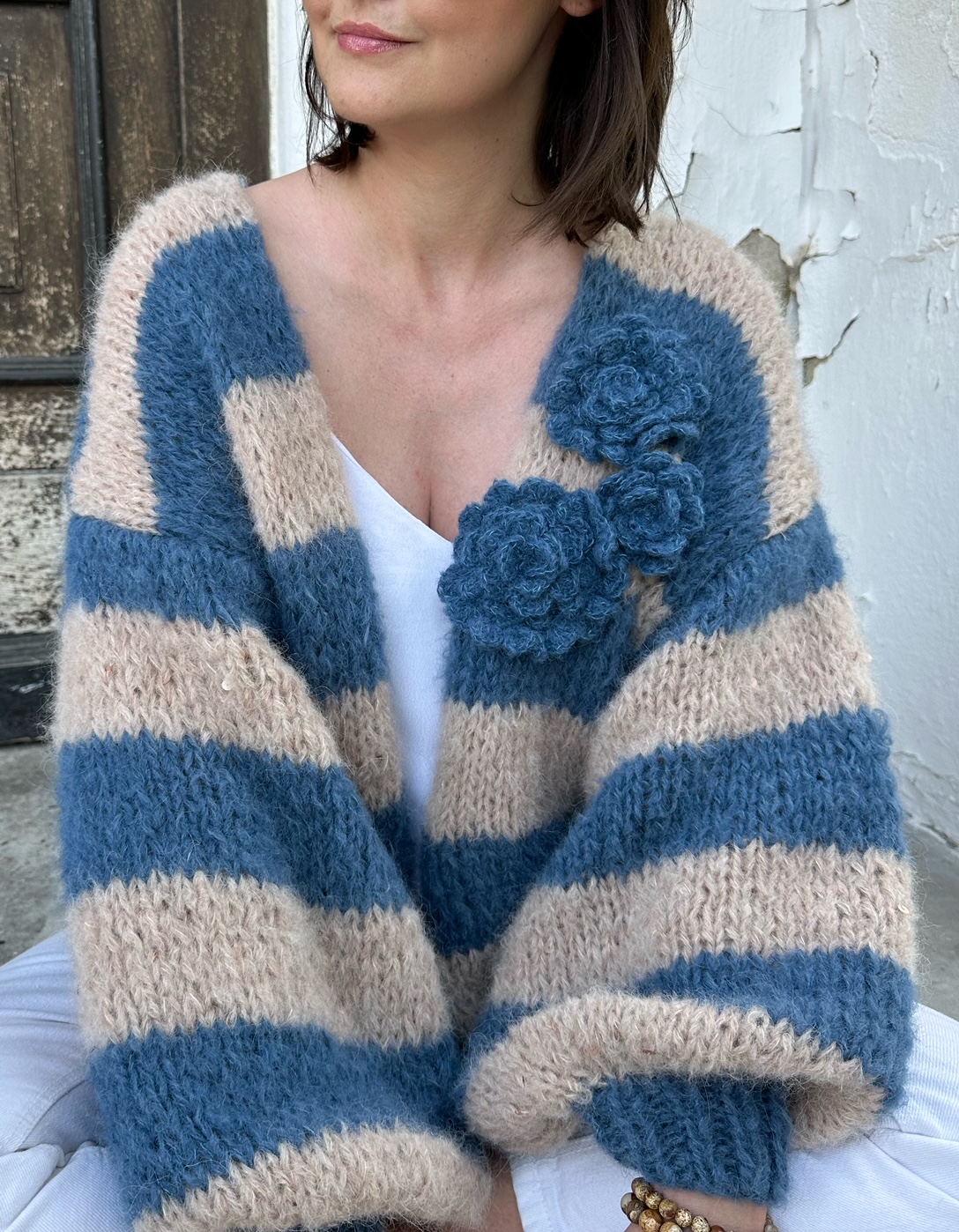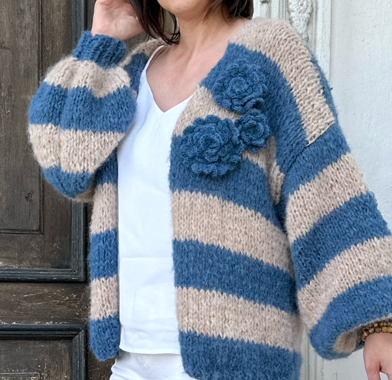Kardigan Sisi z szerokimi rękawami, spleciony na drutach z dwóch niteczek: alpaki, merino i jedwabiu , z dodatkiem włoczki z delikatnymi cekinami, które mienią się w słońcu. Dodatkowym elementem, który dodaje mu uroku i oryginalności są kwiaty zrobione na szydełku. Modny, efektowny, naturalny. Kolory to beż oraz zgaszony ciemniejszy niebieski, Idealny do wielu stylizacji i do wielu kolorów bazowych Twojej stylizacji. Jest miękki, lekki , przewiewny. Nie jest gruby, idealny na chłodne letnie wieczory, rześkie poranki, wietrzne plaże, spotkania i eleganckie przyjęcia.