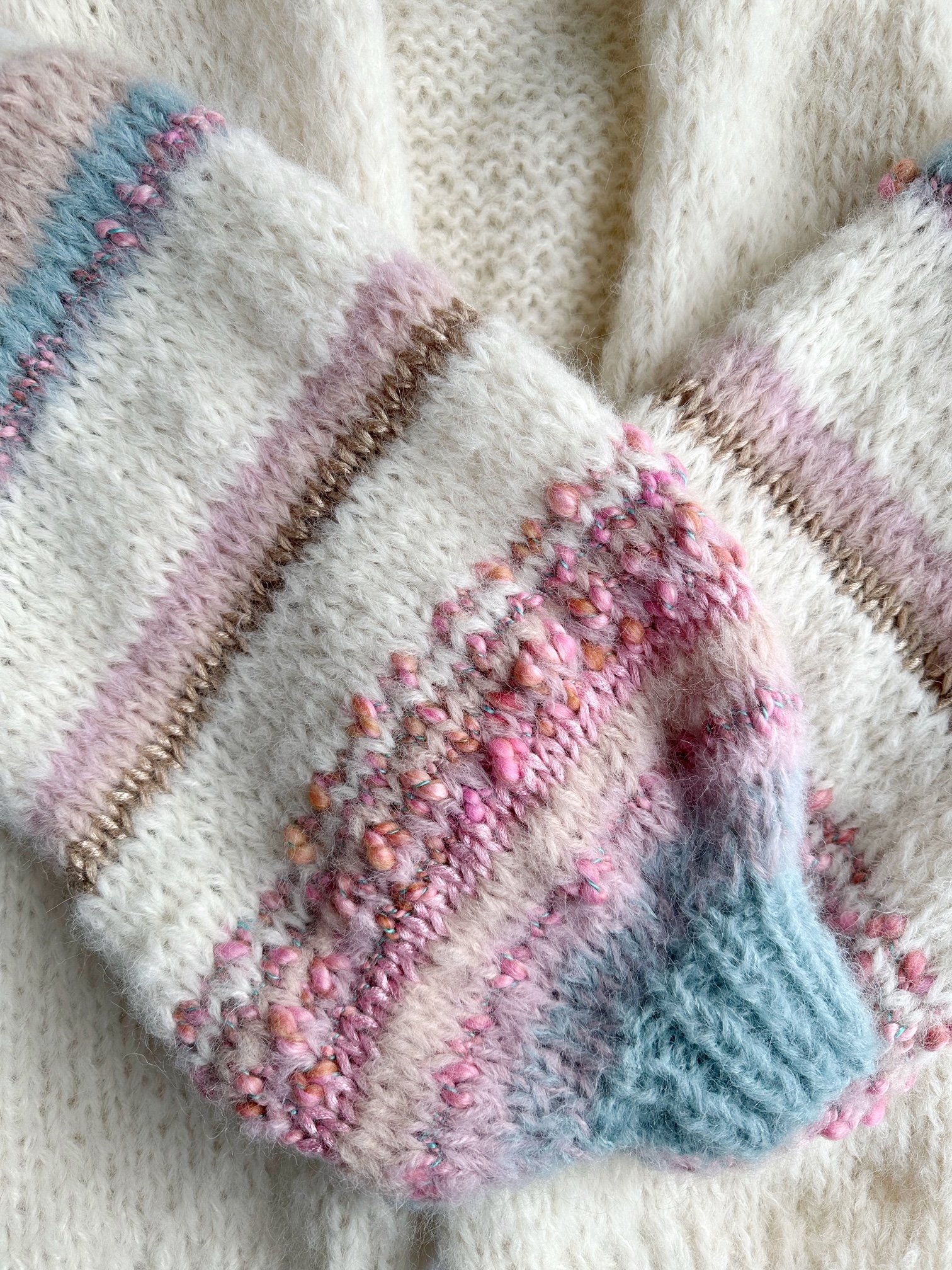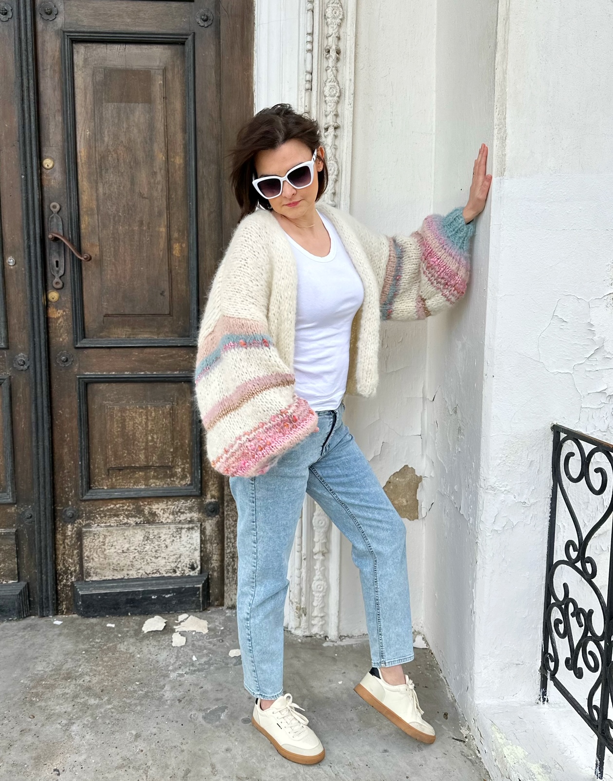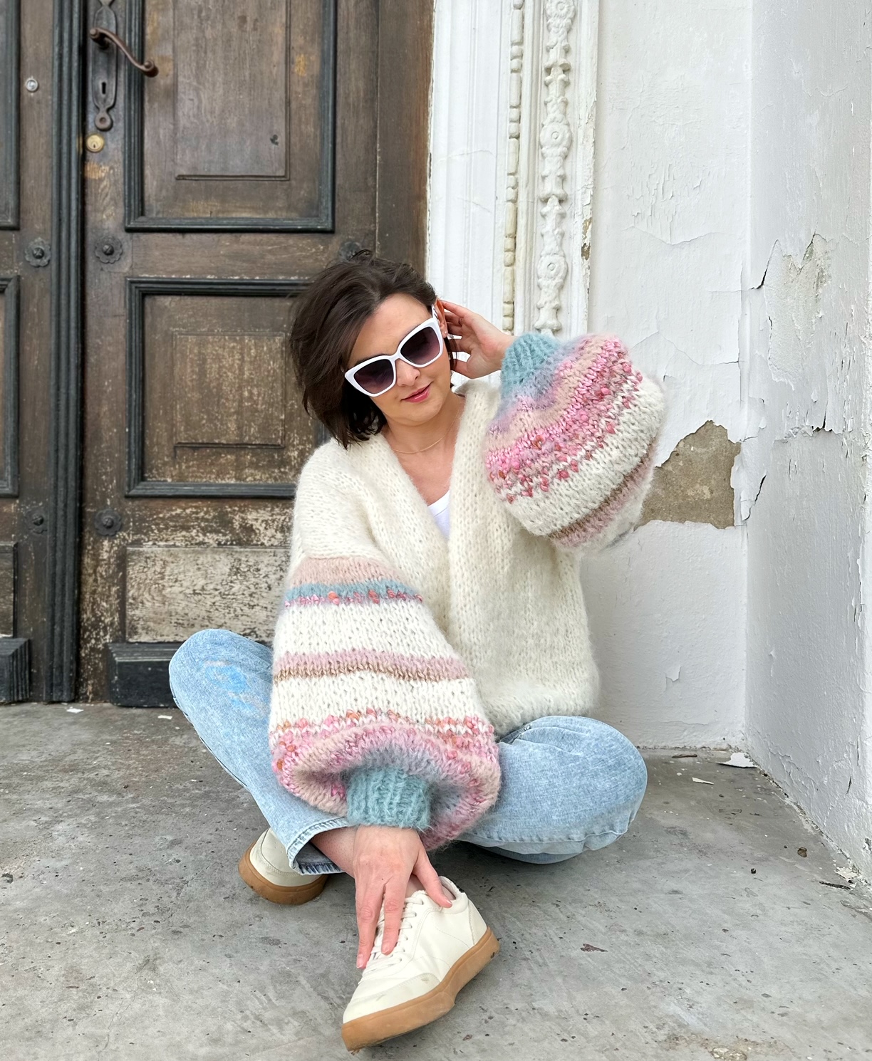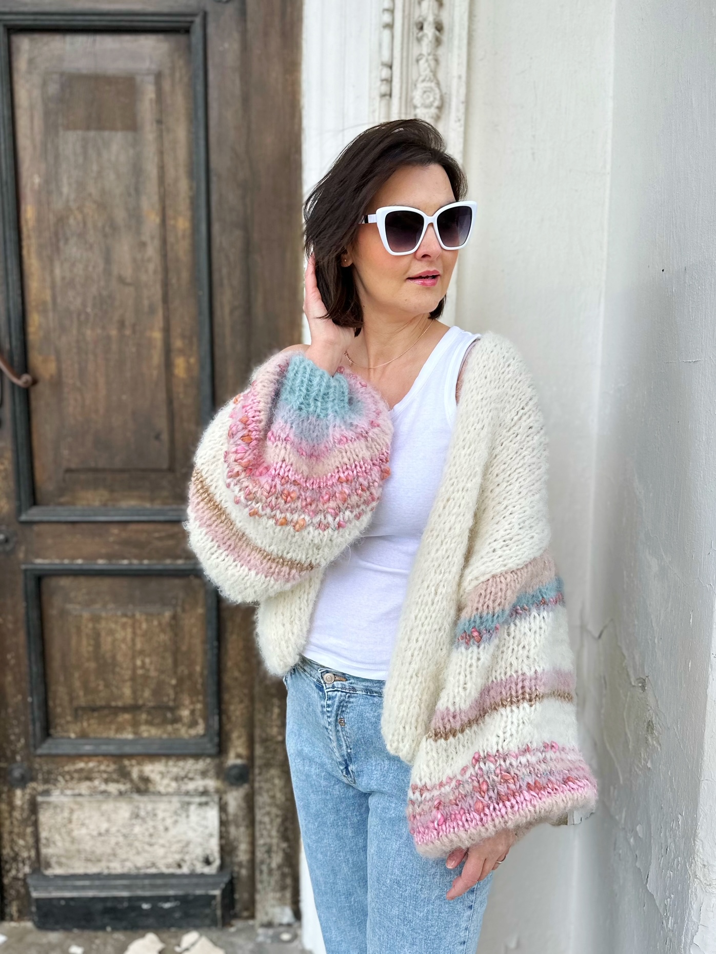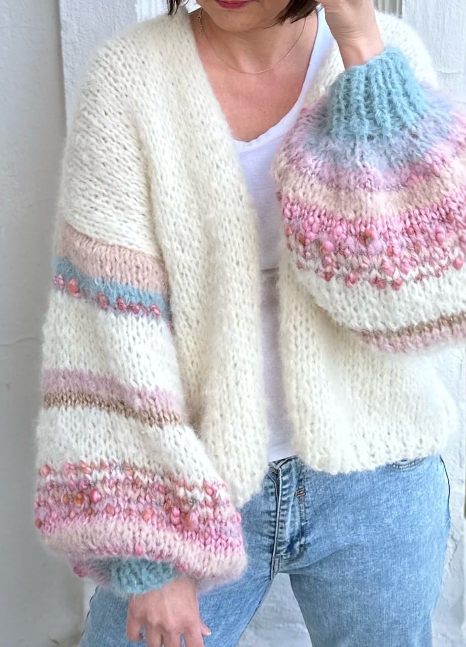 Kardigan White Pearl wykonany z podwójnej nitki (alpaki 71%, wełny 25% , poliamid 4%) włóczki w kolorze złamanej bieli z dodatkiem włóczek fantazyjnych na szerokich, lekko balonowych rękawach, Kardigan idealny na sezon wiosenno letni, do sukienek, szortów i jeansów. Naturalny, efektowny , oryginalny.