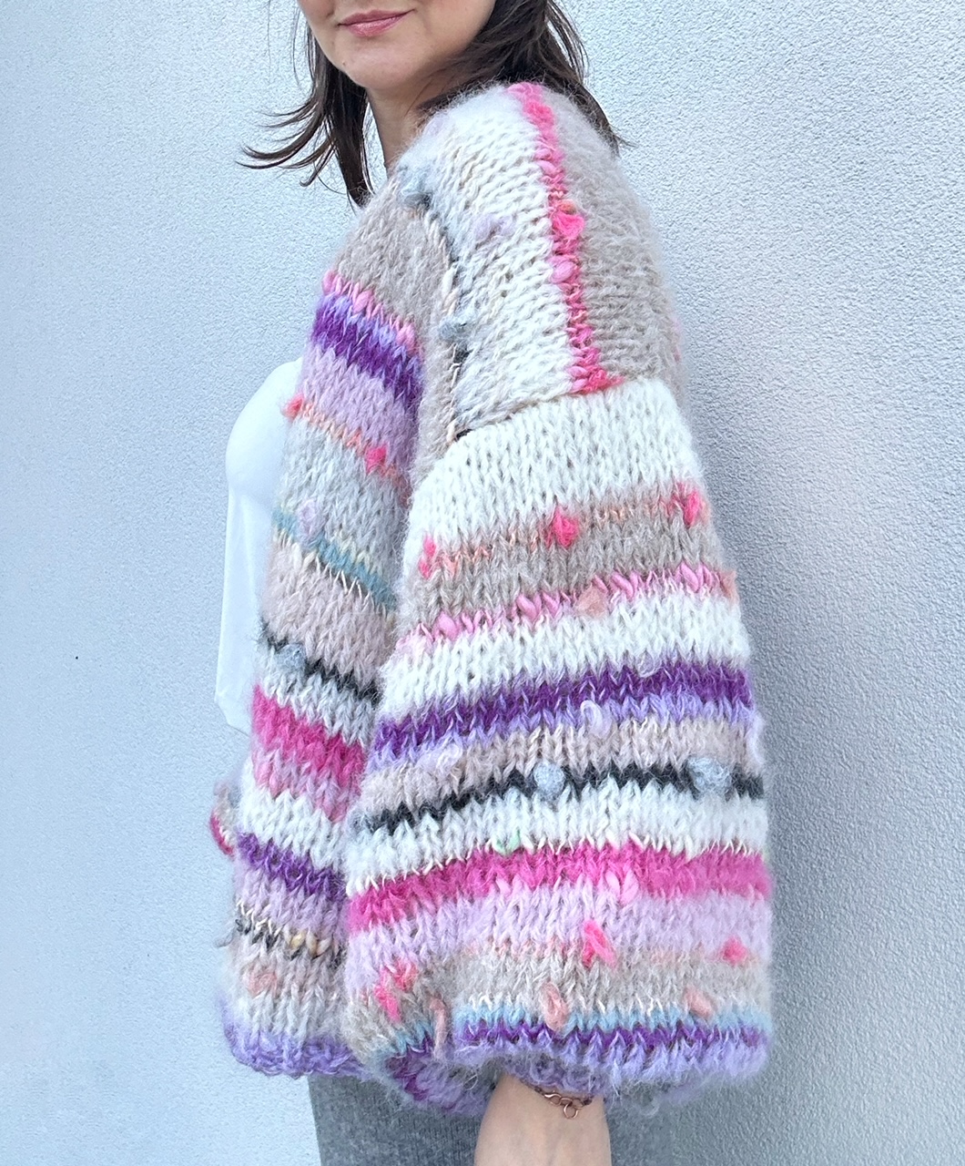 Kardigan Zoe, całoroczny, niezwykle efektowny, kobiecy, delikatny i puszysty kardigan spleciony ręcznie w przeważającej większości z naturalnych przędz, ozdobiony efektownymi włóczkami fantazyjnymi.