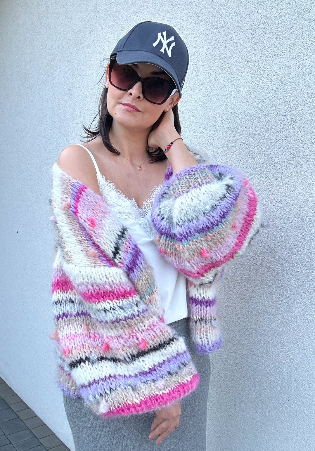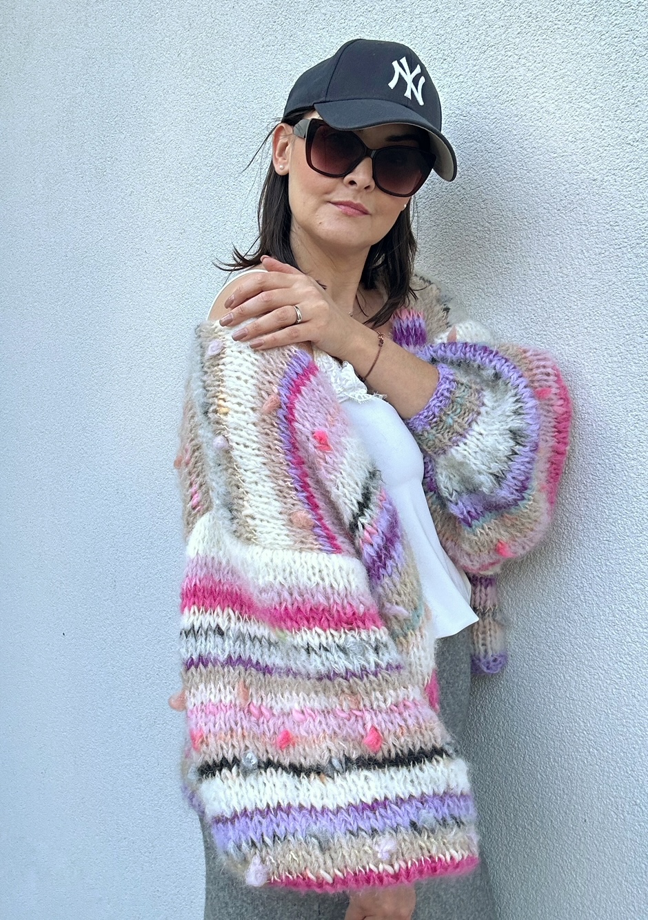 Kardigan Zoe wersja z różem i fioletem NA ZAMÓWIENIE długość 60 cm