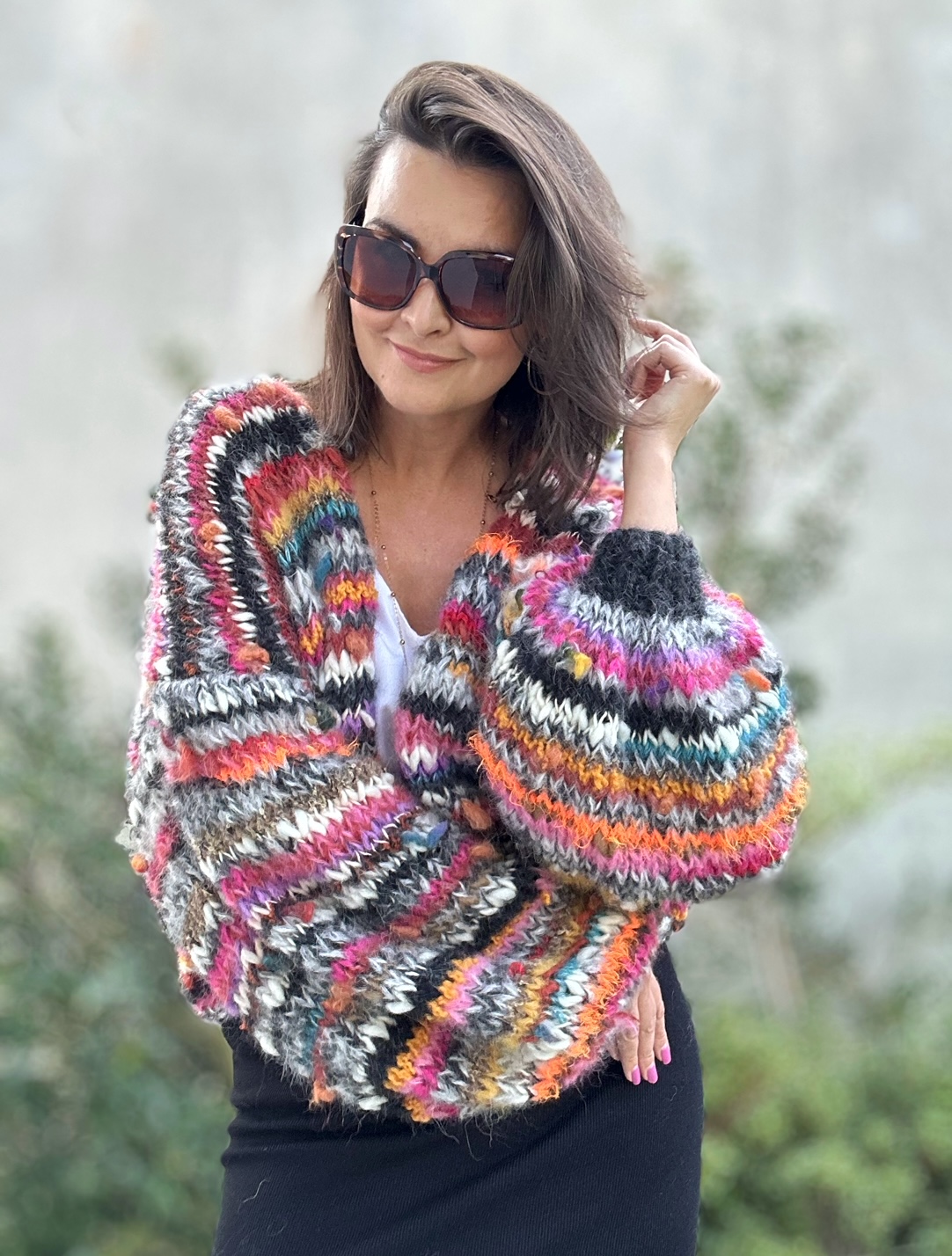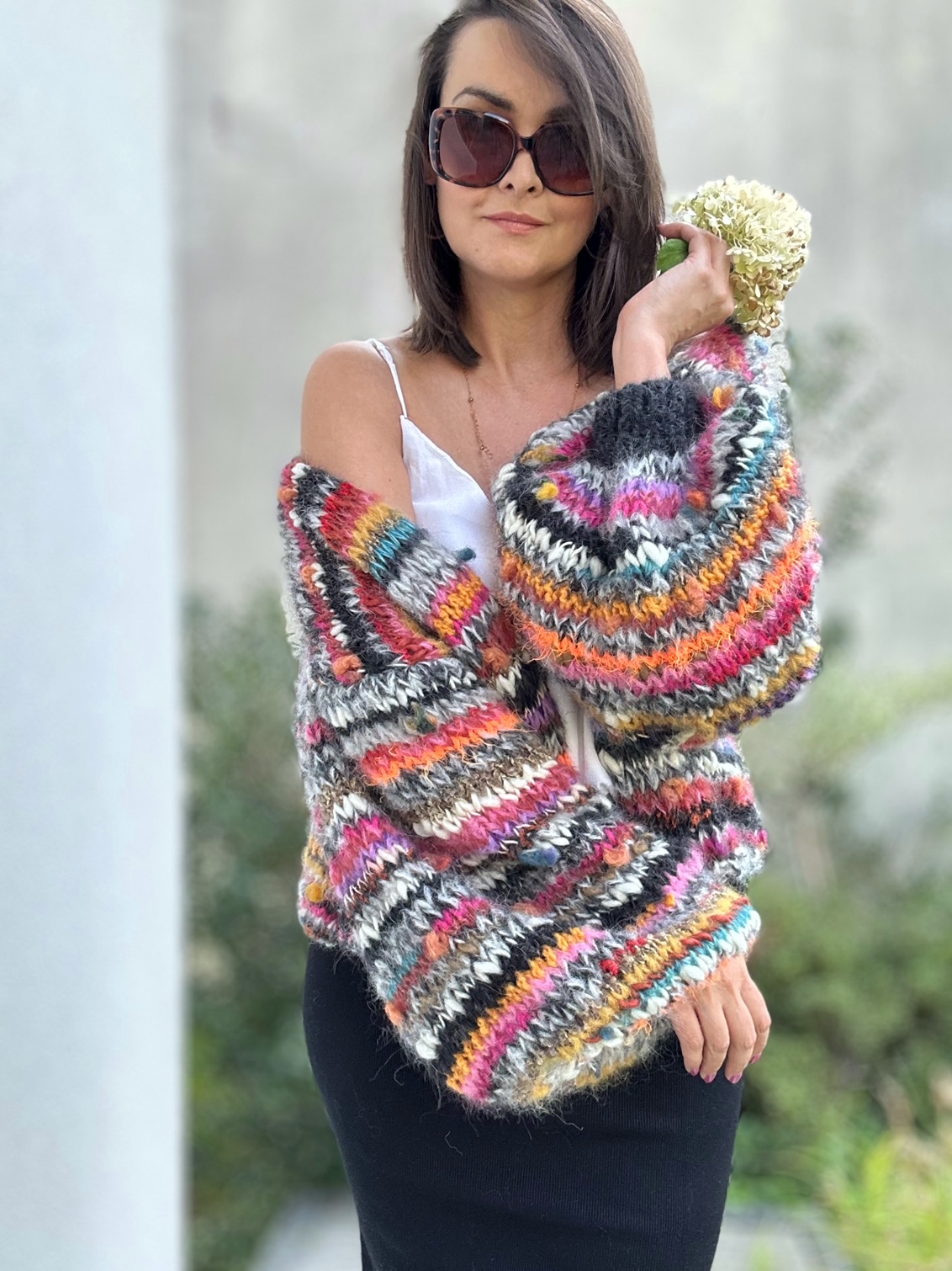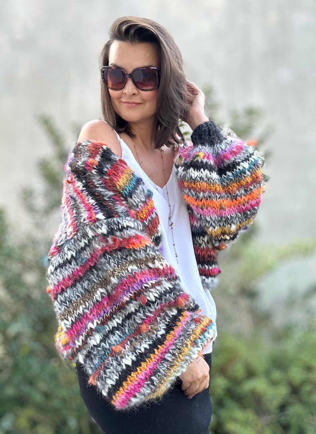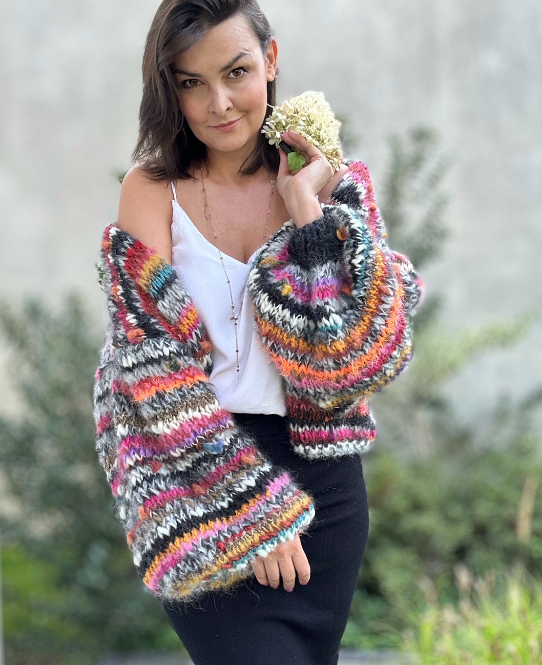 Kardigan Zoya to energetyczne połączenie włóczek: alpaki, merino, jedwabiu , moheru z minimalną domieszką akrylu. Bazą jest czerń i biel , pomiędzy którymi wpleciona jest szarości inne kolory z przewagą brązu, burgundu, musztardy. W kardiganie użyte zostały włóczki fantazyjne, które dodają mu oryginalności i sprawiają, że przykuwa wzrok. Również dzięki efektownym, szerokim rękawom.  Kardigan jest  puszysty i cudownie  miękki.
