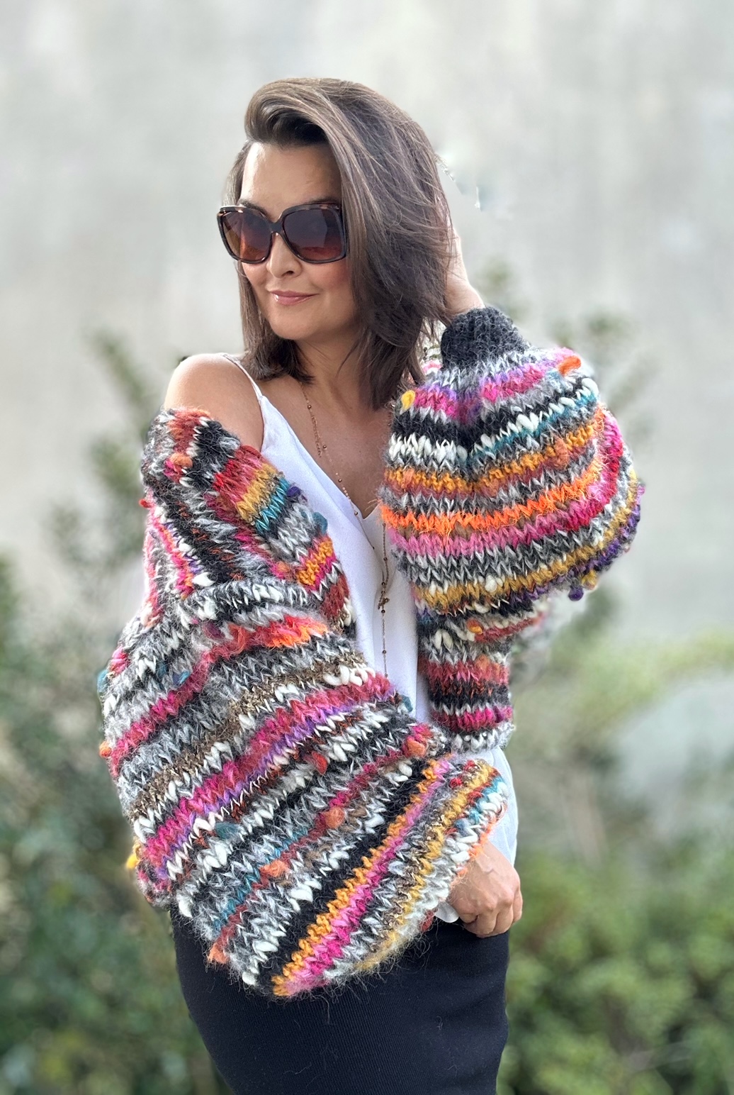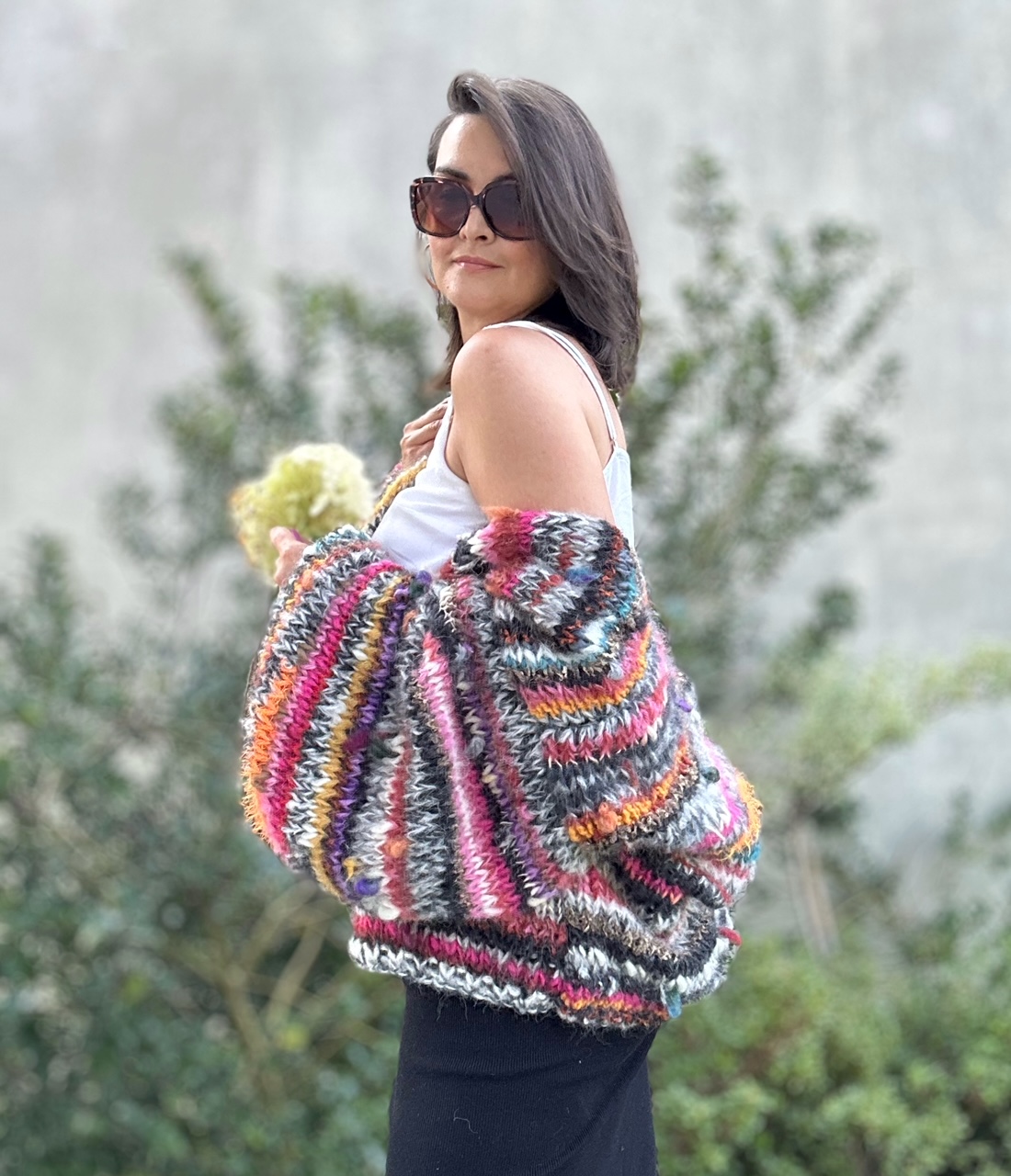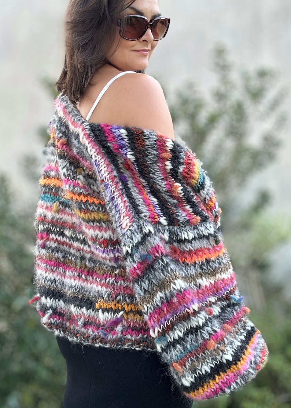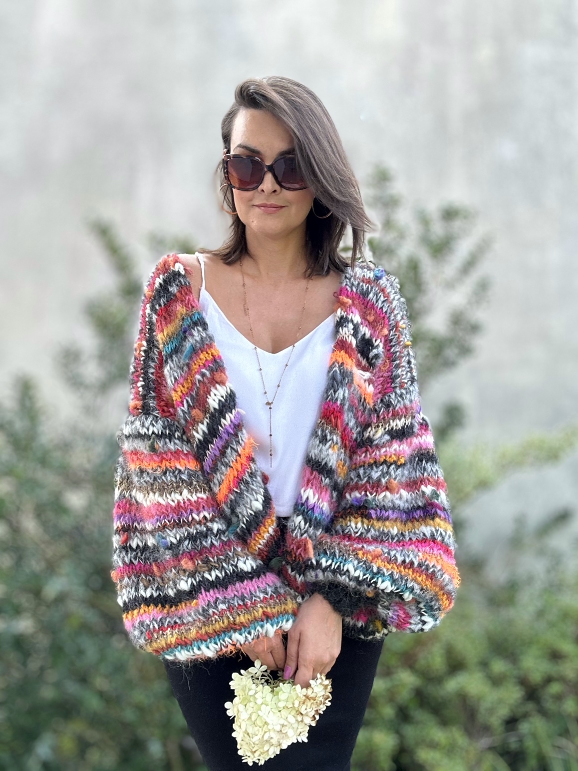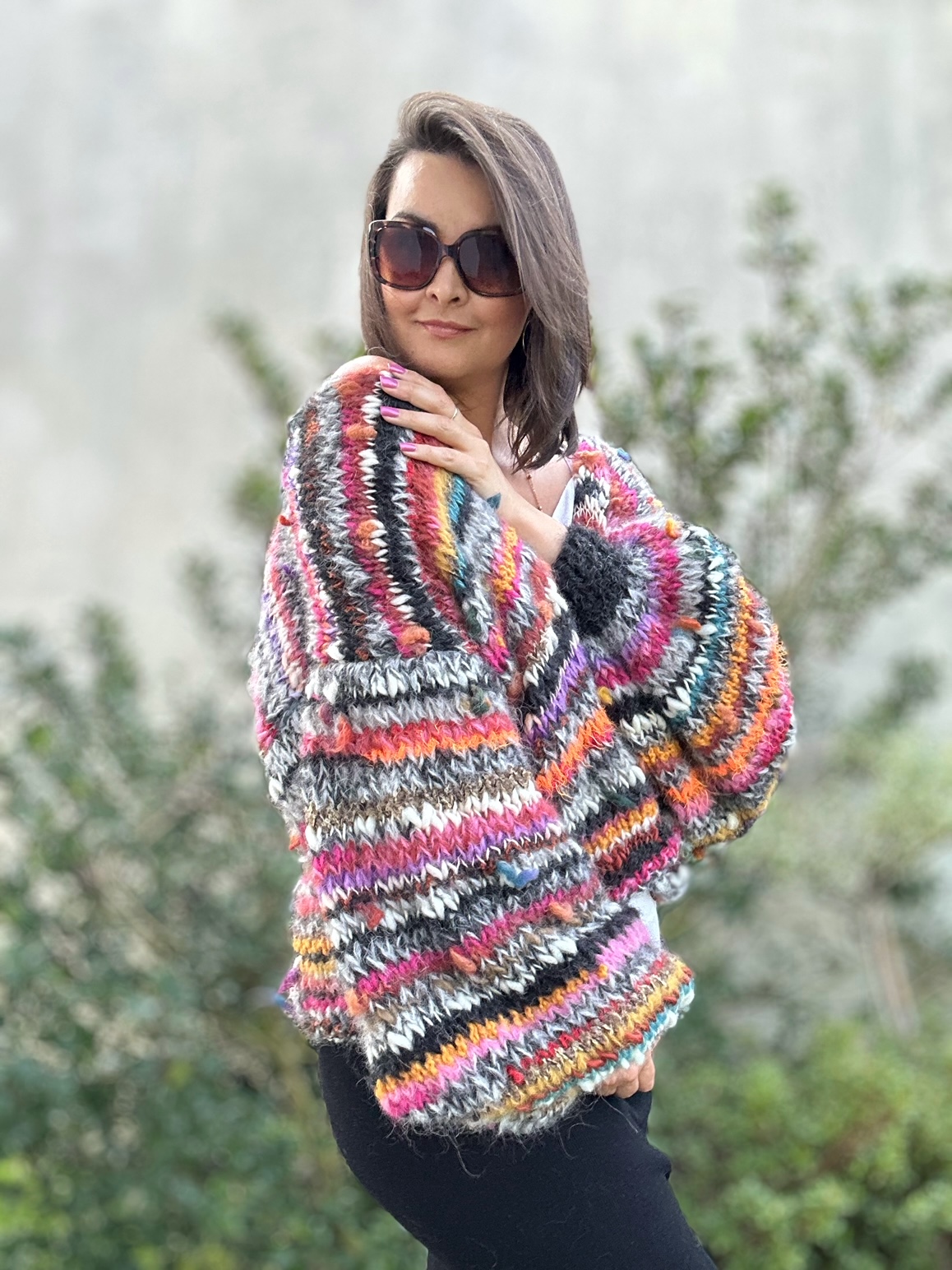 Kardigan Zoya to energetyczne połączenie włóczek: alpaki, merino, jedwabiu , moheru z minimalną domieszką akrylu. Bazą jest czerń i biel , pomiędzy którymi wpleciona jest szarości inne kolory z przewagą brązu, burgundu, musztardy. W kardiganie użyte zostały włóczki fantazyjne, które dodają mu oryginalności i sprawiają, że przykuwa wzrok. Również dzięki efektownym, szerokim rękawom.  Kardigan jest  puszysty i cudownie  miękki.